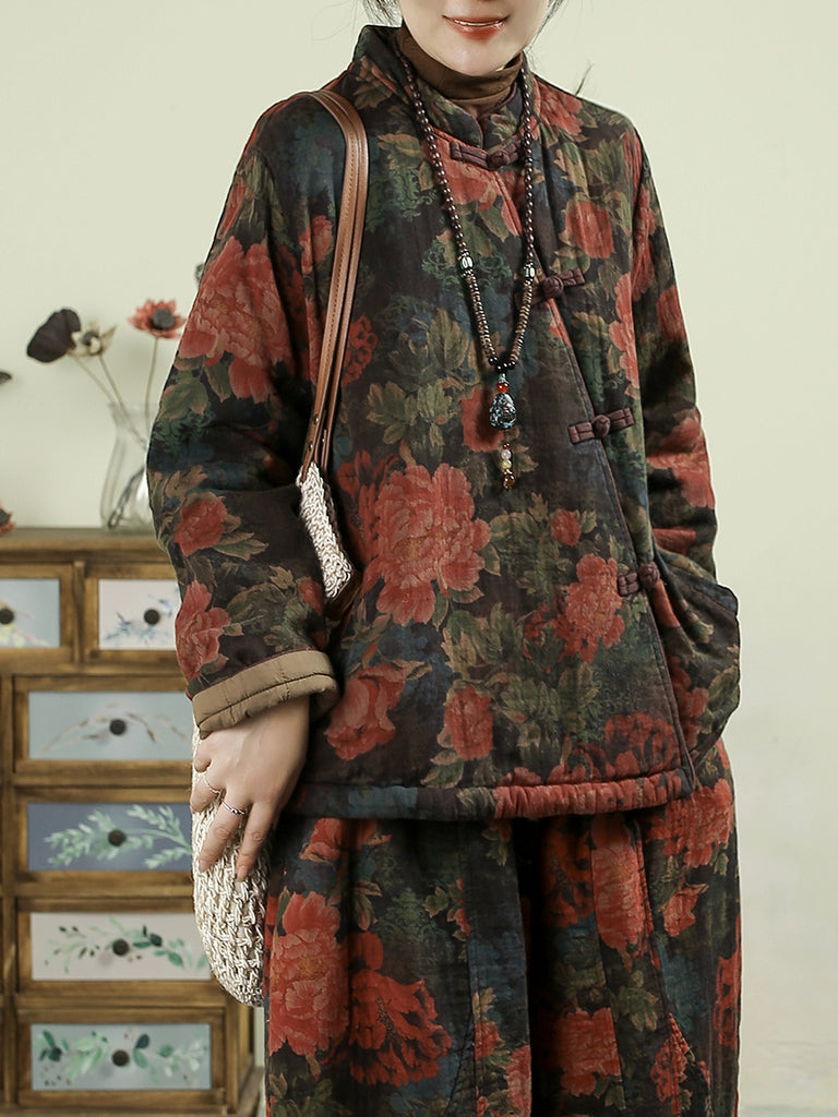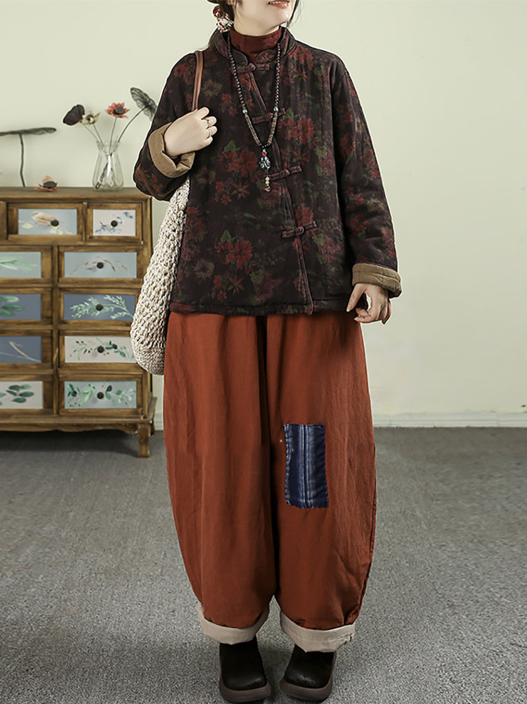 Abrigo de algodón con cuello alto y flores étnicas de otoño para mujer