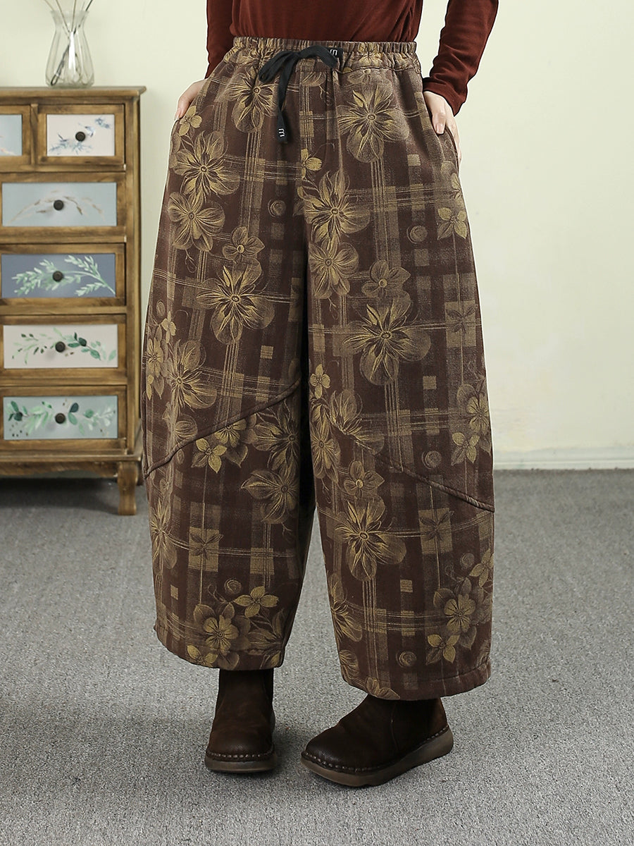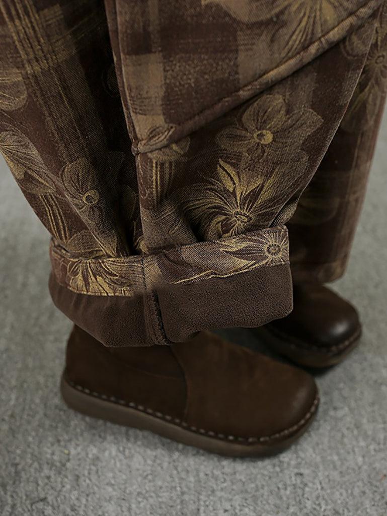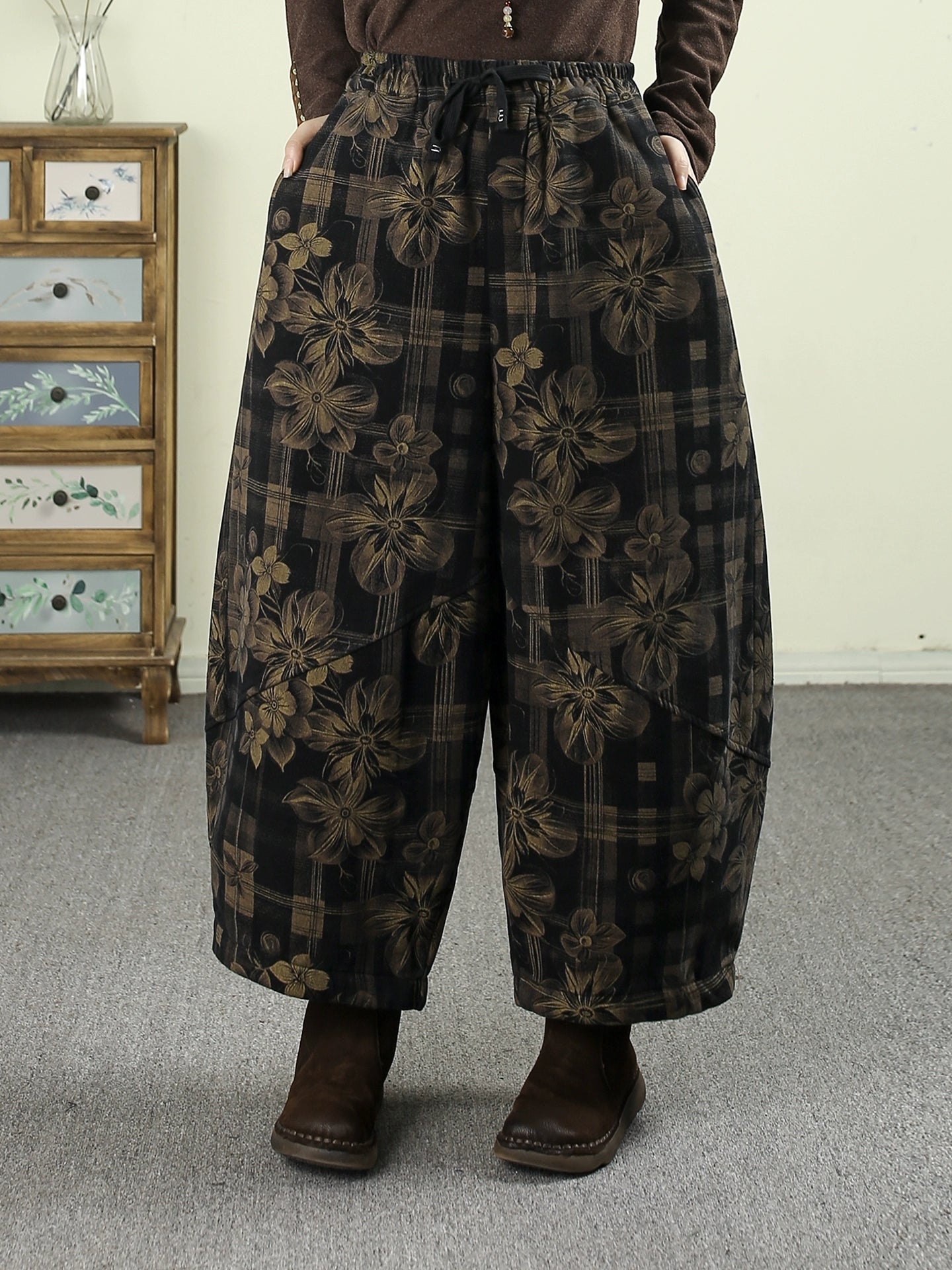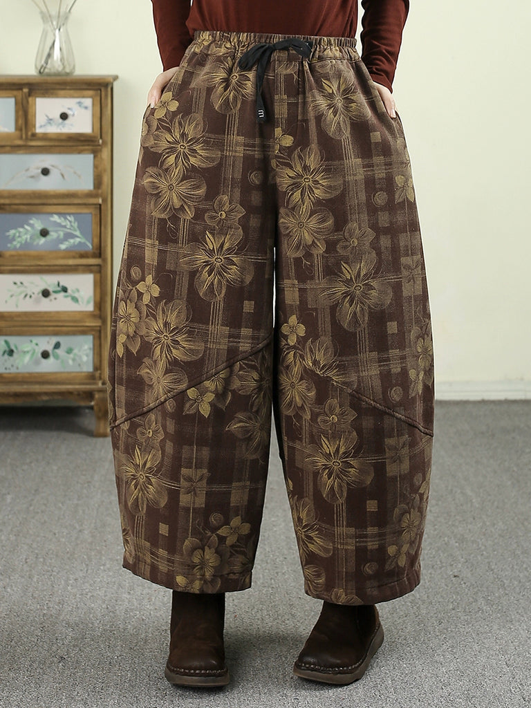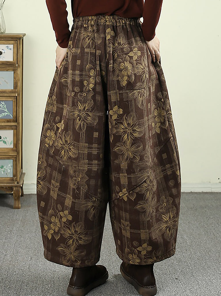 Pantalones tipo harem de algodón con forro polar y estampado floral vintage para mujer (invierno)