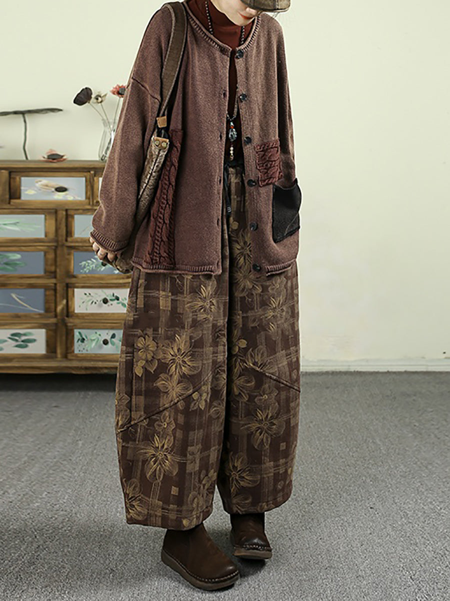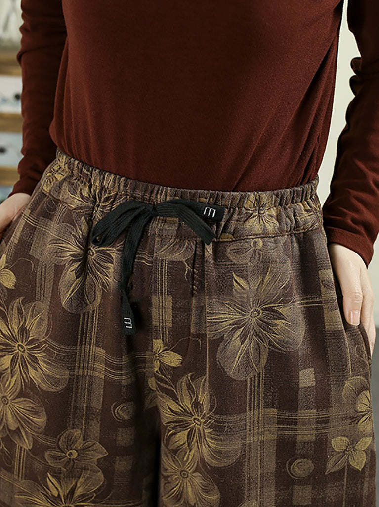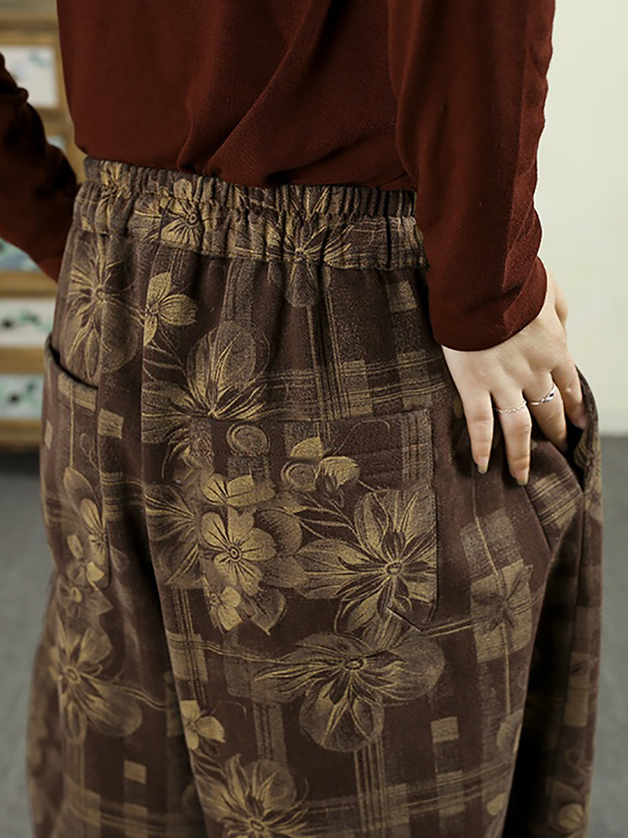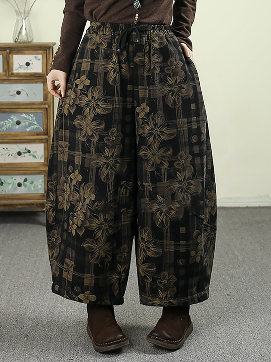 Pantalones tipo harem de algodón con forro polar y estampado floral vintage para mujer (invierno)