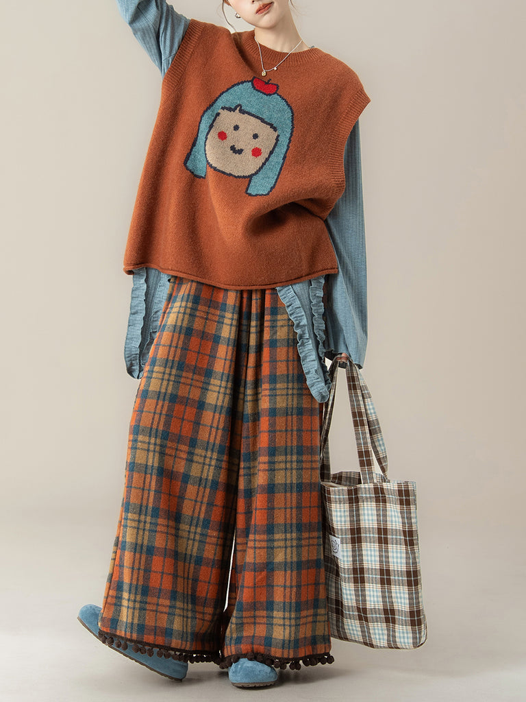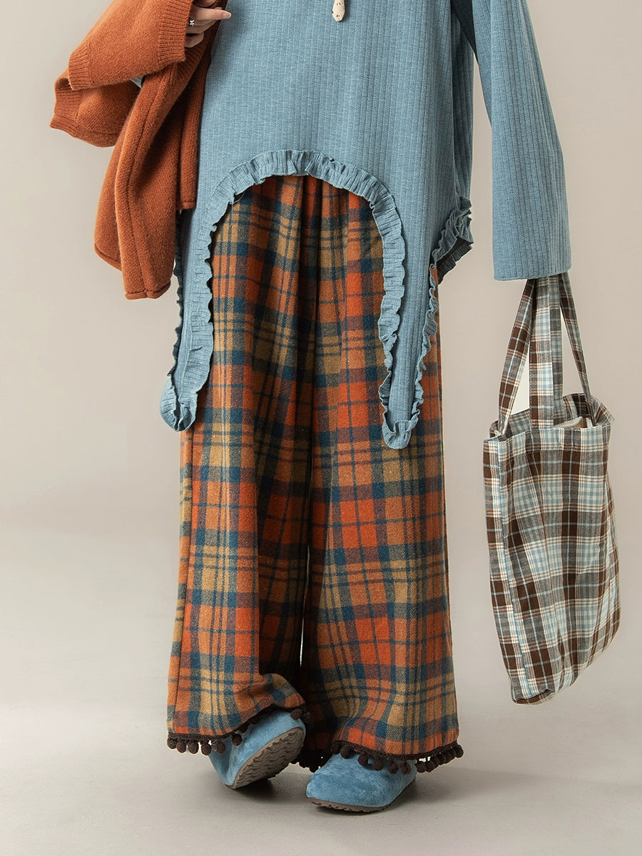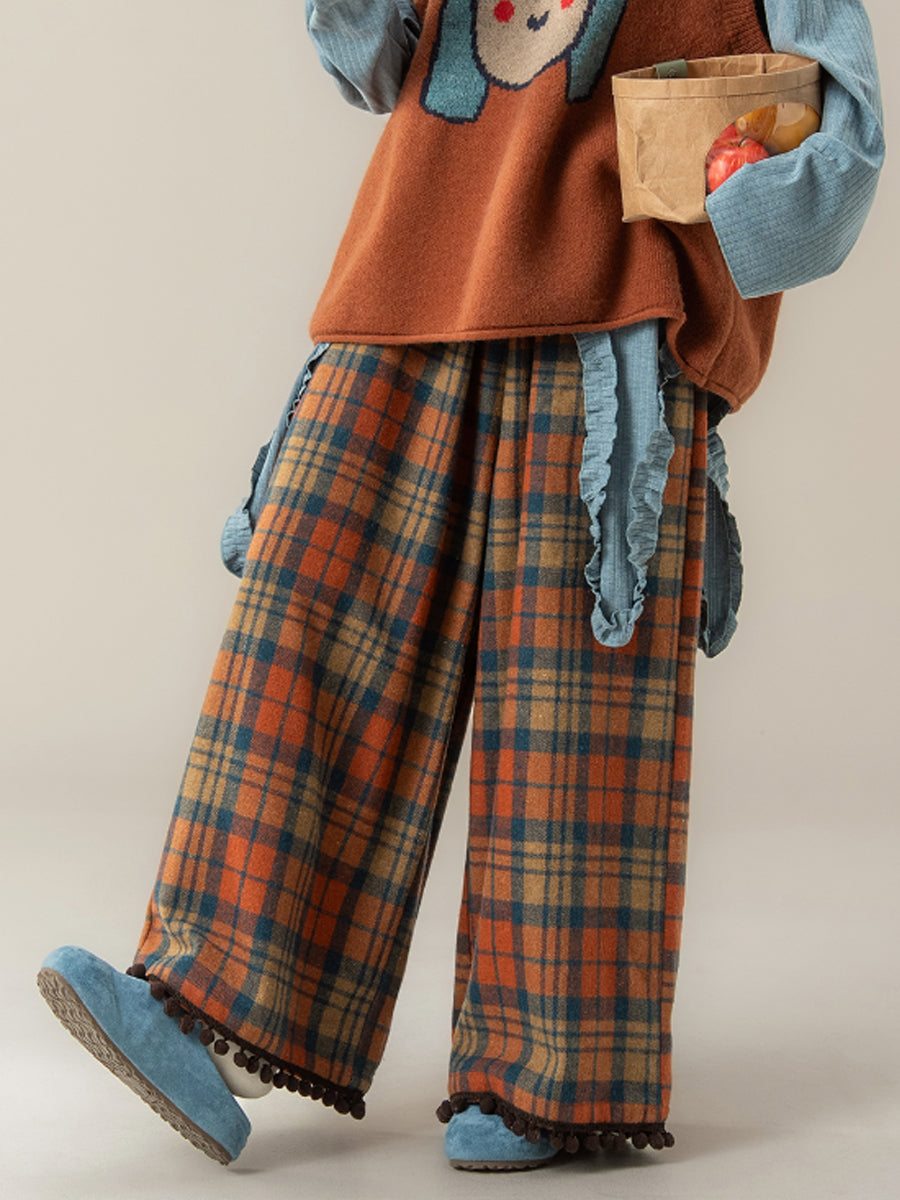Pantalones de invierno vintage para mujer, de cuadros, con dobladillo de borlas y pernera ancha.