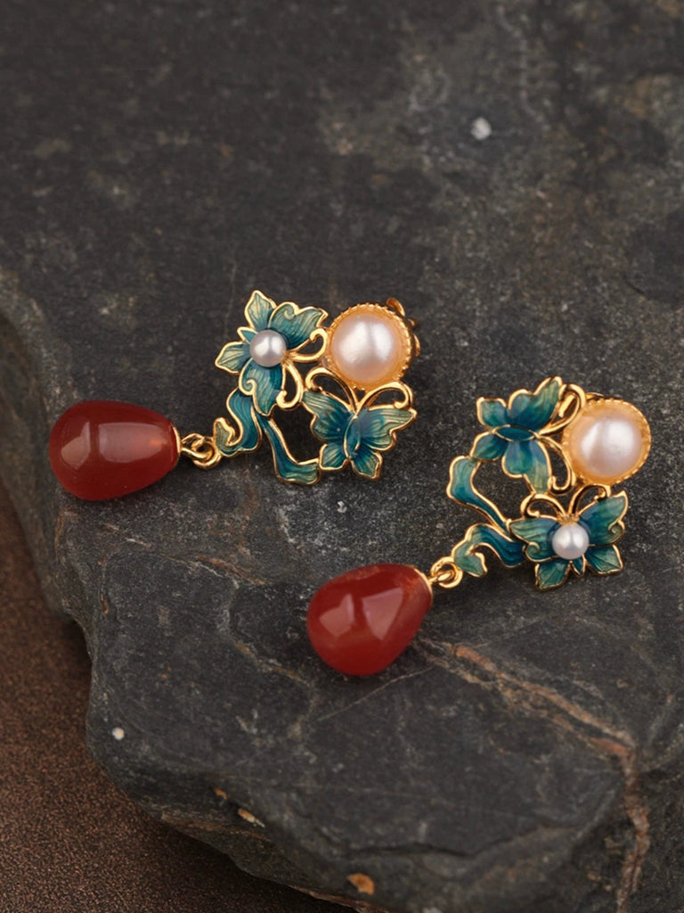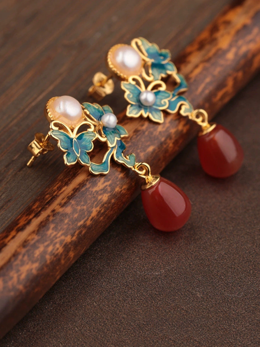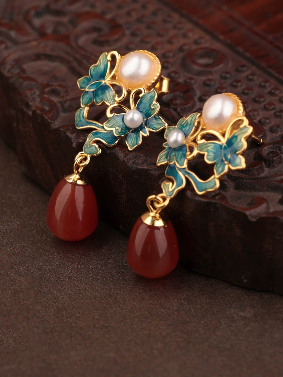 Pendientes étnicos de mariposa esmaltada para mujer, plata S925, perla y ágata