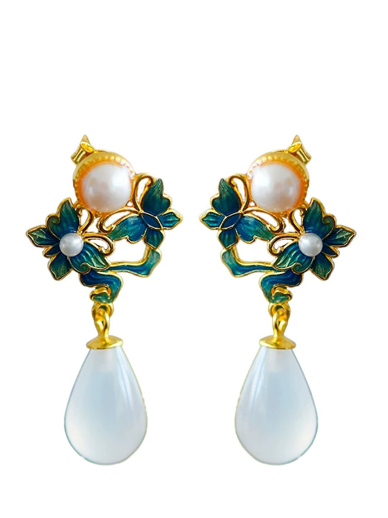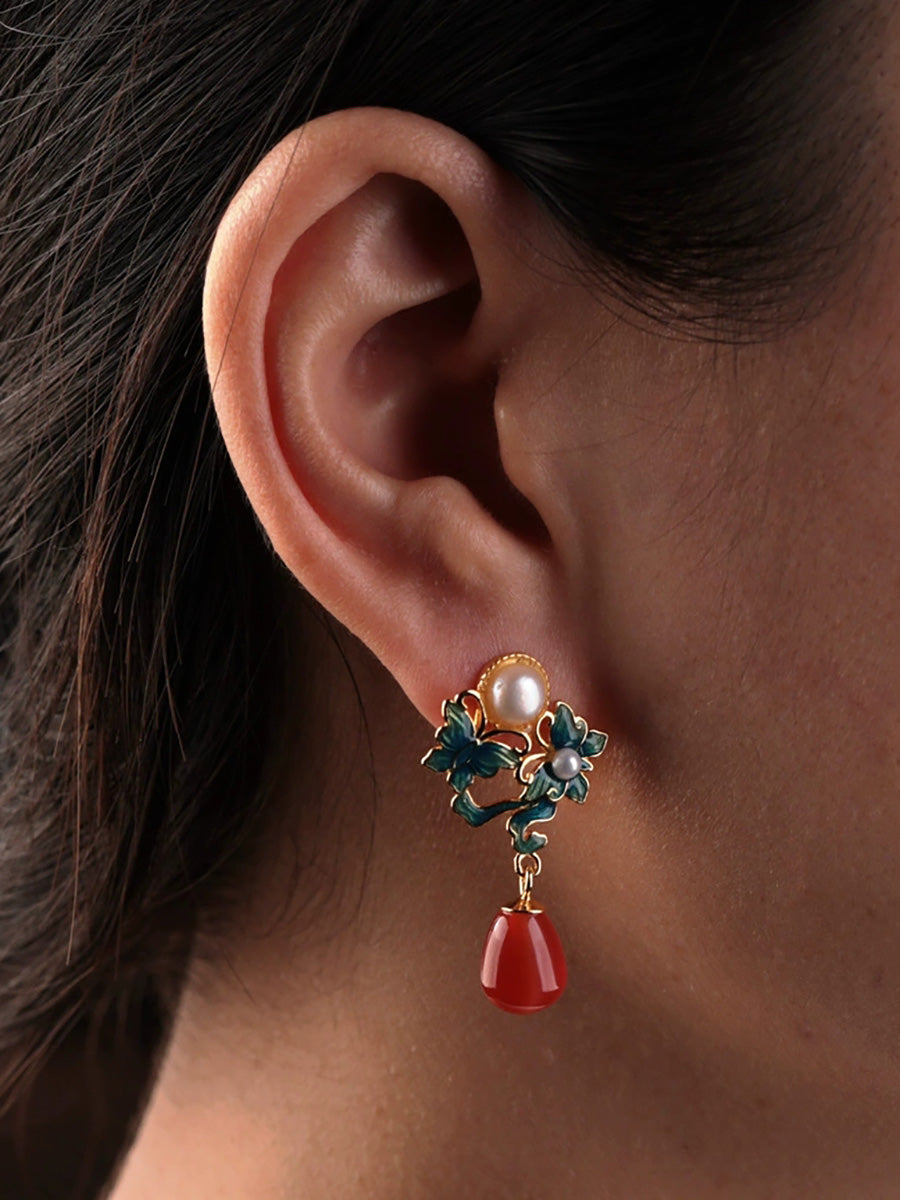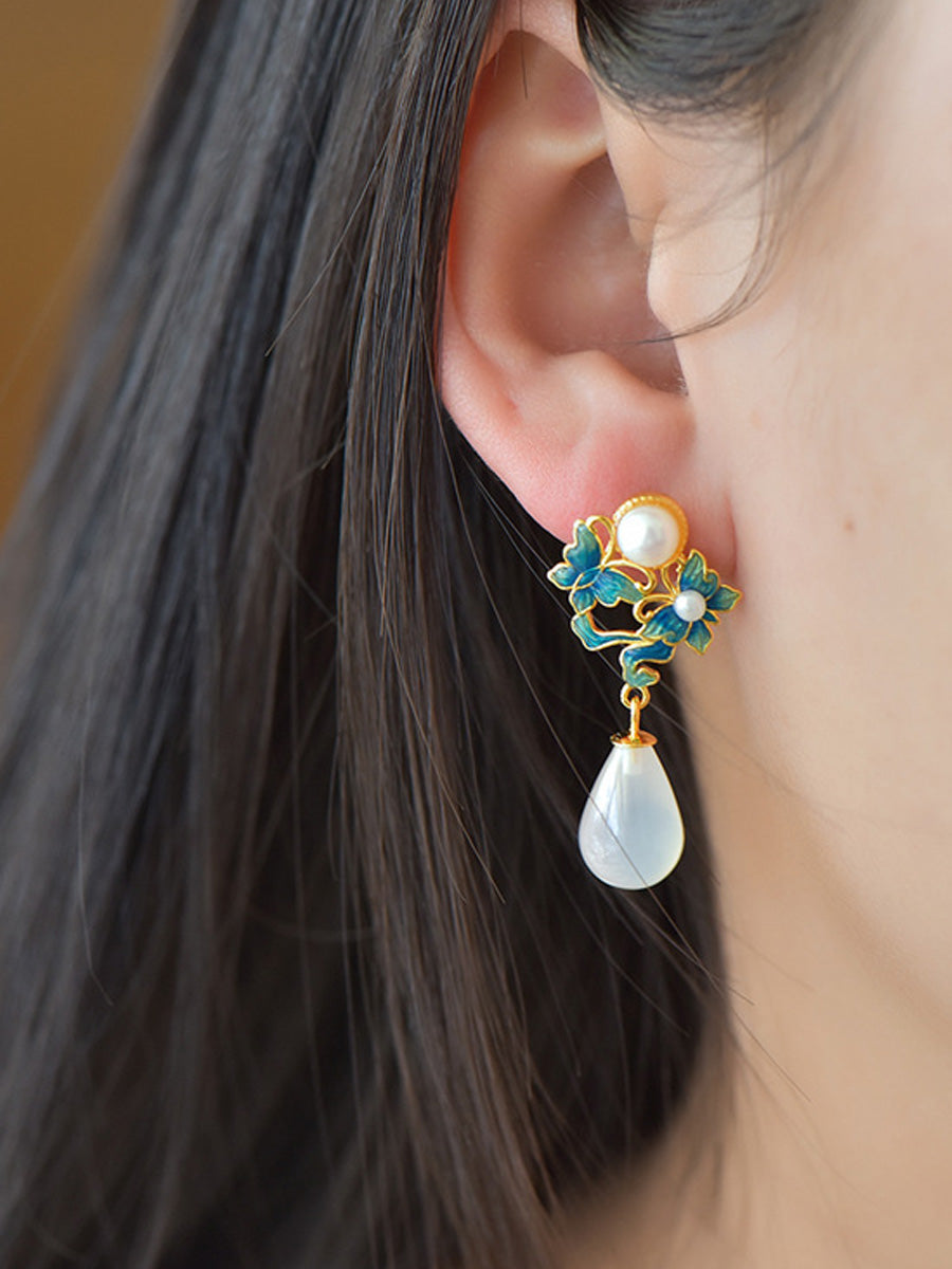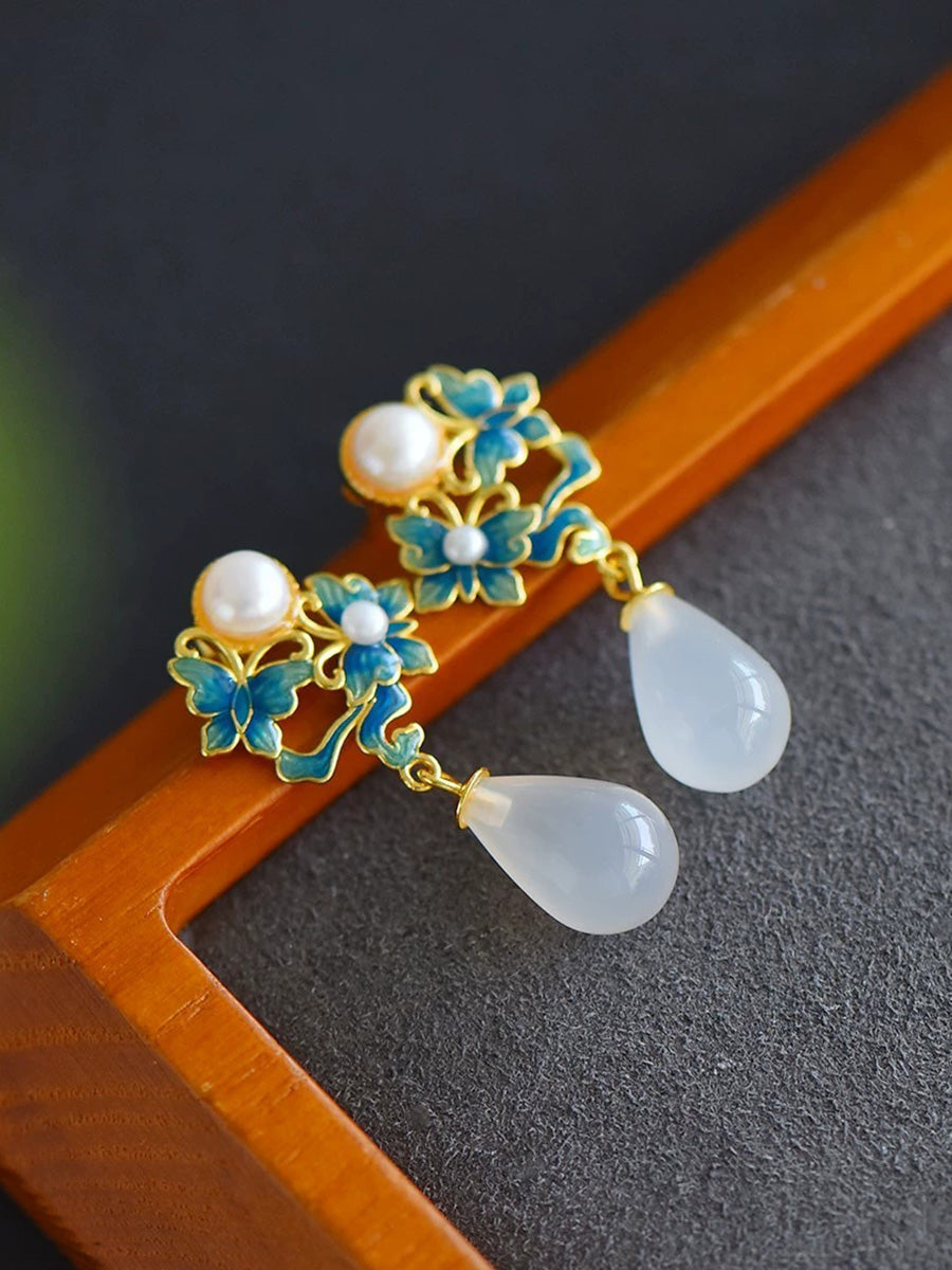 Pendientes étnicos de mariposa esmaltada para mujer, plata S925, perla y ágata