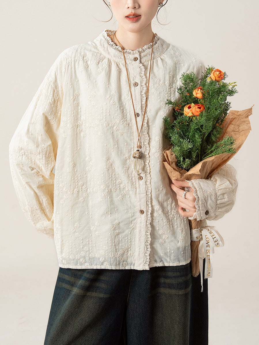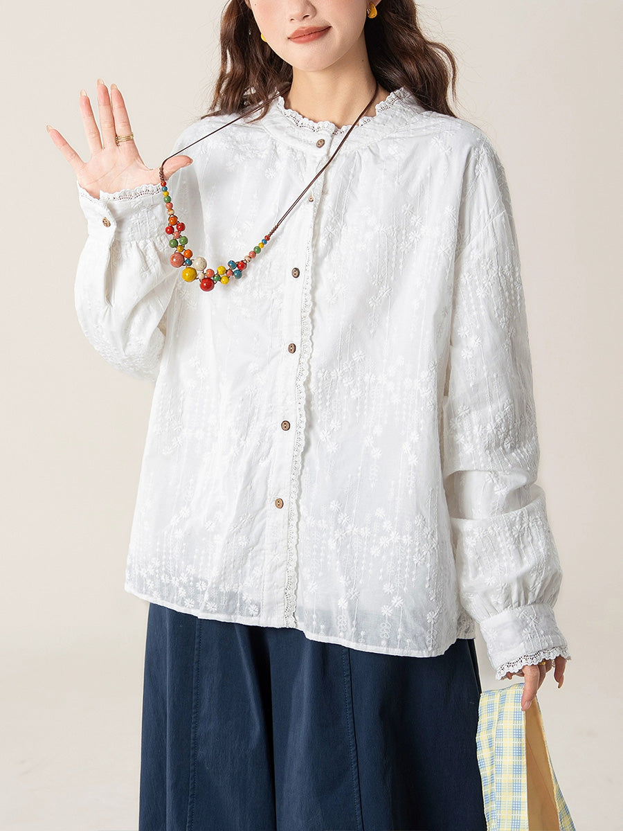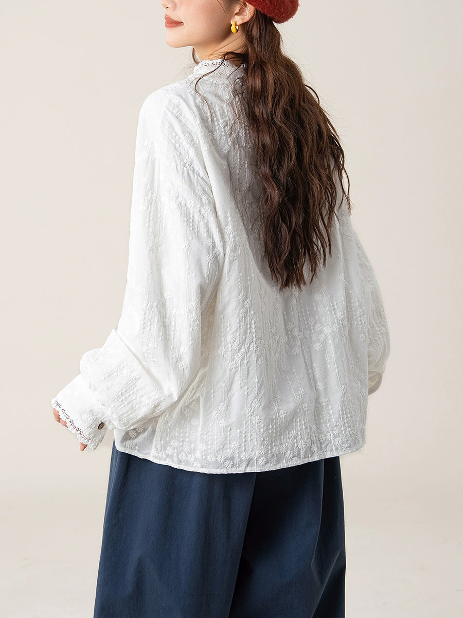 Camisa de cuello alto con bordado artístico de otoño para mujer