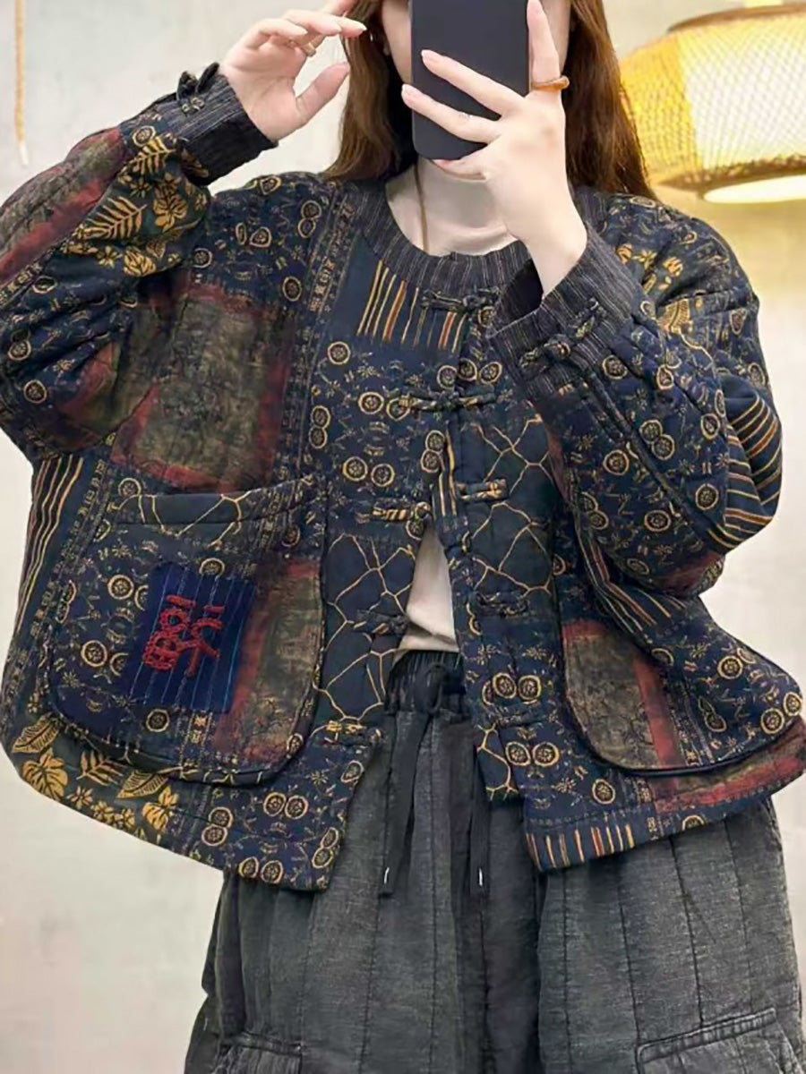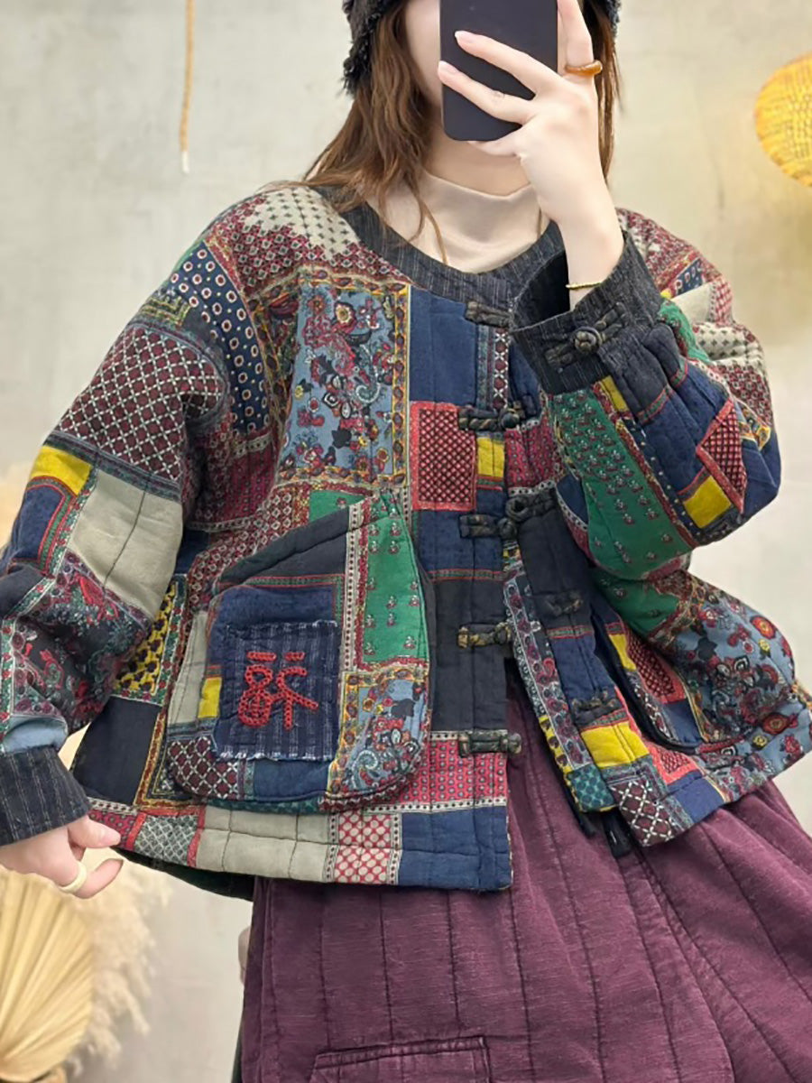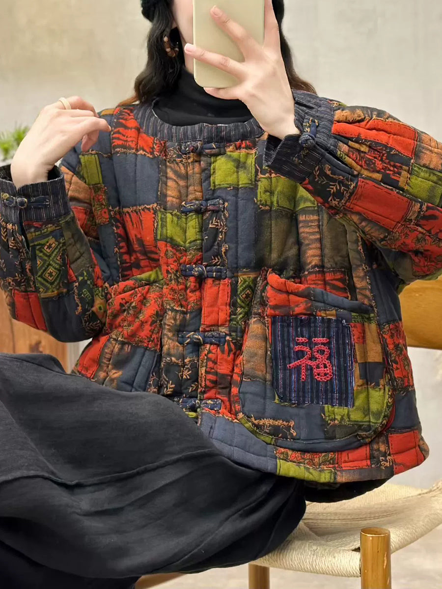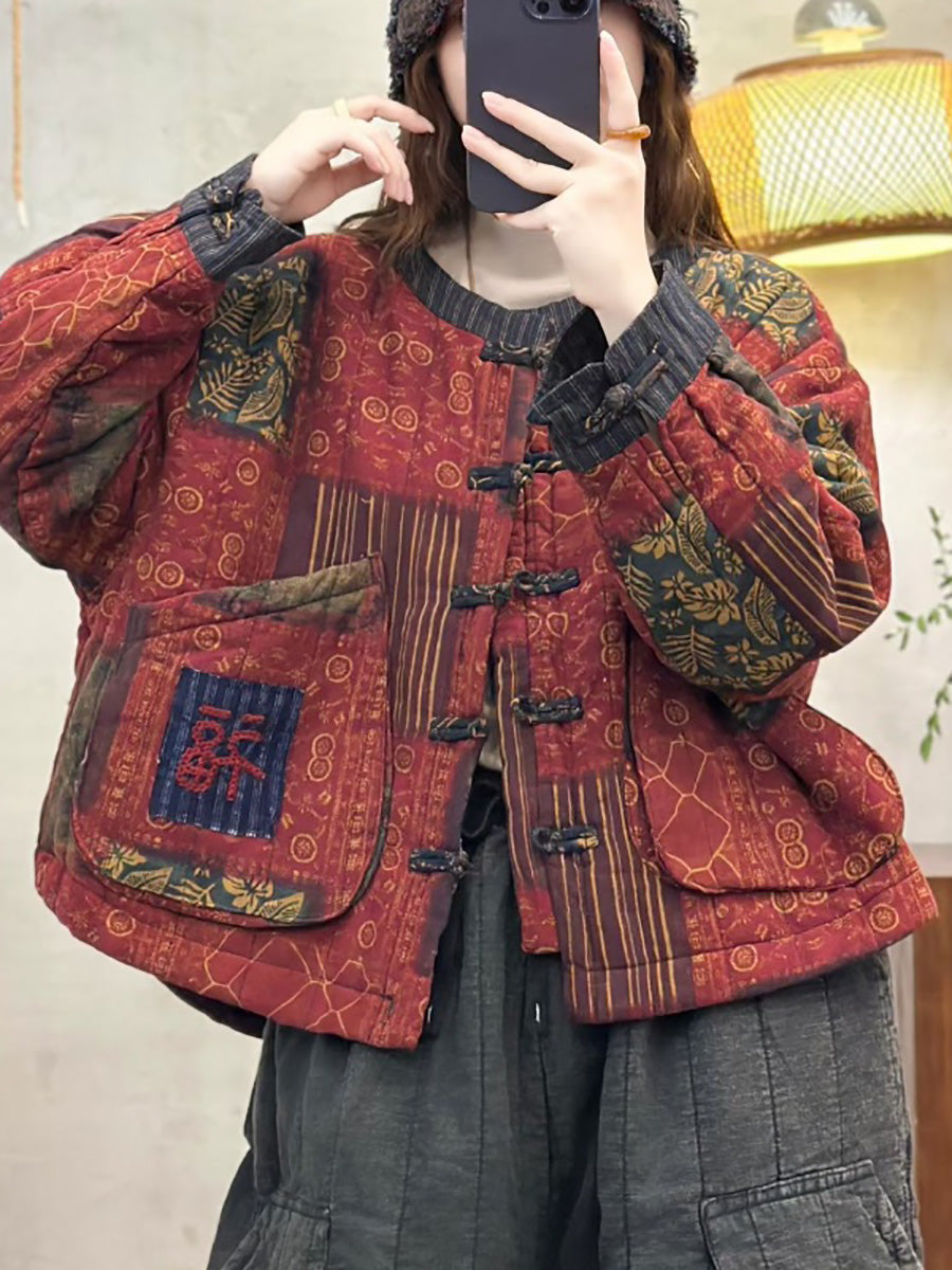 Abrigo acolchado de cuello redondo con parche retro de invierno para mujer