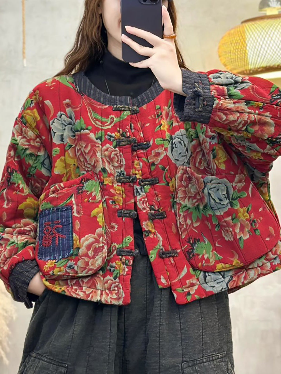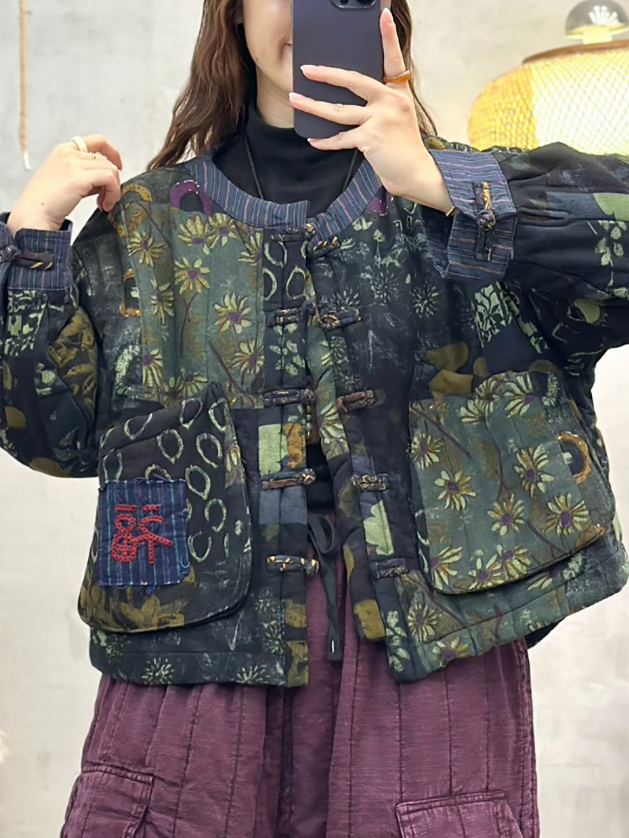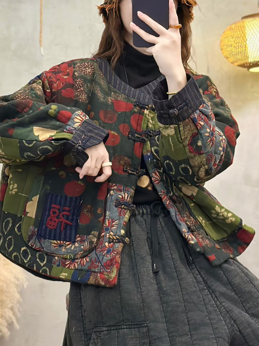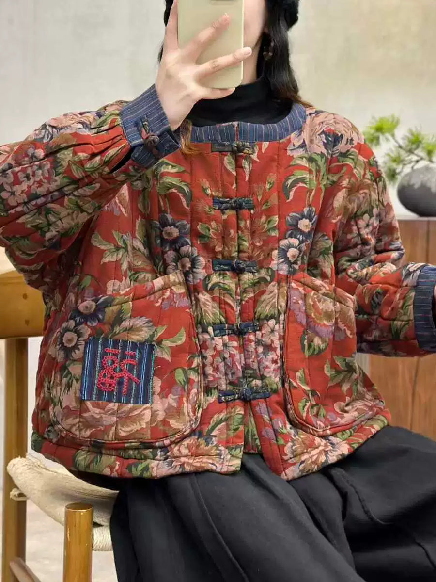 Abrigo acolchado de cuello redondo con parche retro de invierno para mujer
