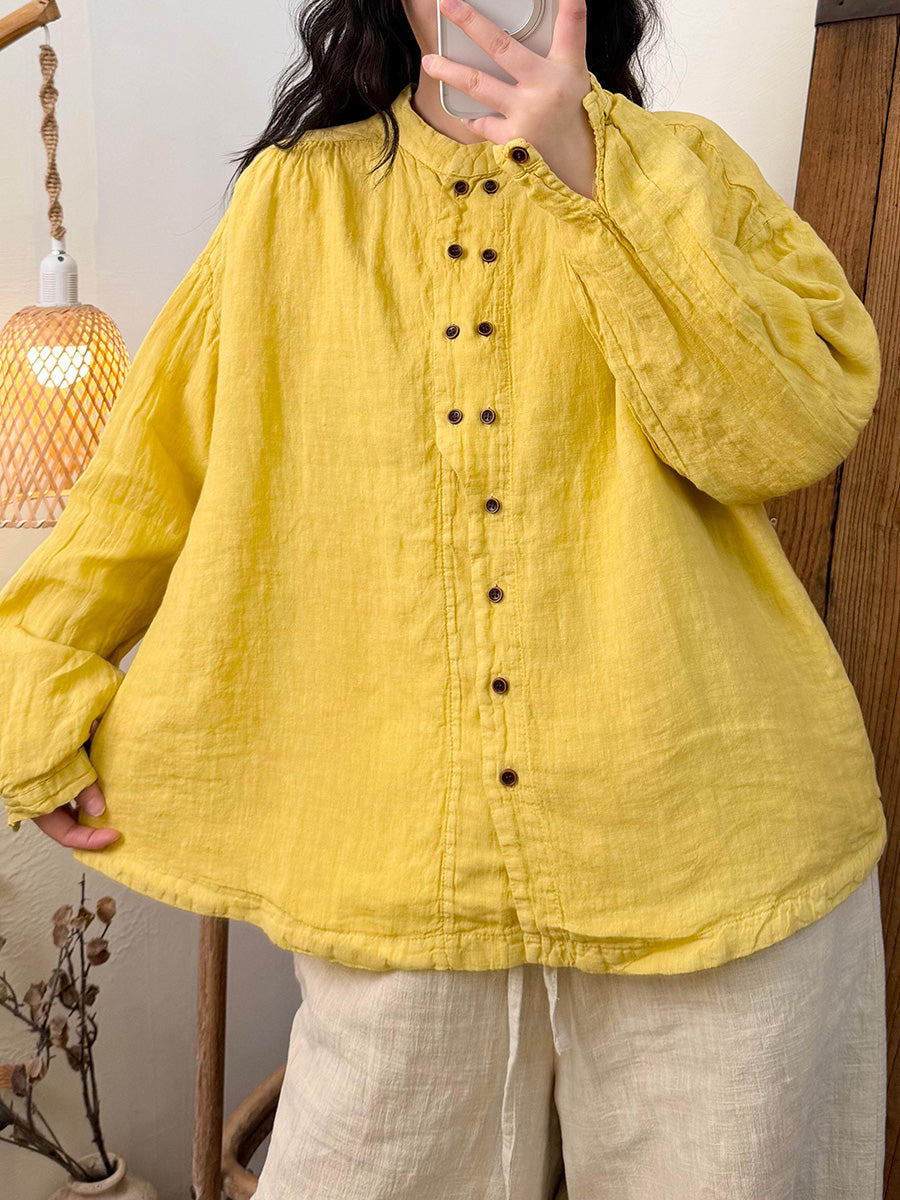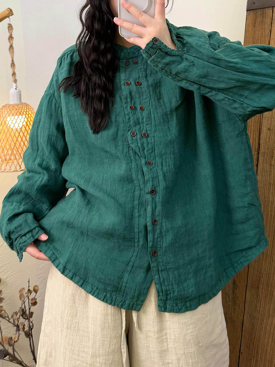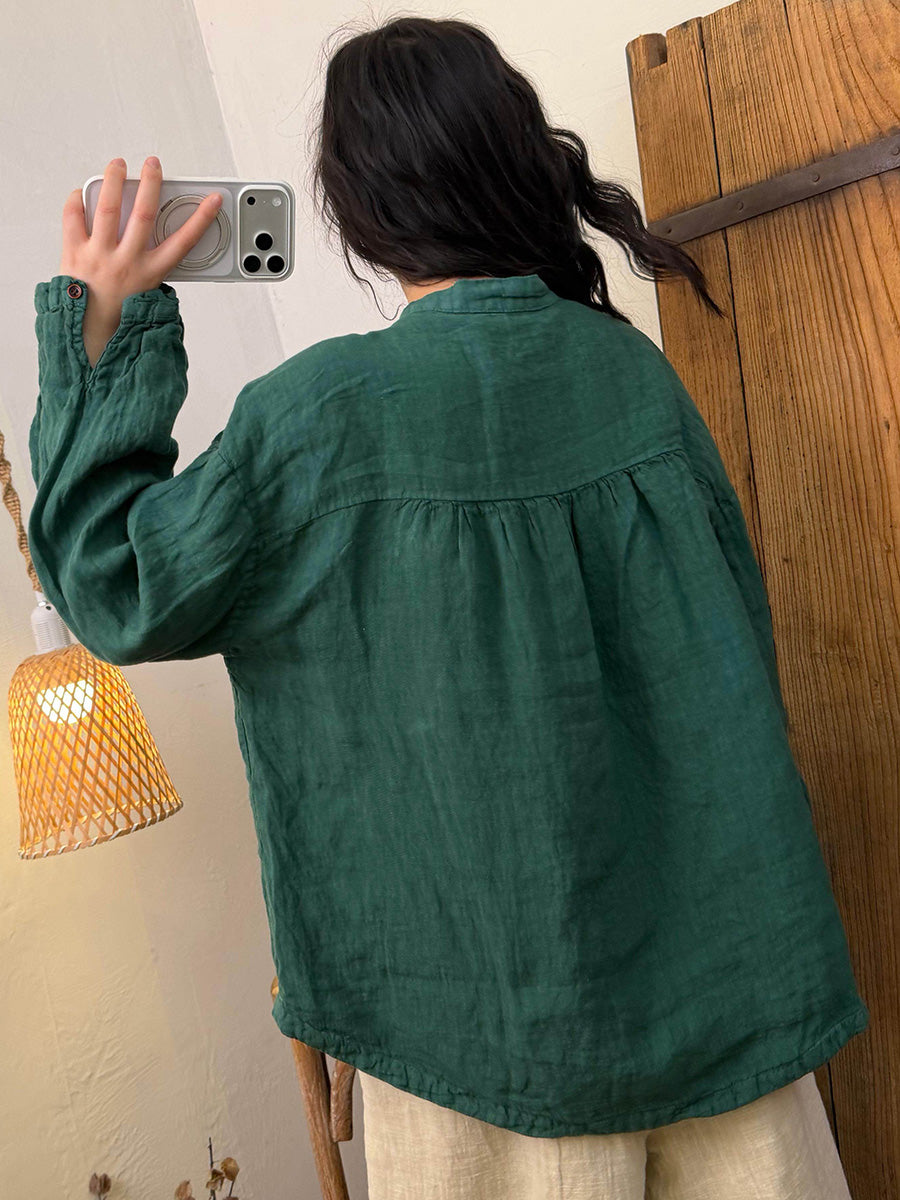 Camisa de lino con cuello alto de color puro retro de otoño para mujer