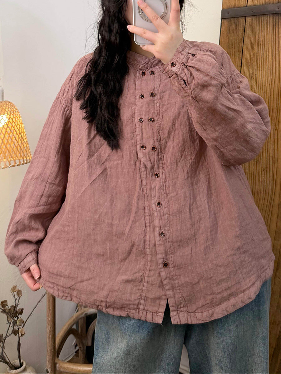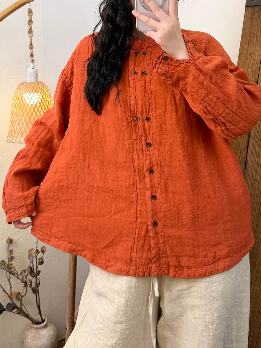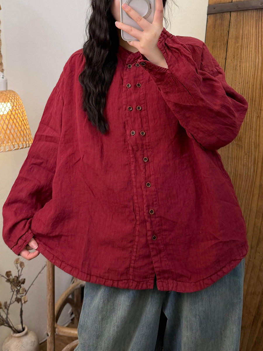 Camisa de lino con cuello alto de color puro retro de otoño para mujer