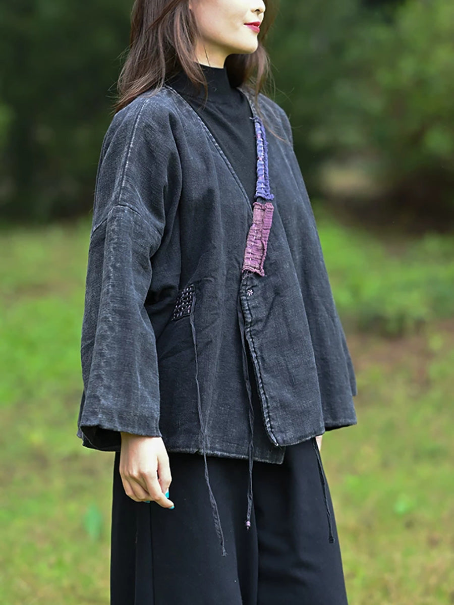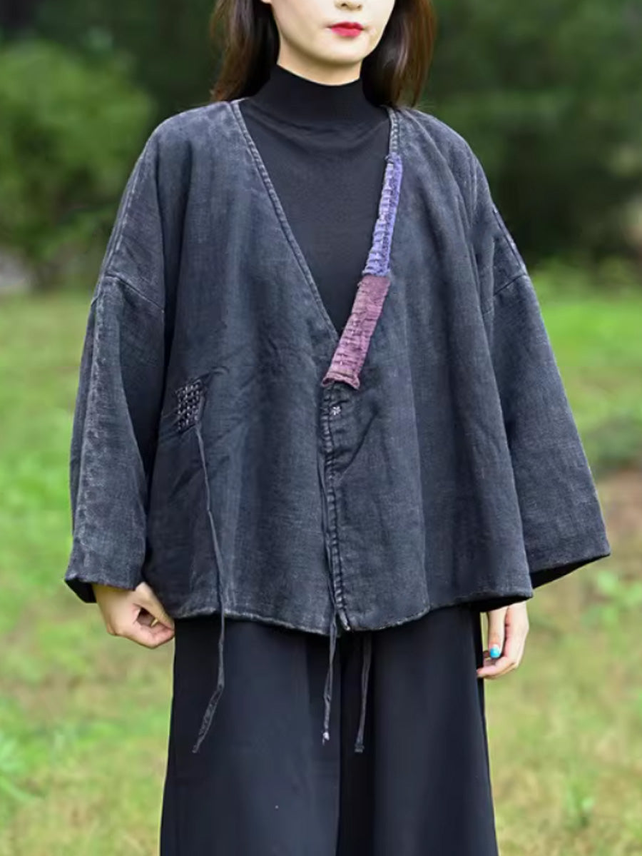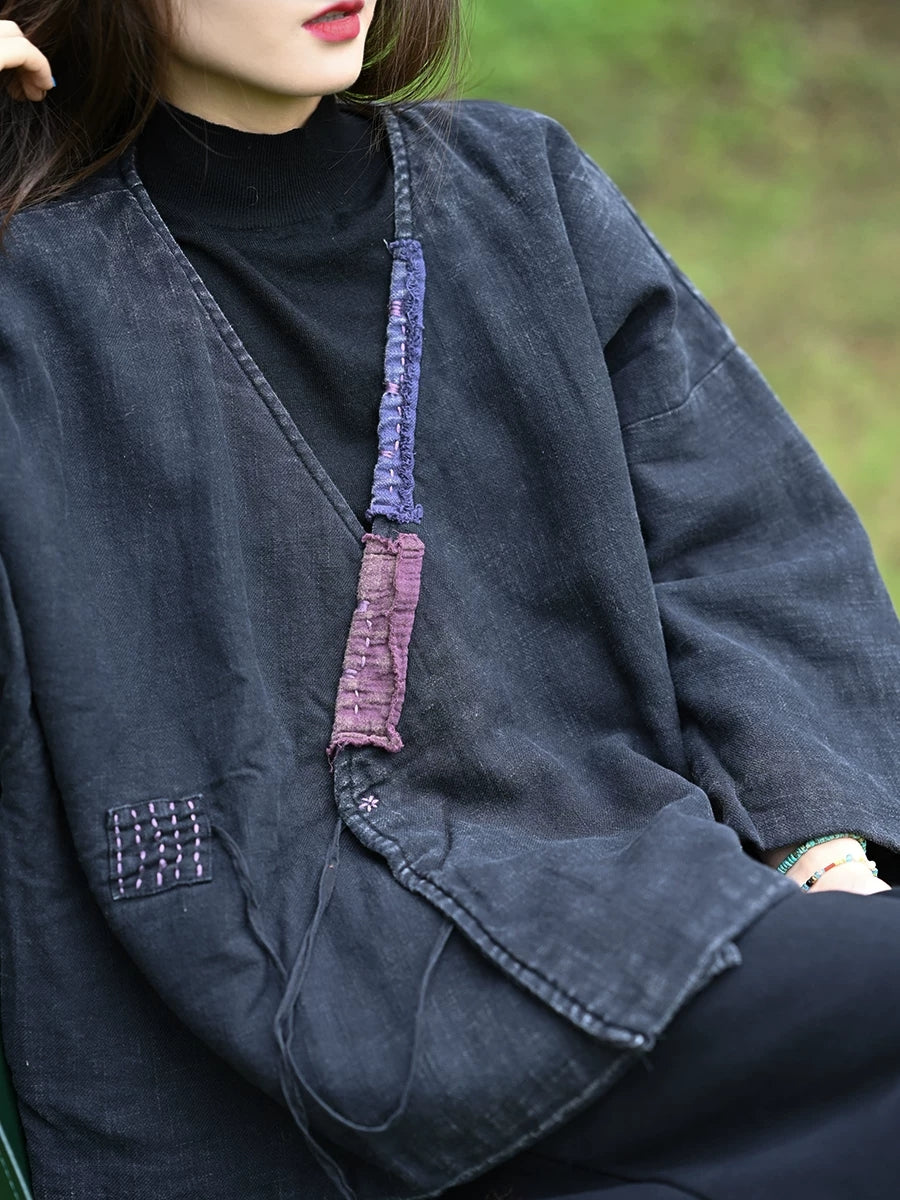 Abrigo retro de invierno con cuello en V y patchwork para mujer