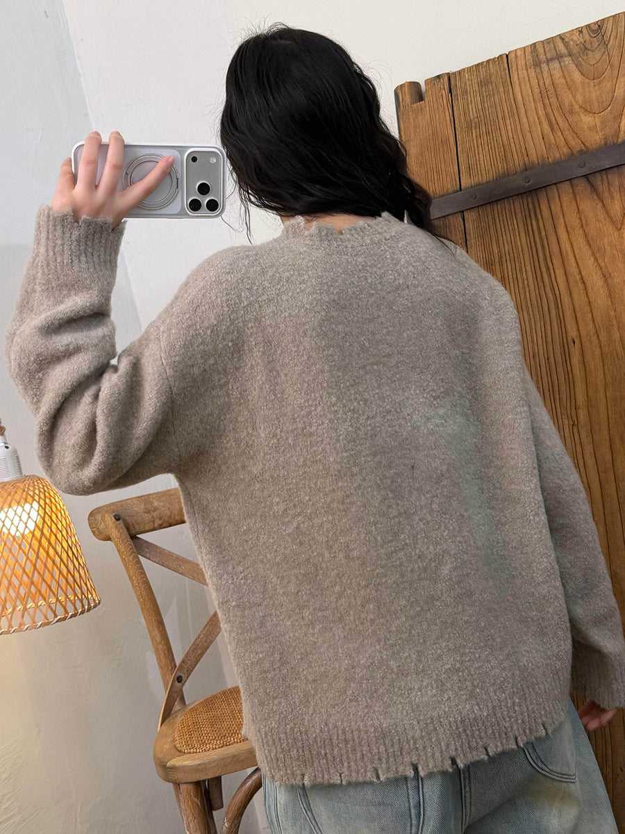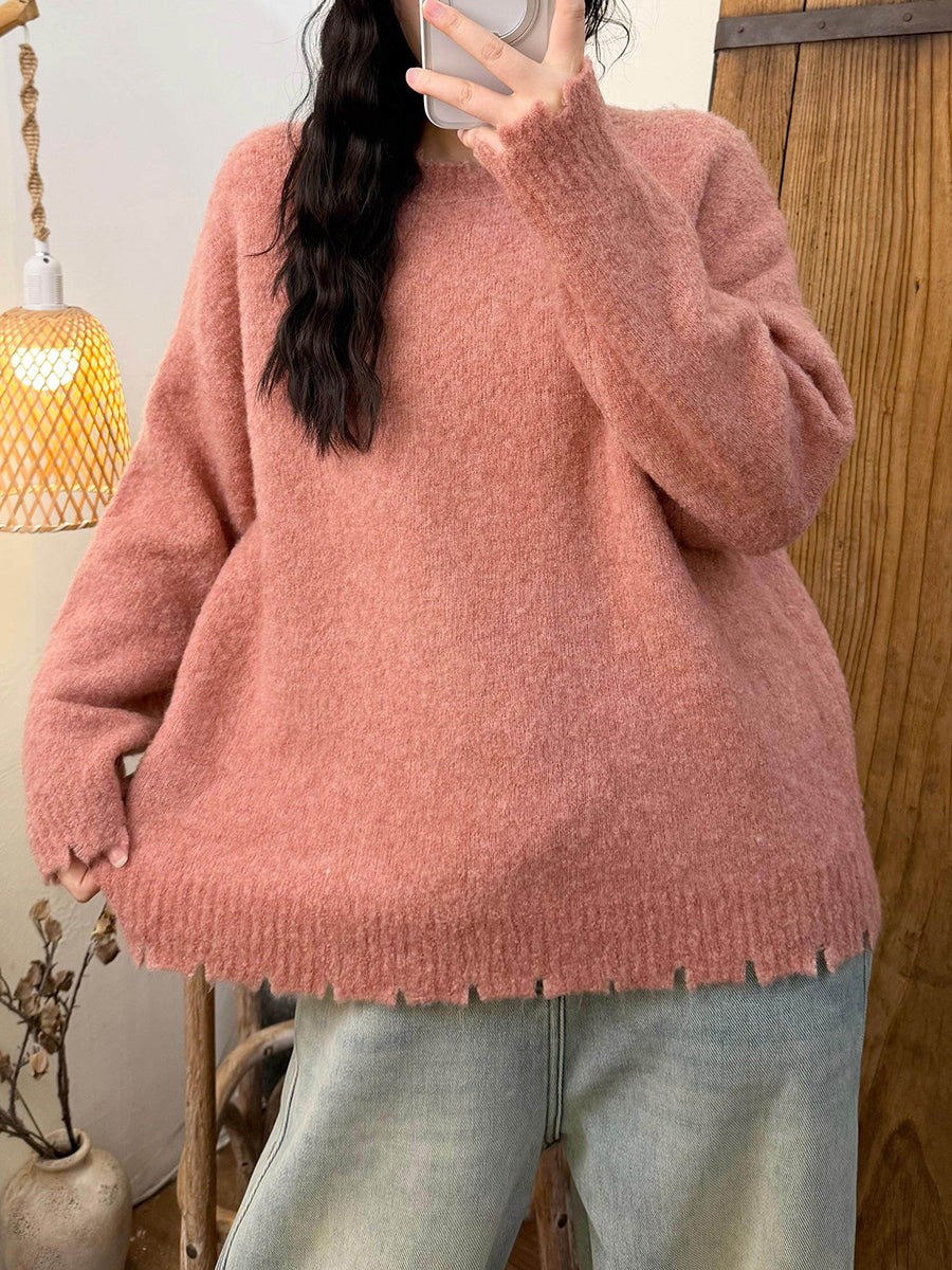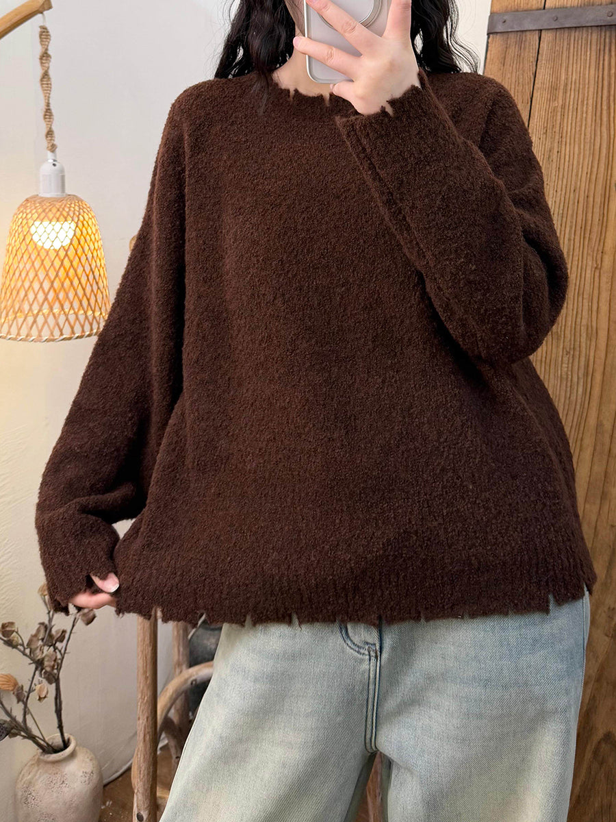 Suéter retro de invierno con cuello redondo y color puro para mujer