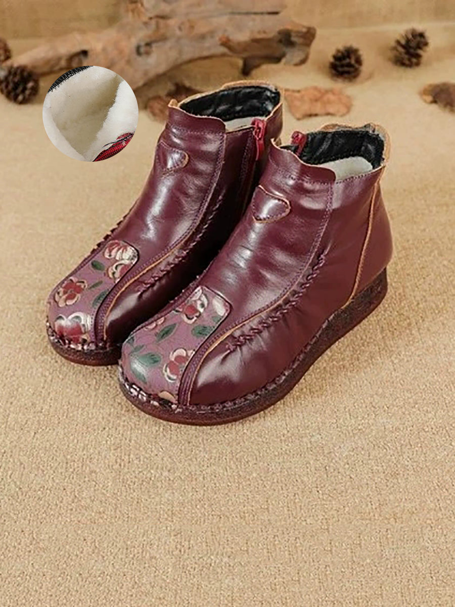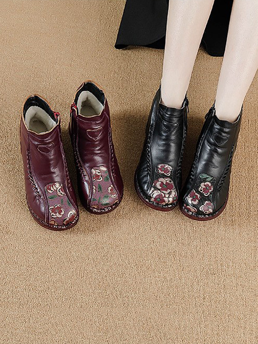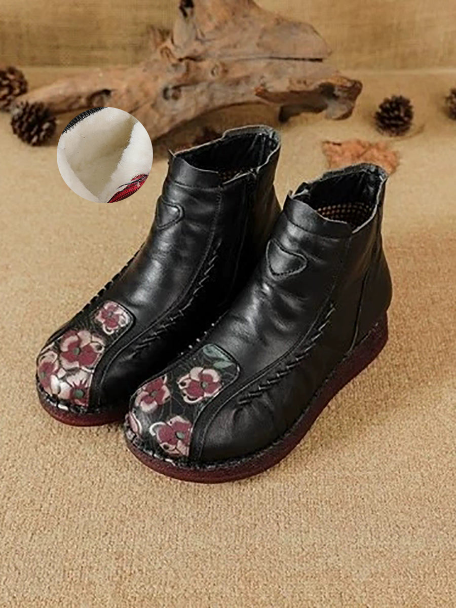 Botines de piel con flores artísticas de invierno para mujer