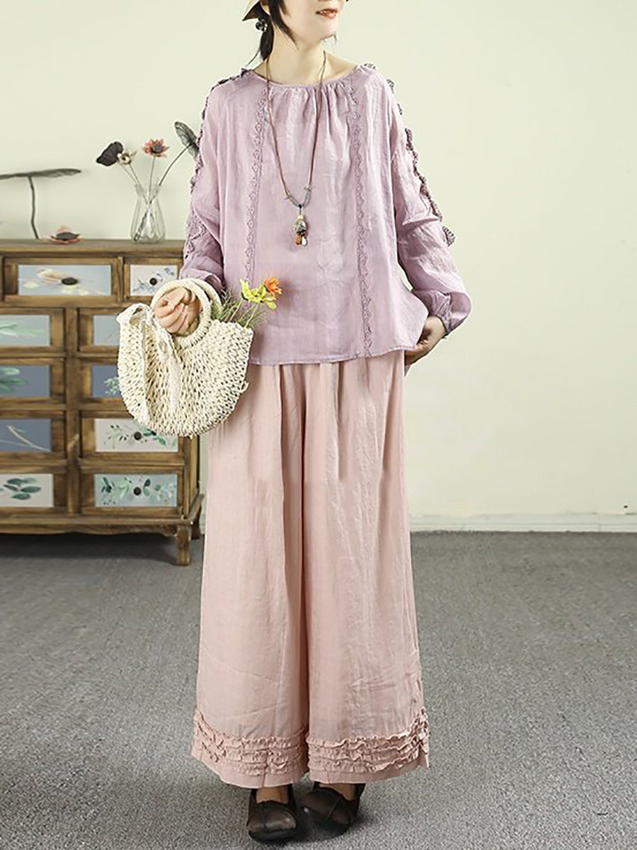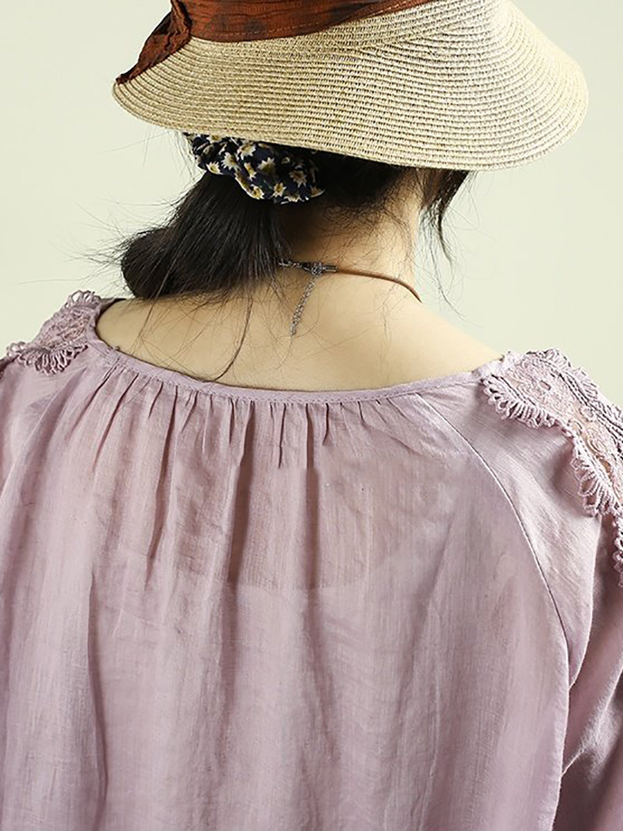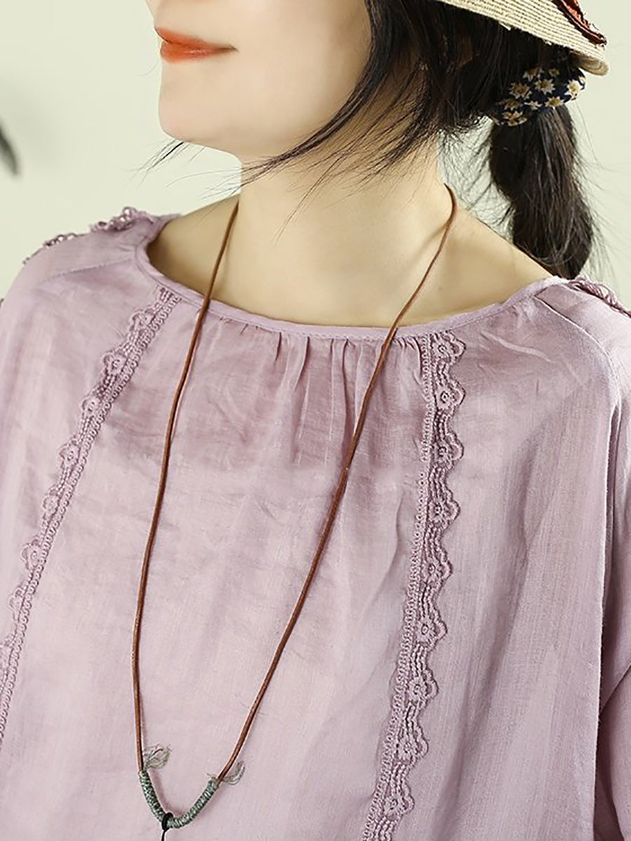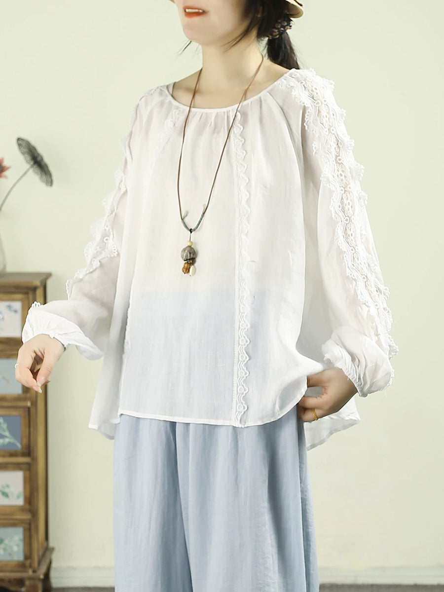 Camisa de mujer Artsy Spring con cuello redondo y encaje empalmado, 100 % ramio