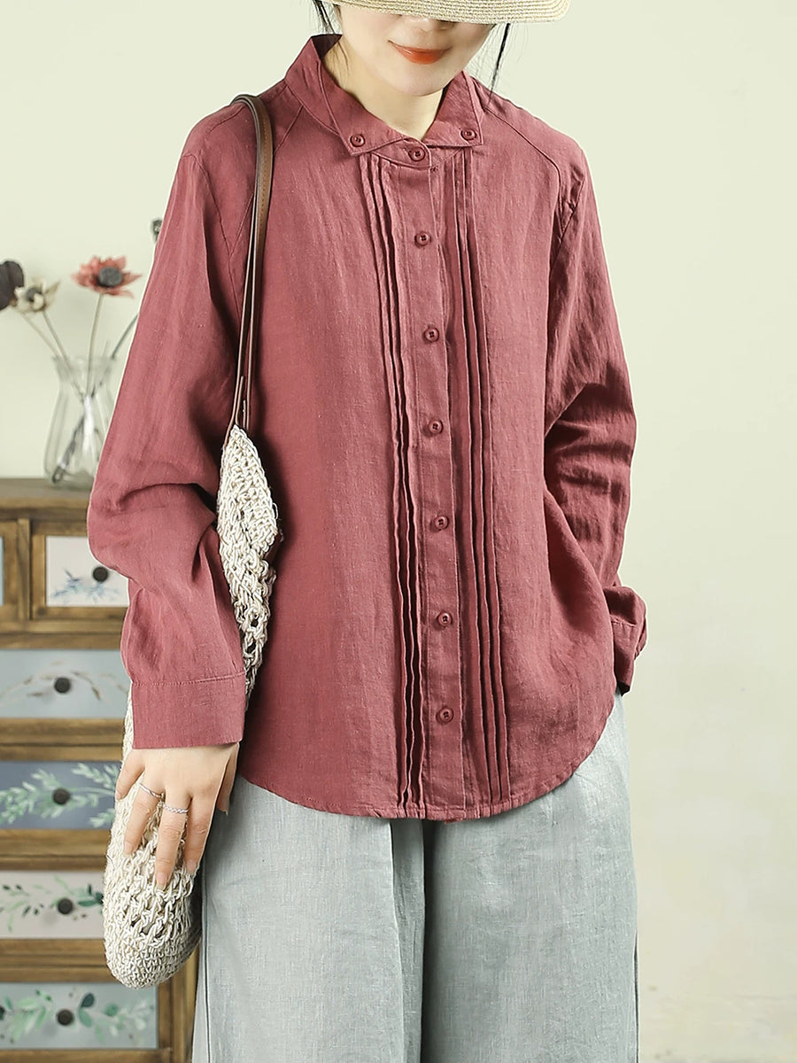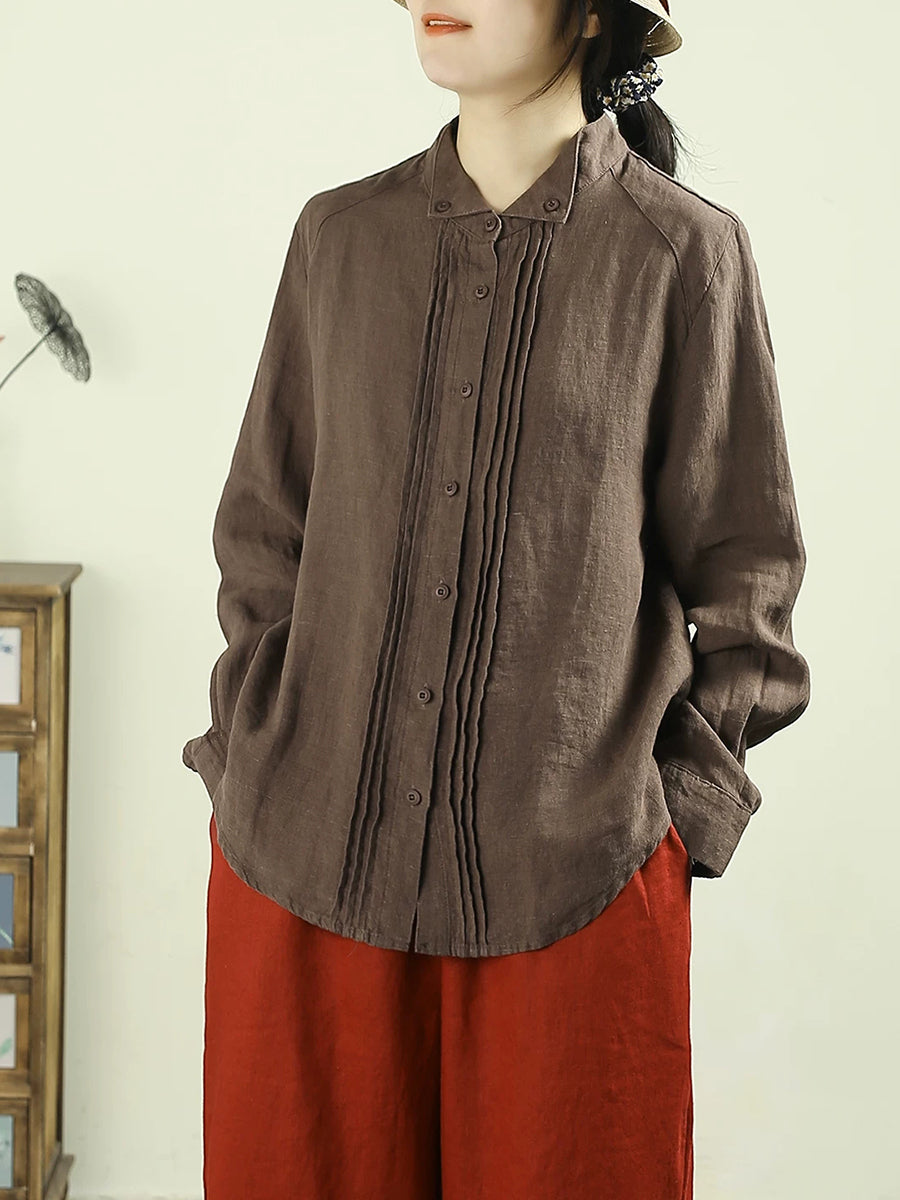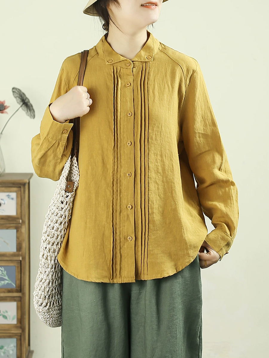 Camisa de lino 100 % color puro con fruncido Artsy Spring para mujer