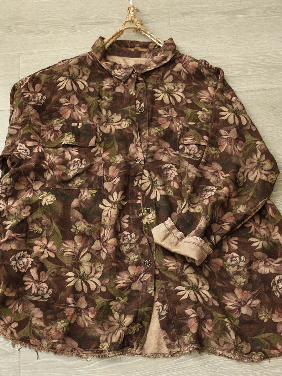 Camisa de algodón con cuello vuelto y estampado floral artístico de invierno para mujer