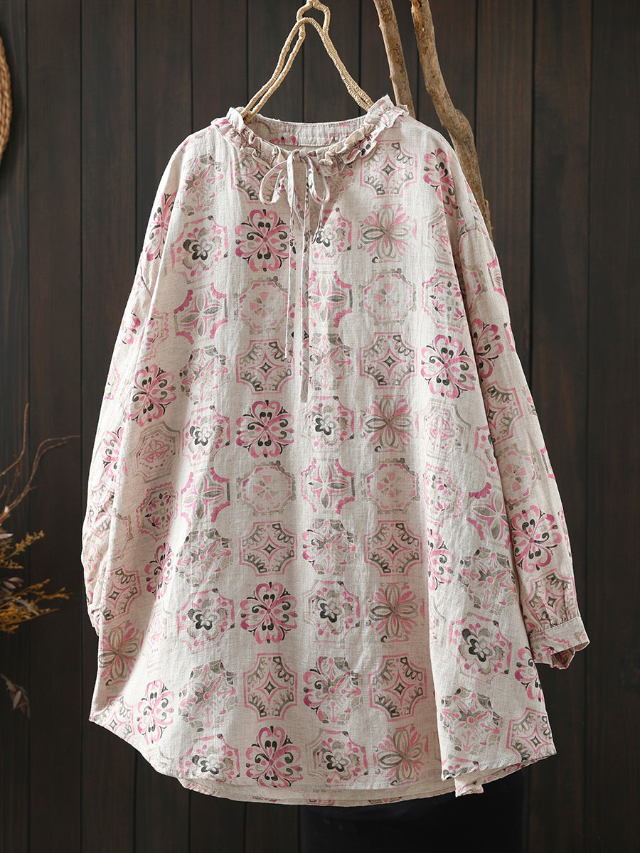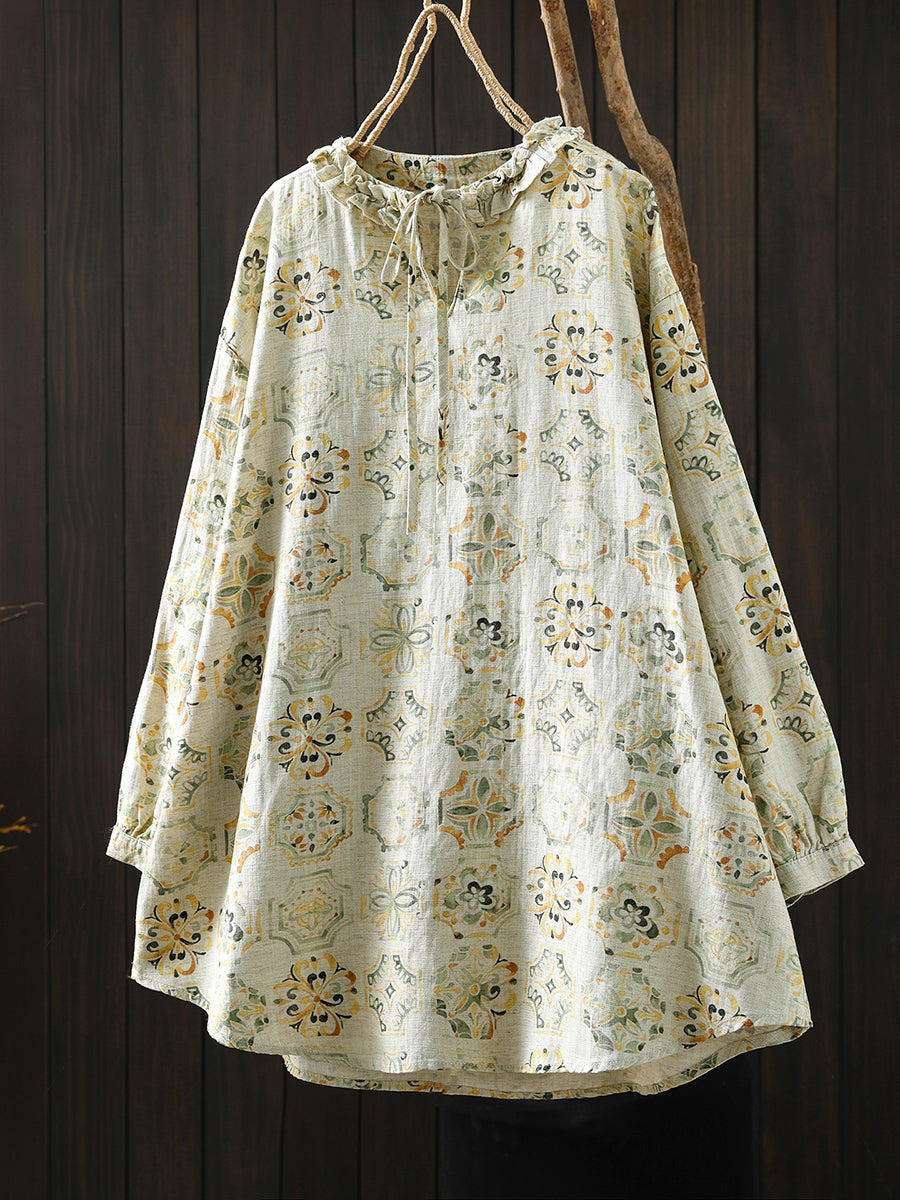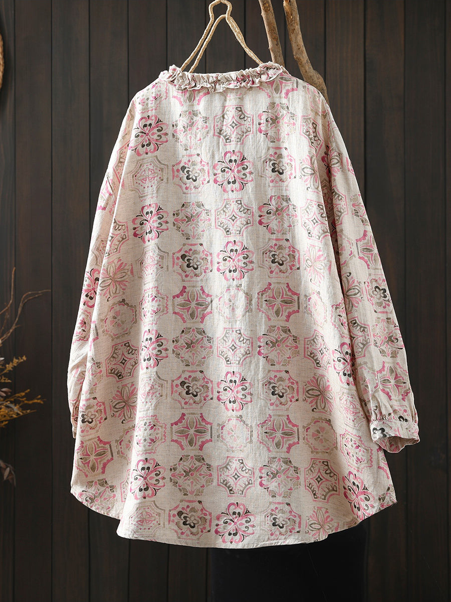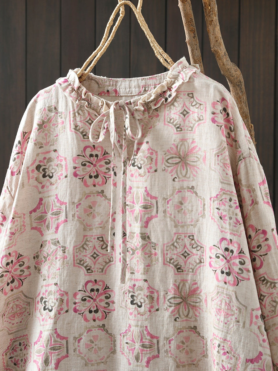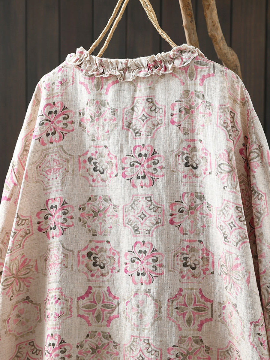 Blusa de lino 100 % con flores primaverales artísticas para mujer