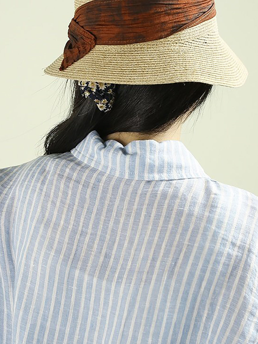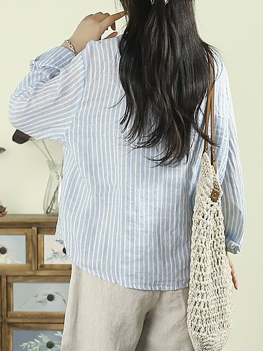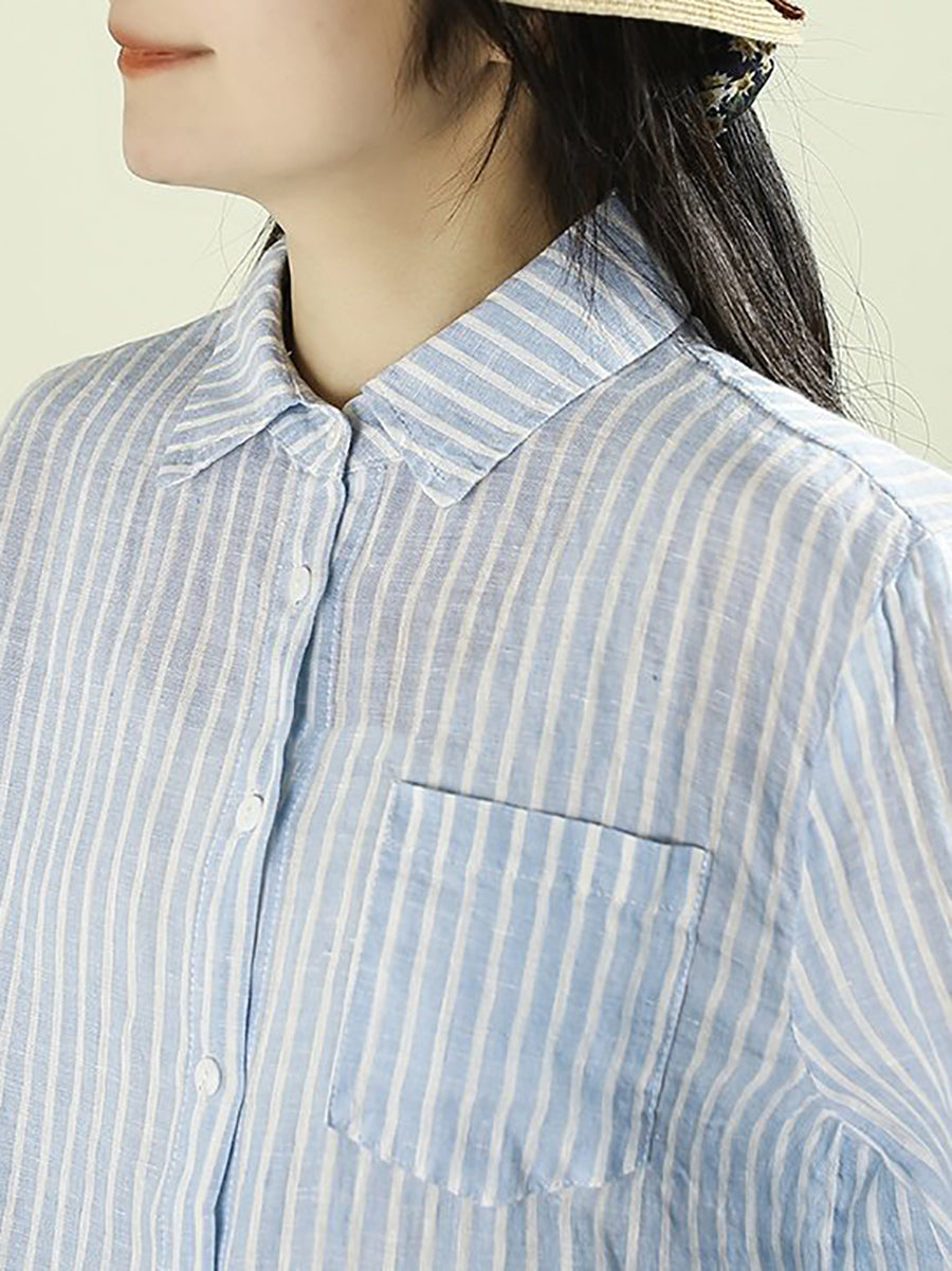 Camisa de mujer con cuello vuelto, 100 % lino y rayas Artsy Spring