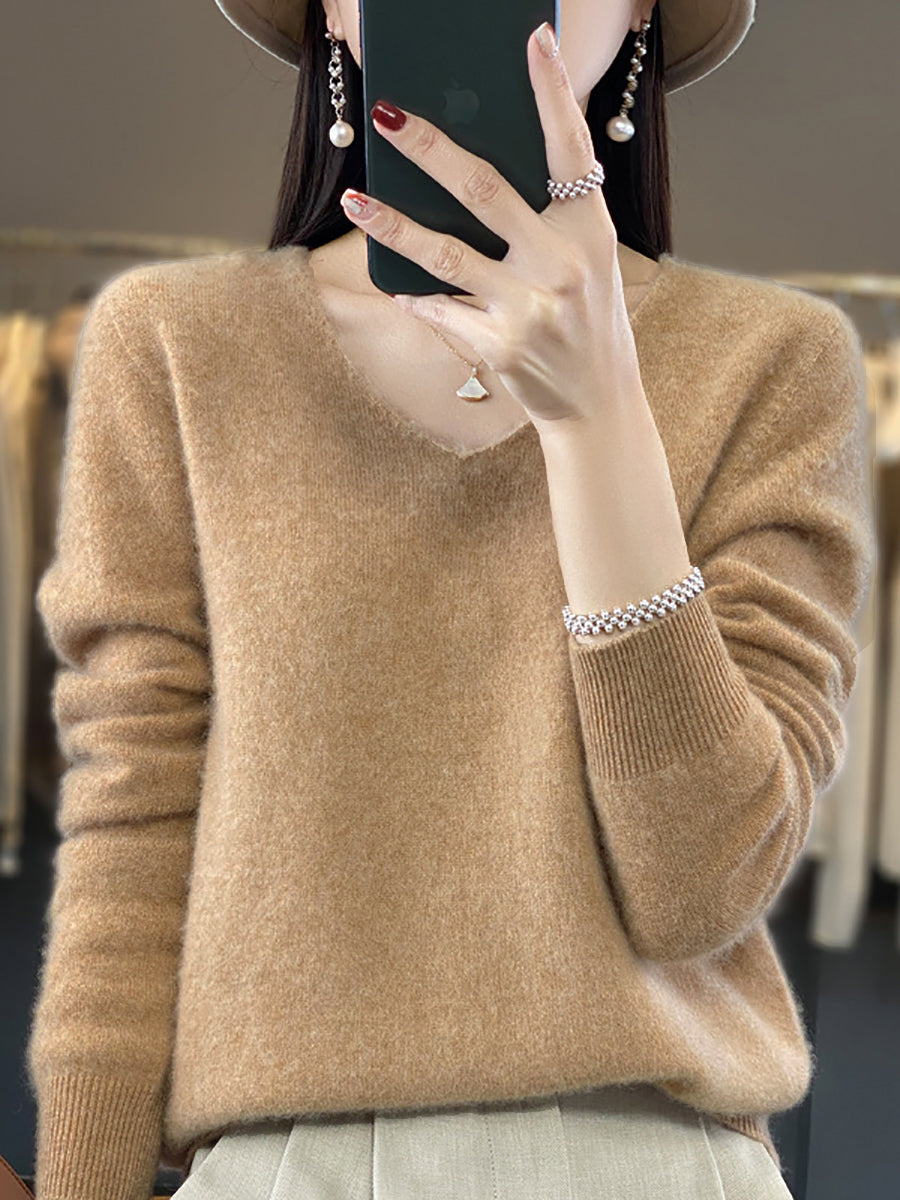 Suéter de punto con cuello en V y color puro para mujer de otoño
