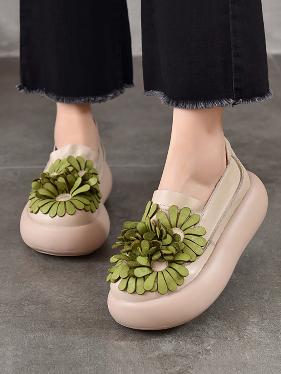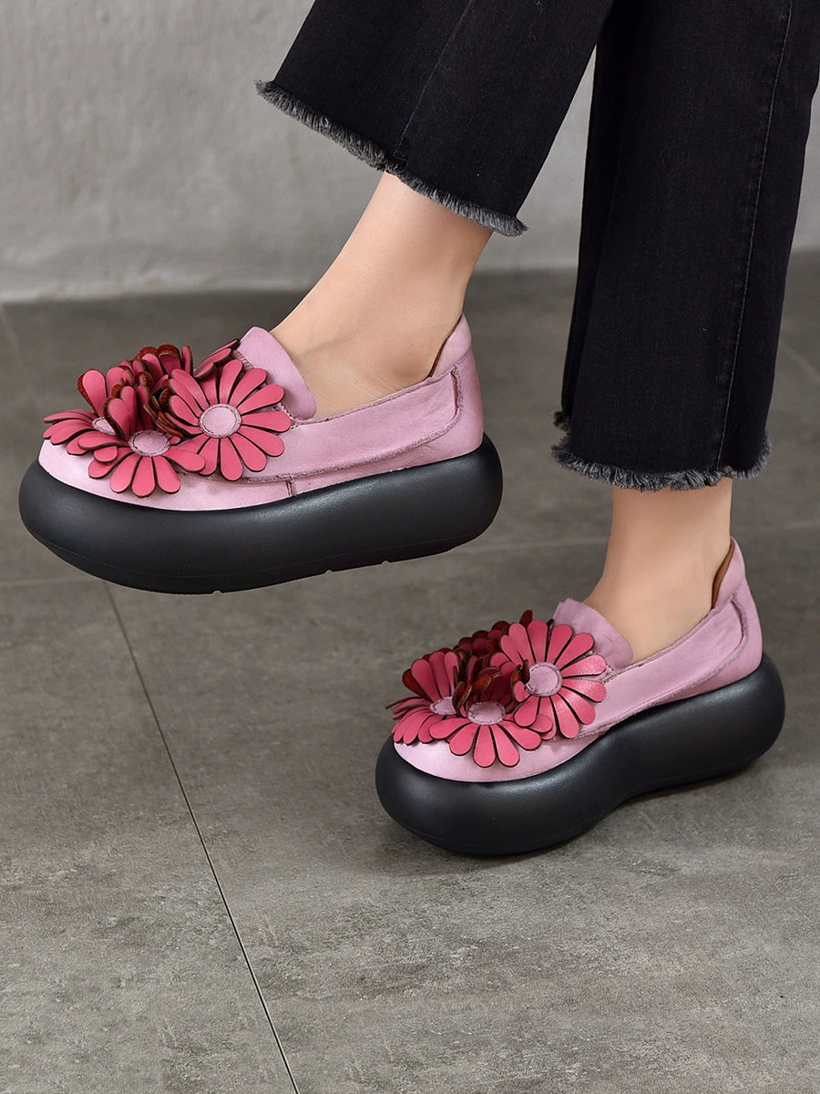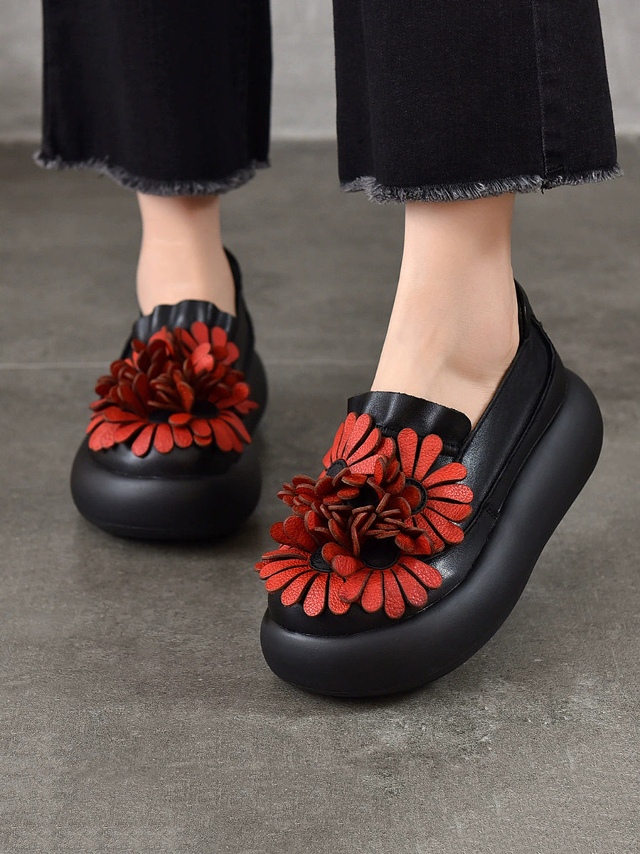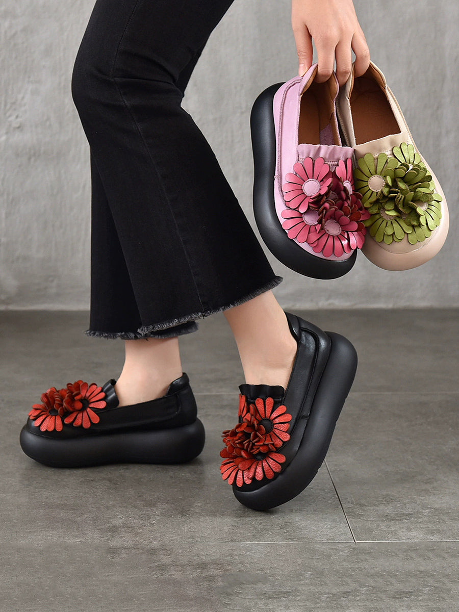 Zapatos de plataforma con flores y piel auténtica para mujer, primavera