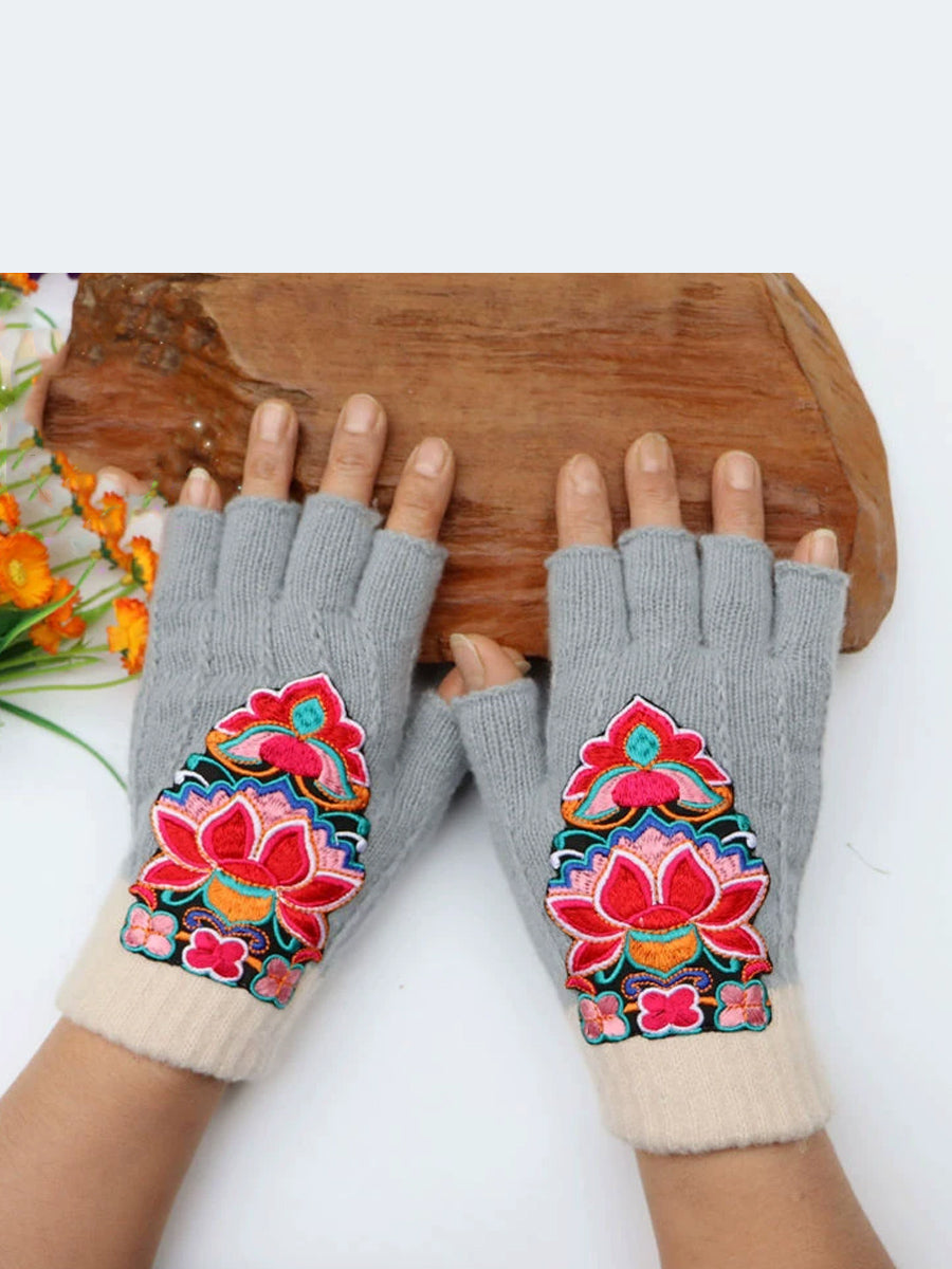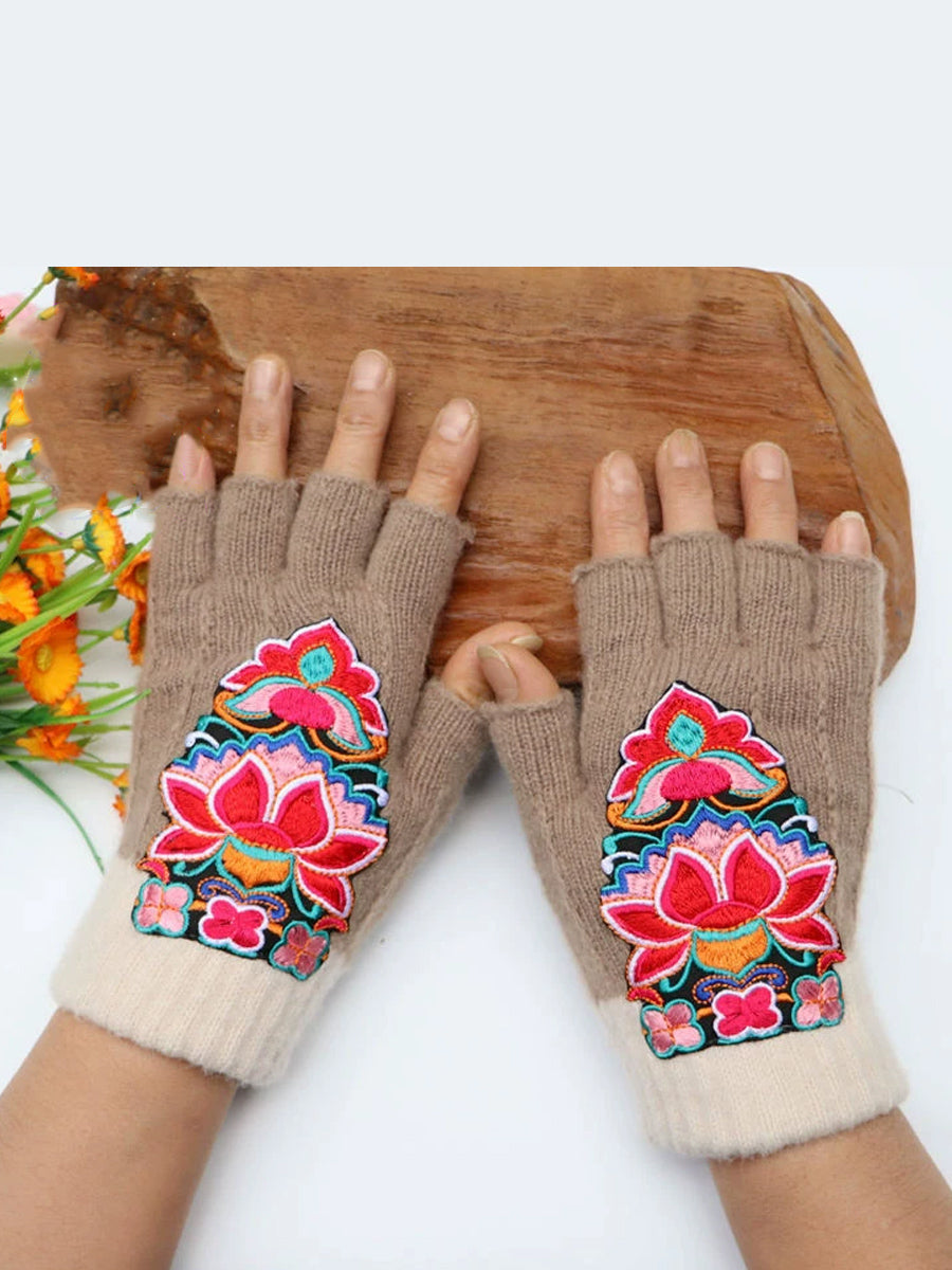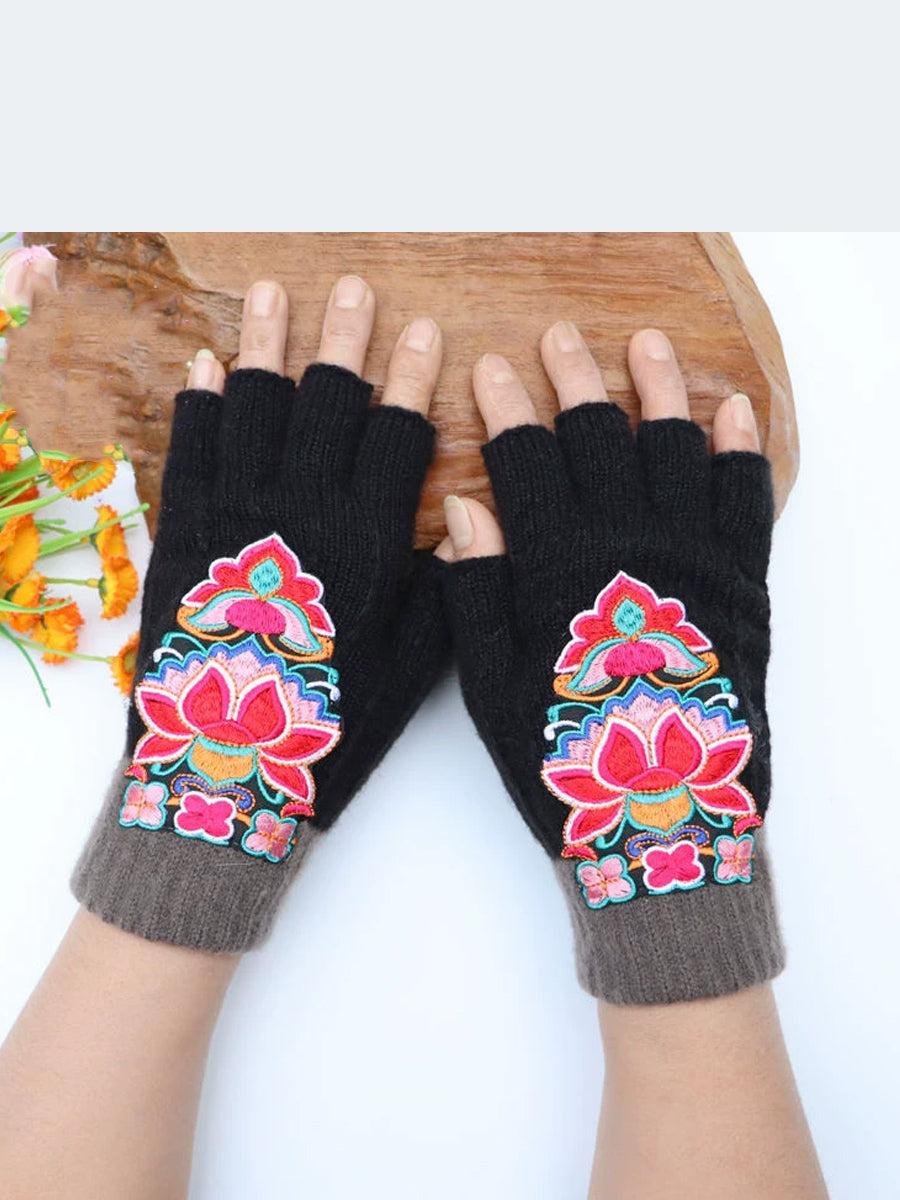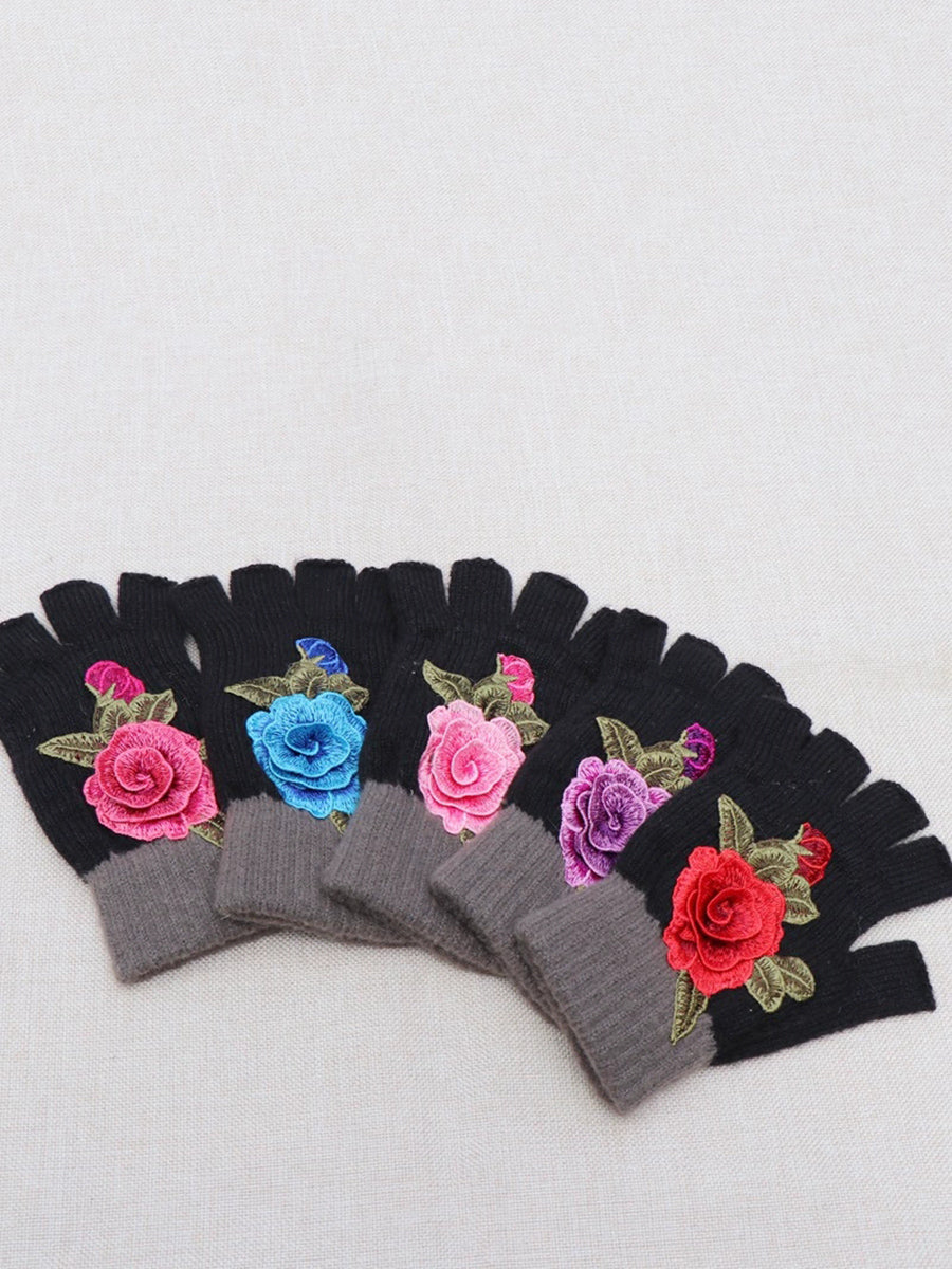 Guantes empalmados con bordado de flores artísticas de invierno