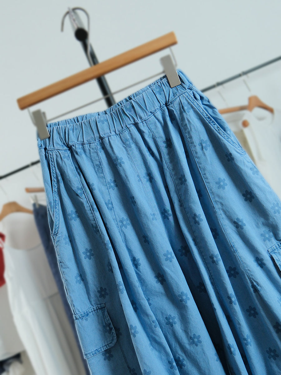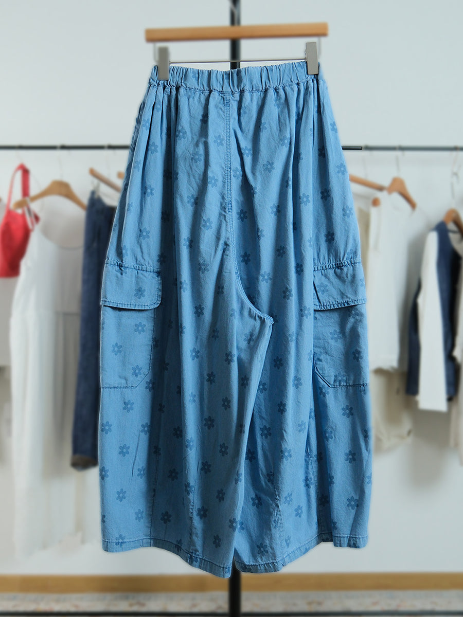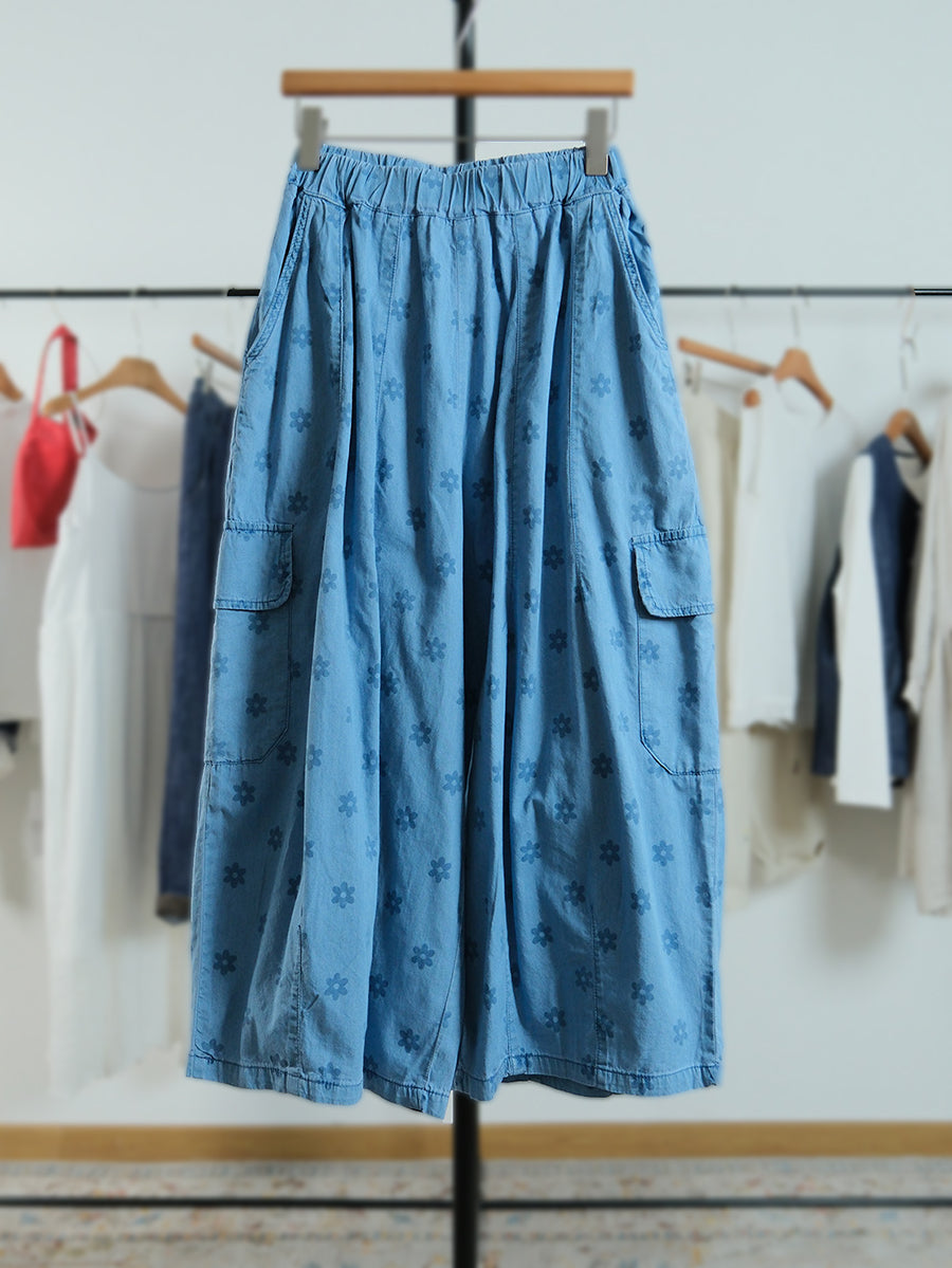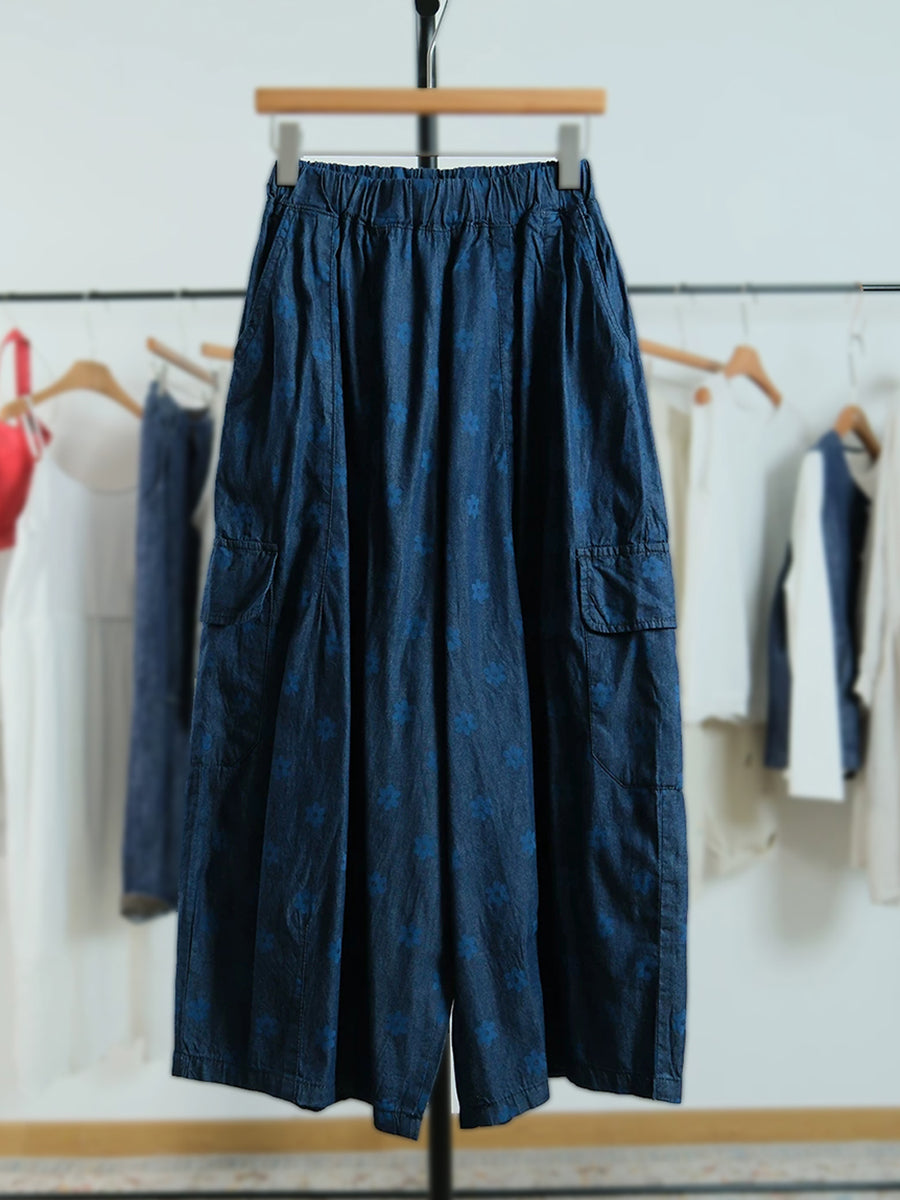 Pantalones de mujer de pierna ancha con estampado floral artístico, 100% algodón.