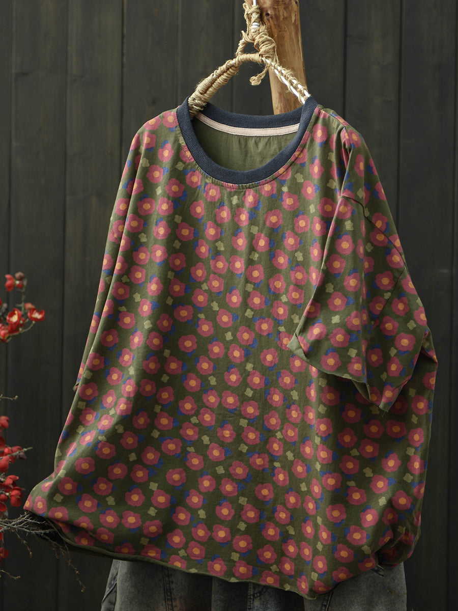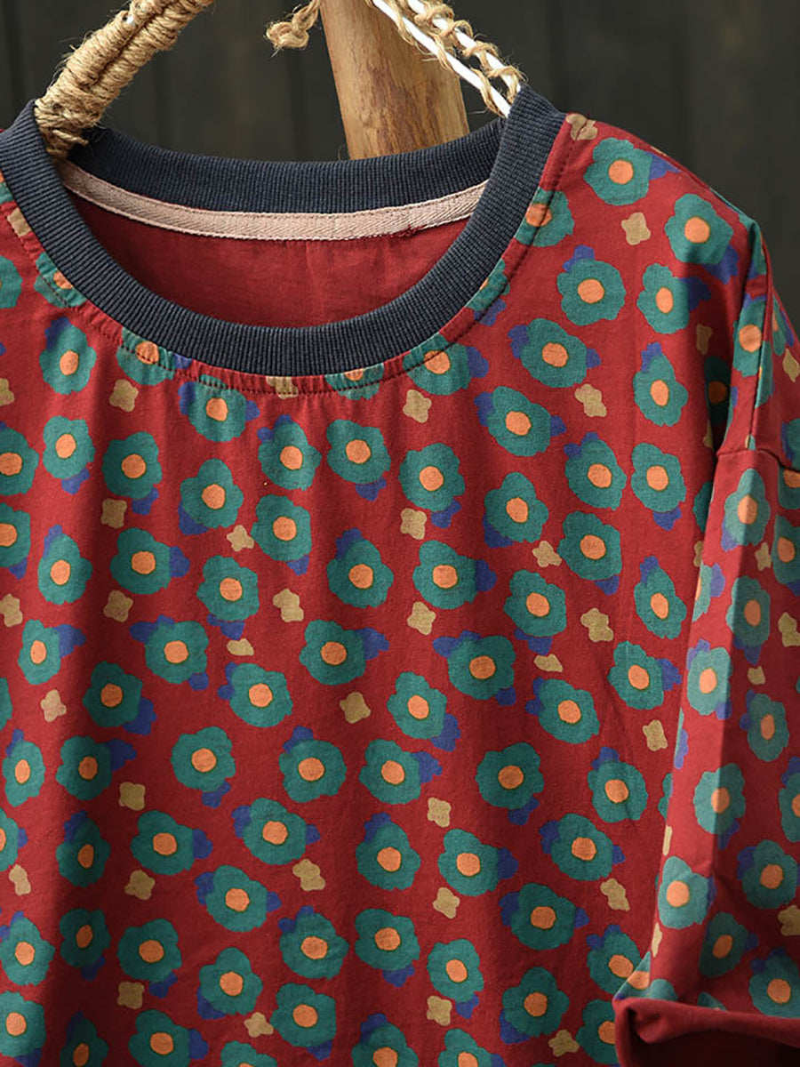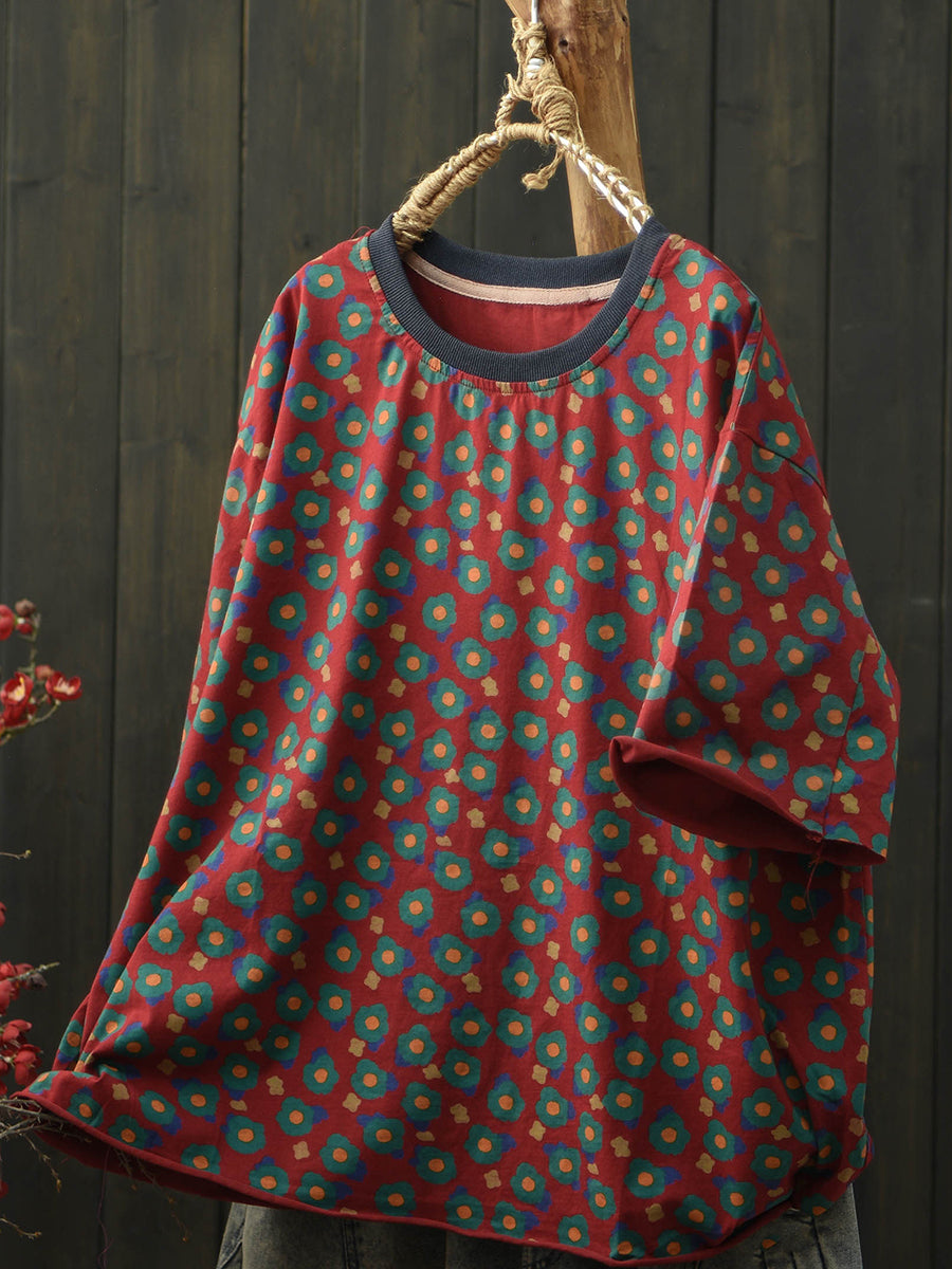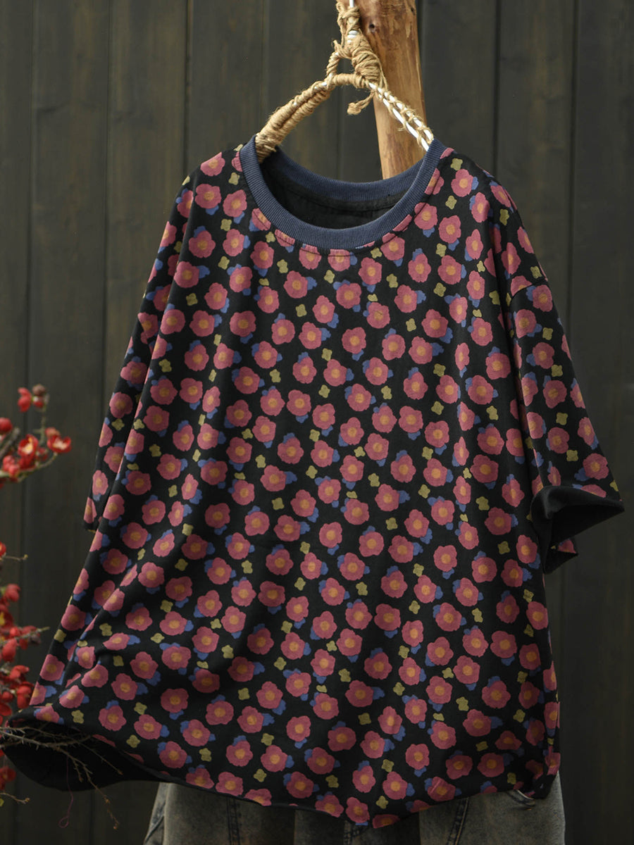 Camiseta de algodón con cuello redondo y estampado floral artístico para mujer, ideal para el verano.
