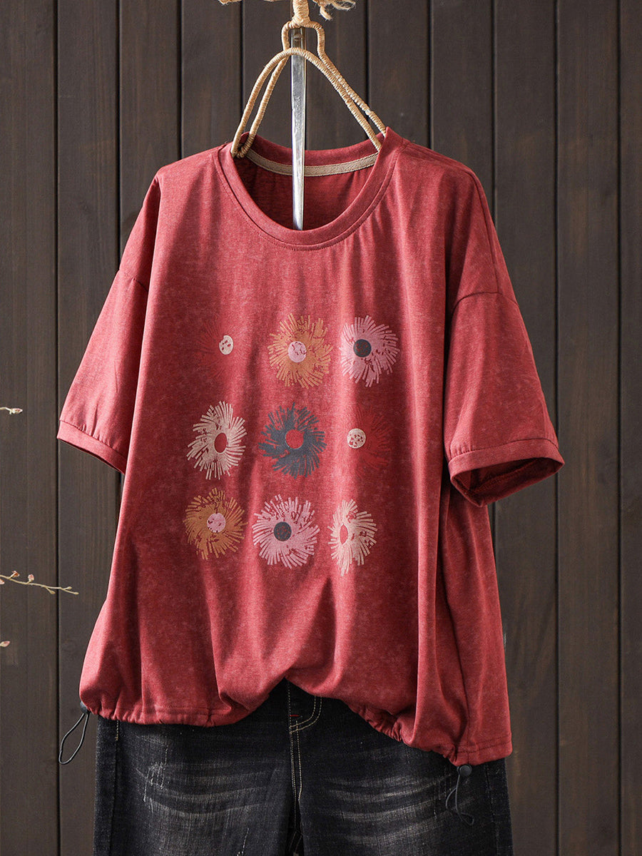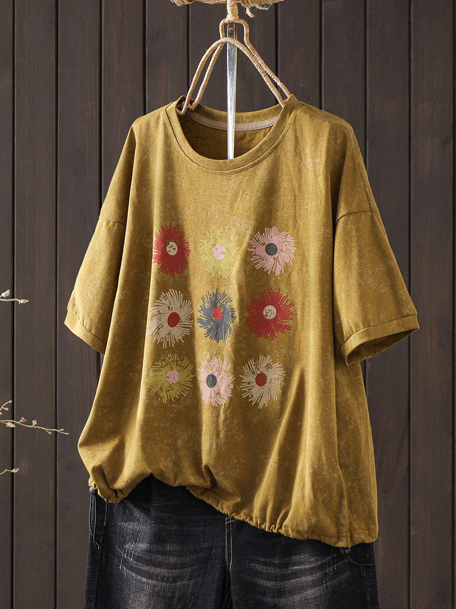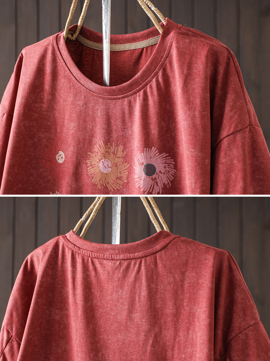 Camiseta de algodón informal de verano con cuello redondo y estampado floral para mujer