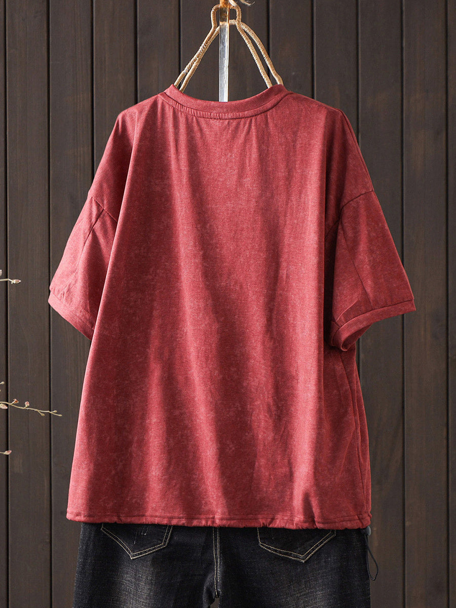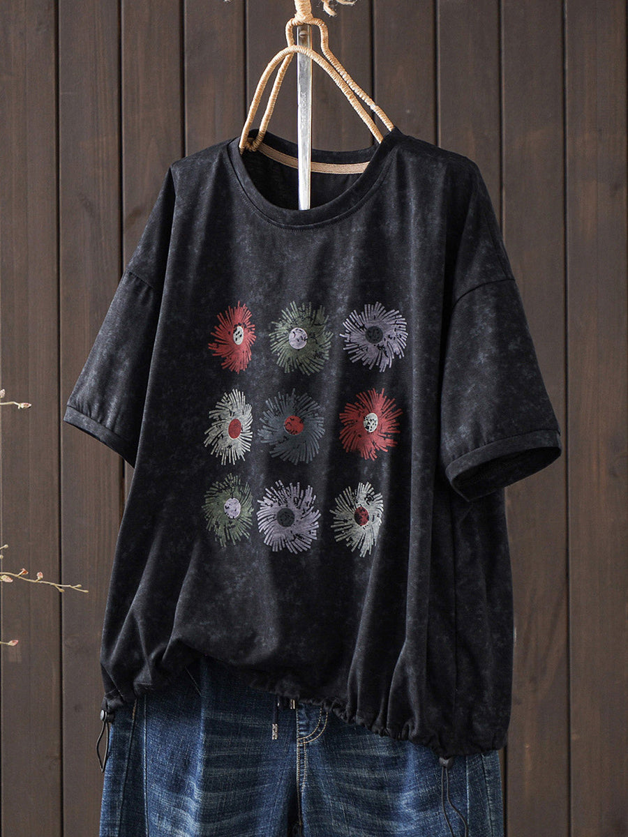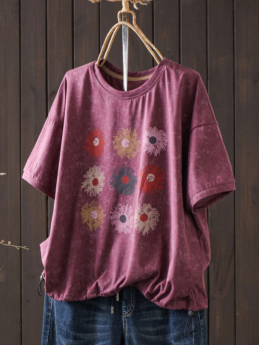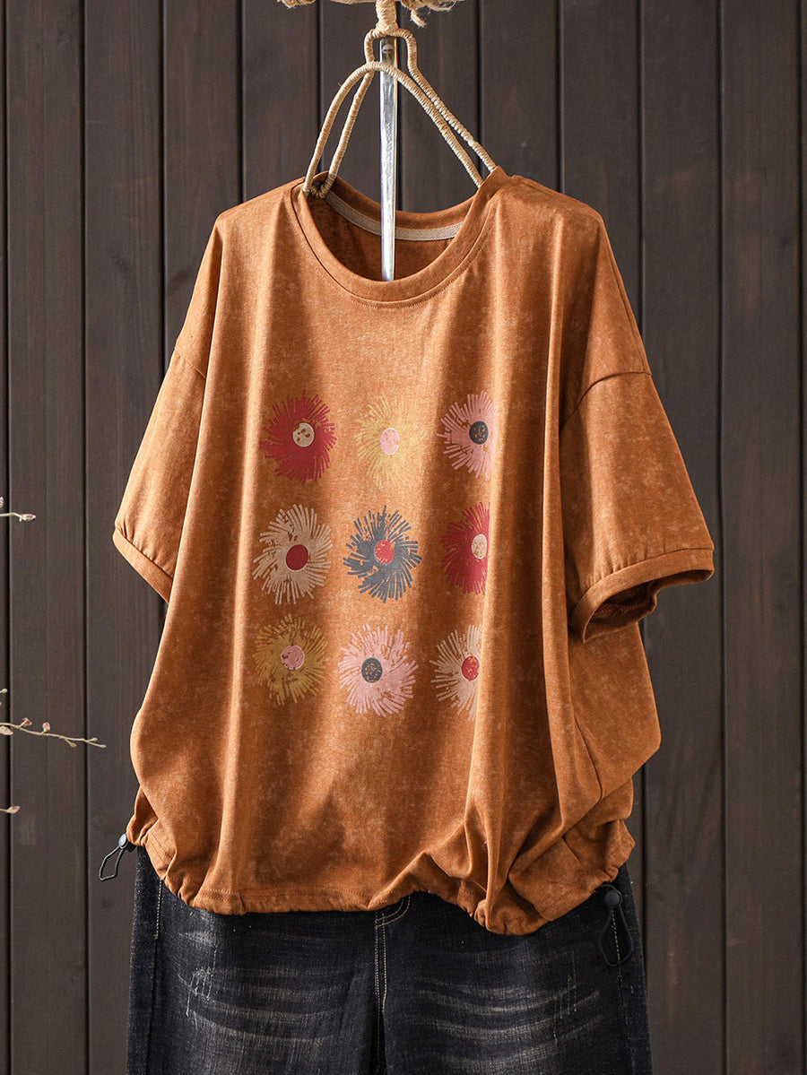 Camiseta de algodón informal de verano con cuello redondo y estampado floral para mujer