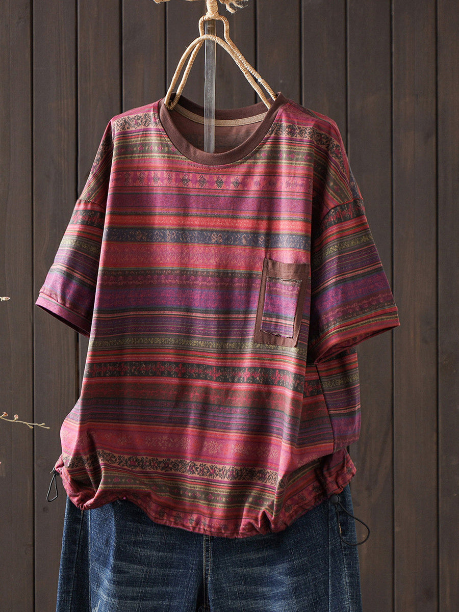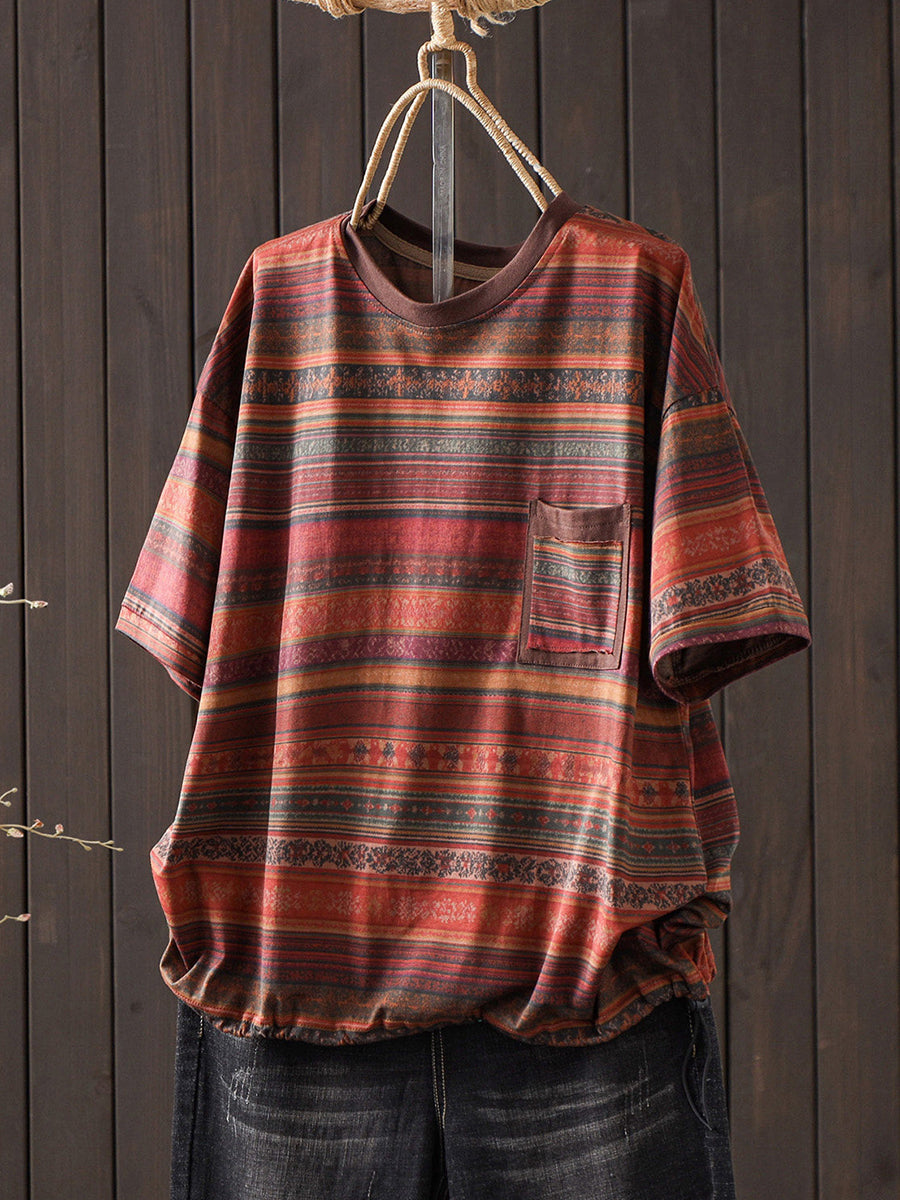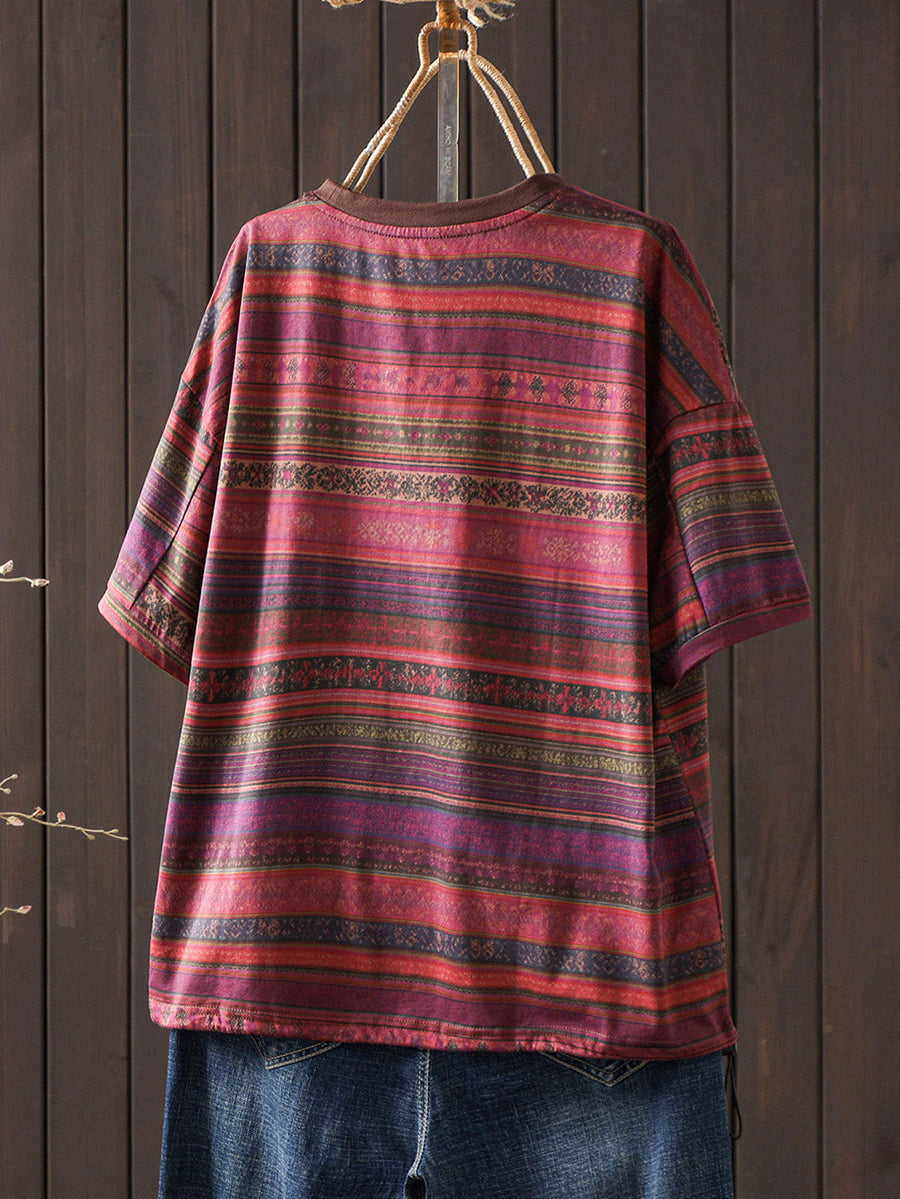 Camiseta de verano vintage para mujer con cuello redondo y rayas, 100% algodón.
