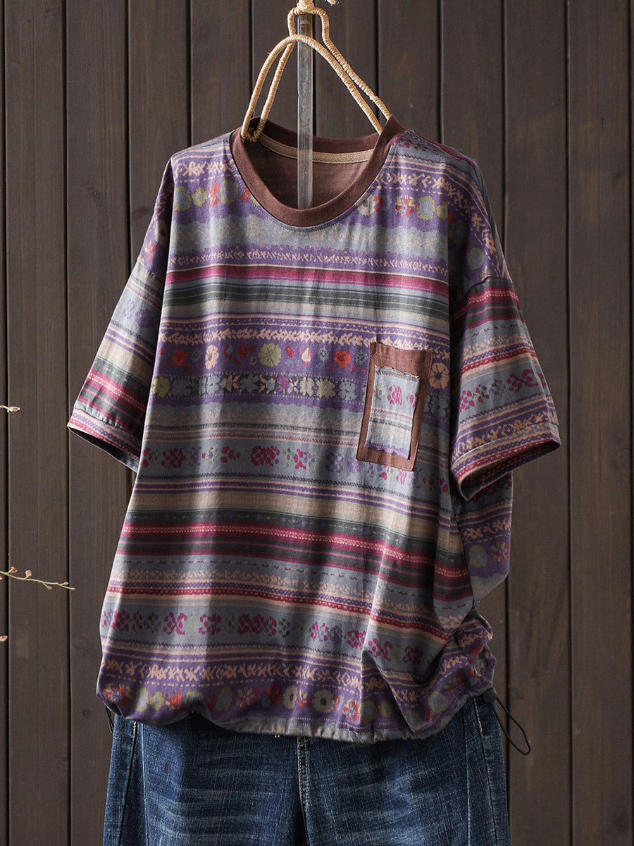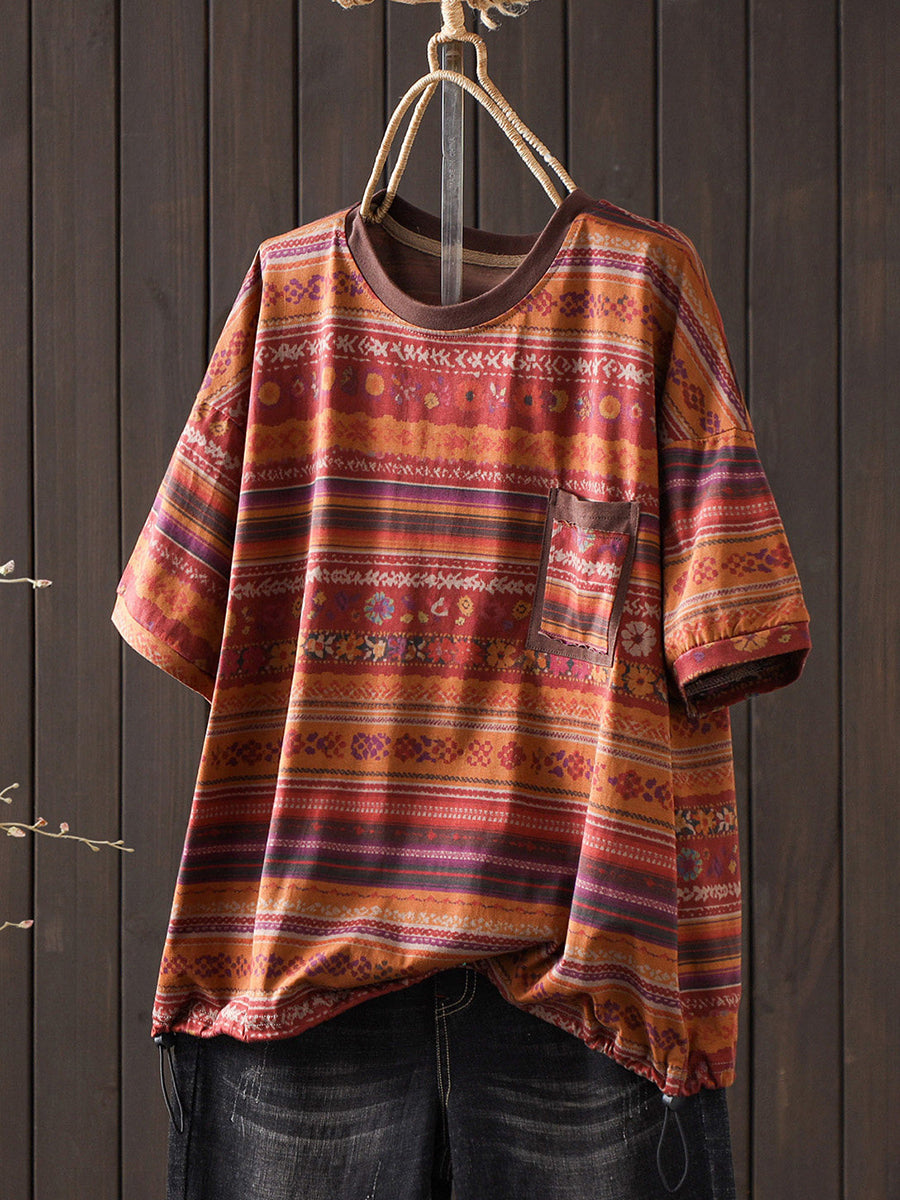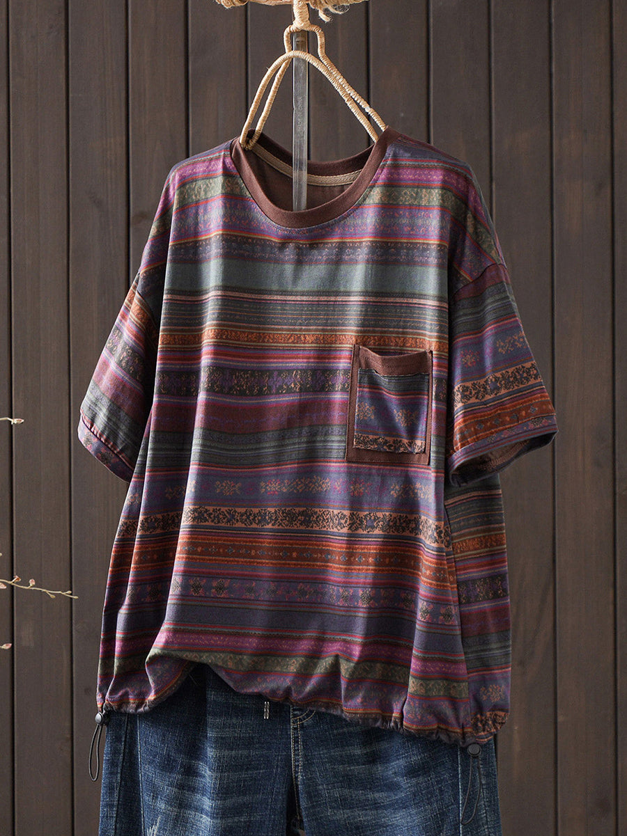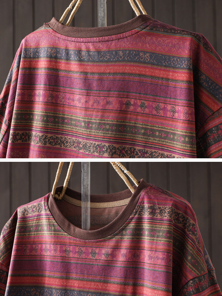Camiseta de verano vintage para mujer con cuello redondo y rayas, 100% algodón.