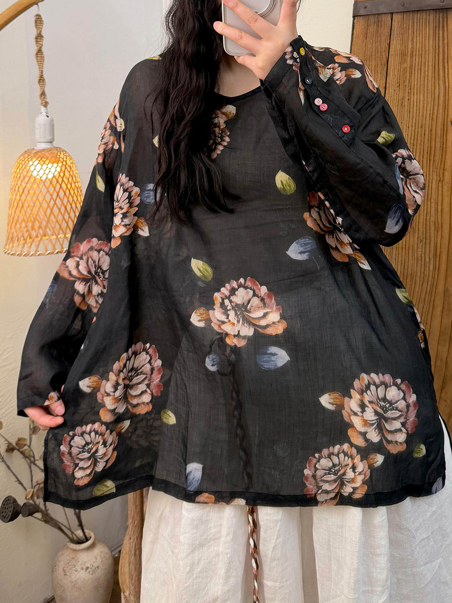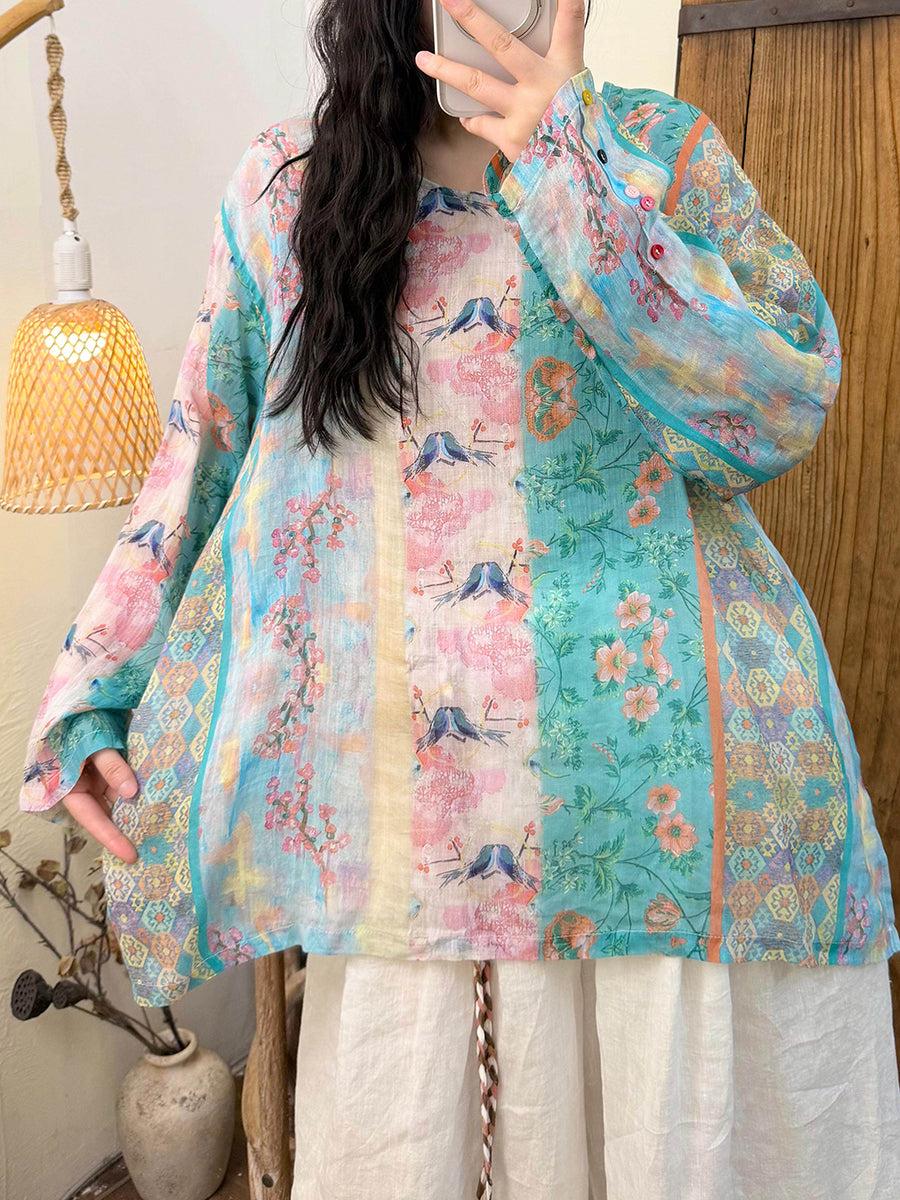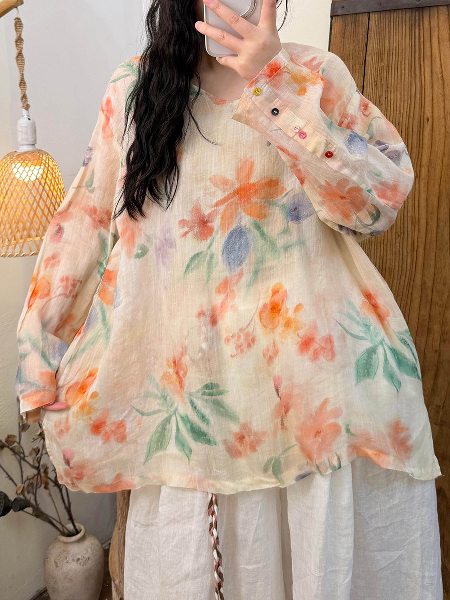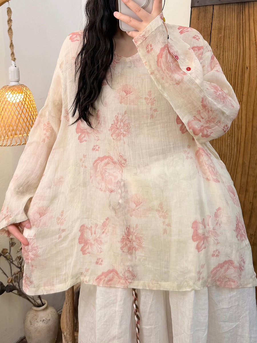 Camisa de ramio con cuello en V y estampado floral para mujer, ideal para primavera.