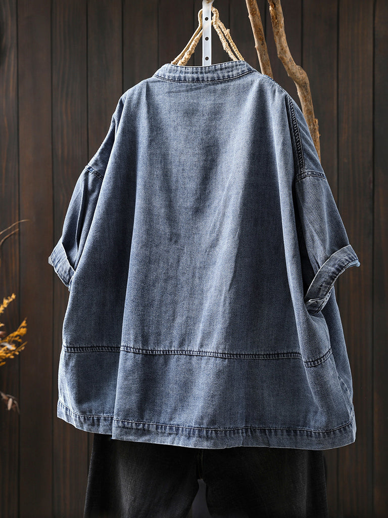 Camisa vaquera retro de verano con cuello alto y color puro para mujer