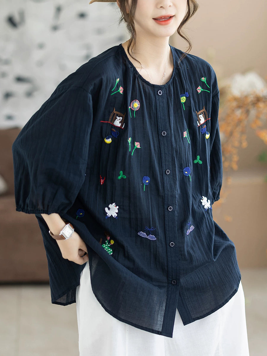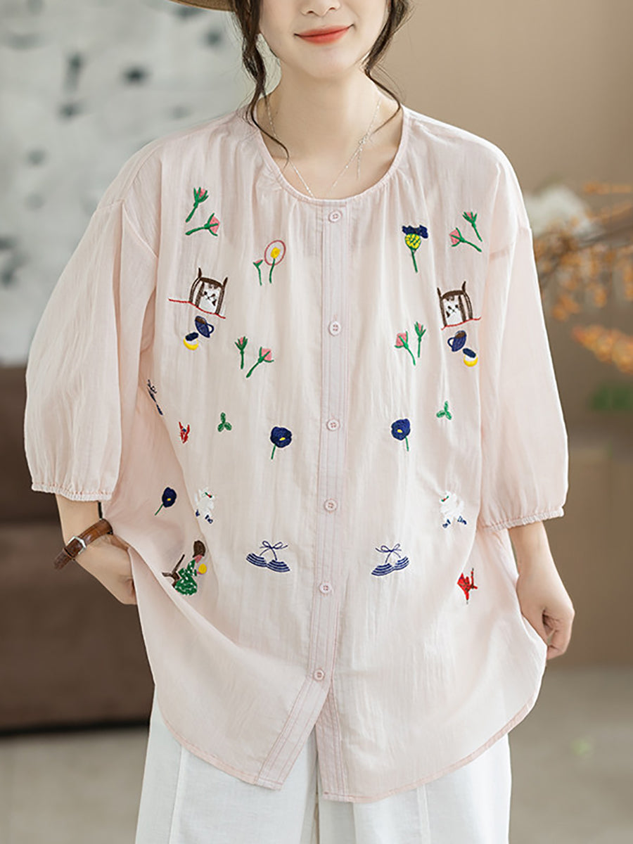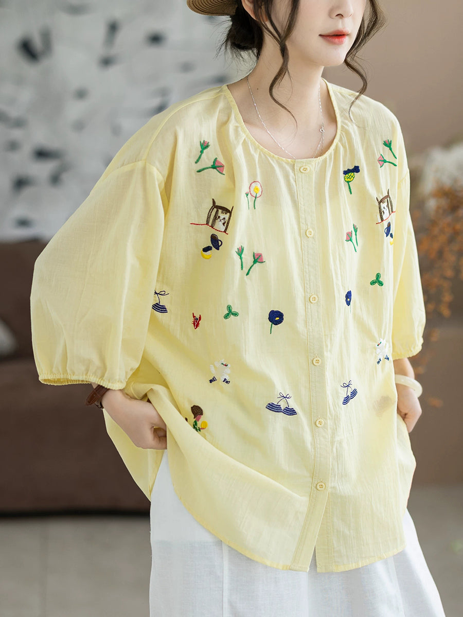 Blusa de verano para mujer con cuello redondo y bordado artístico, 100% algodón.