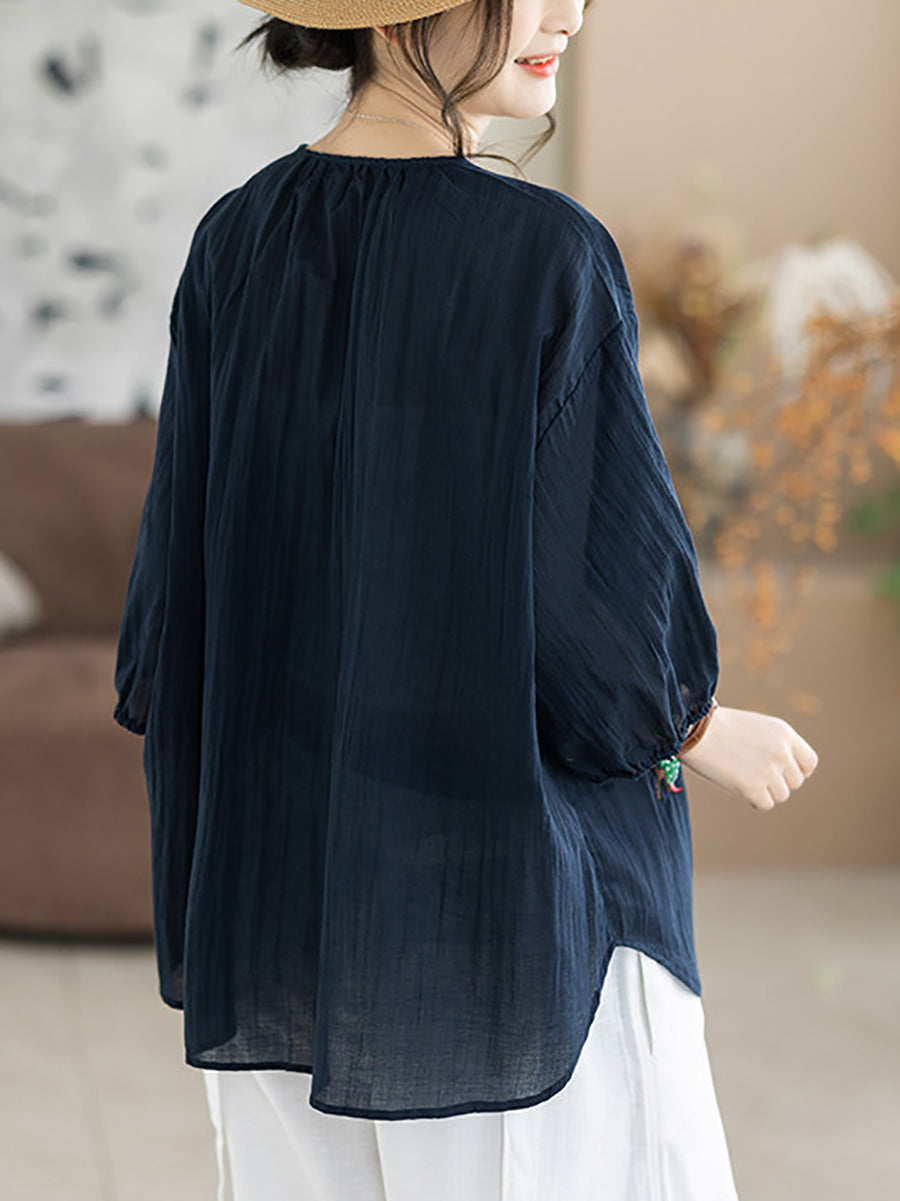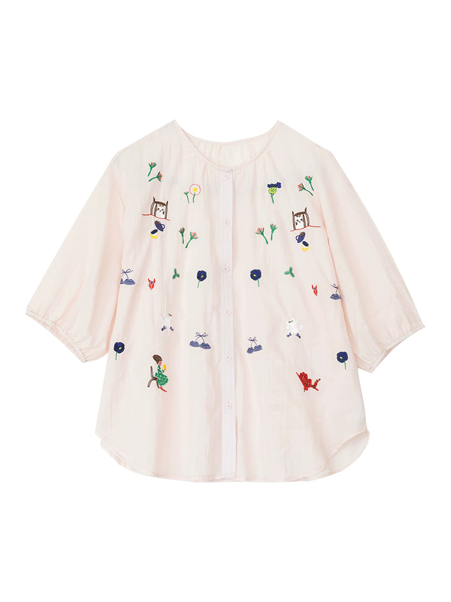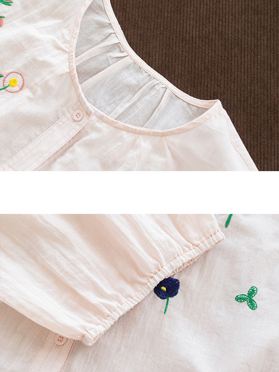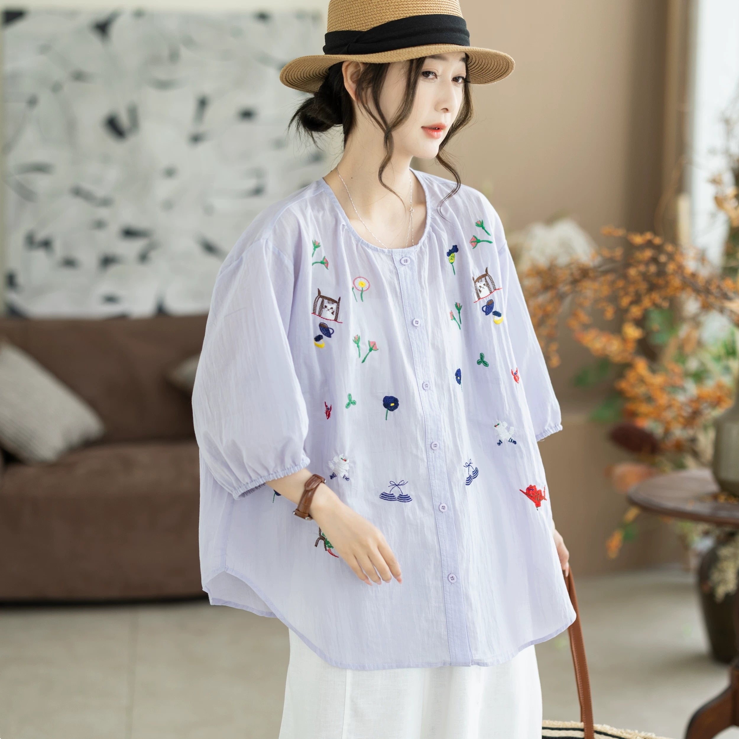 Blusa de verano para mujer con cuello redondo y bordado artístico, 100% algodón.