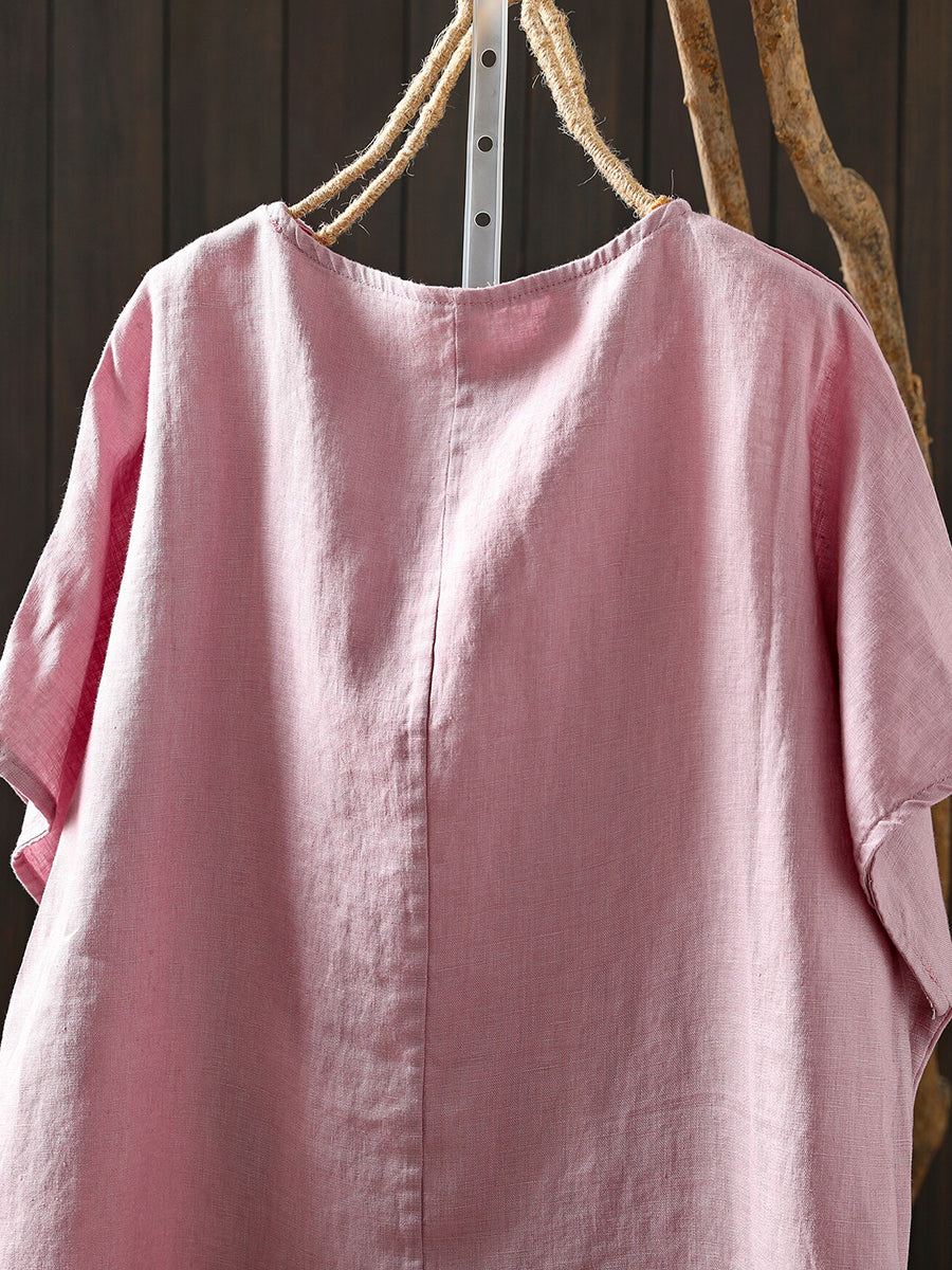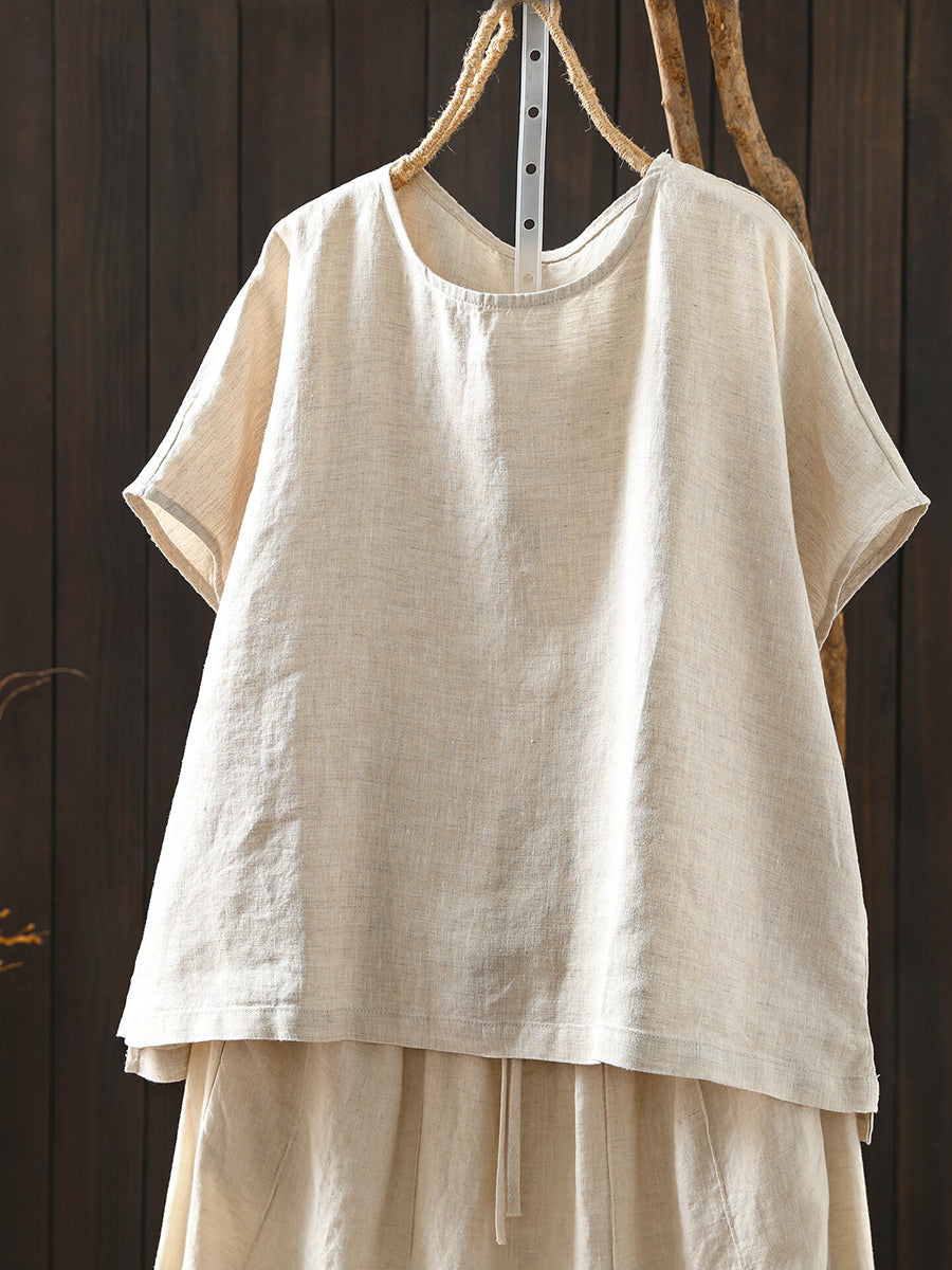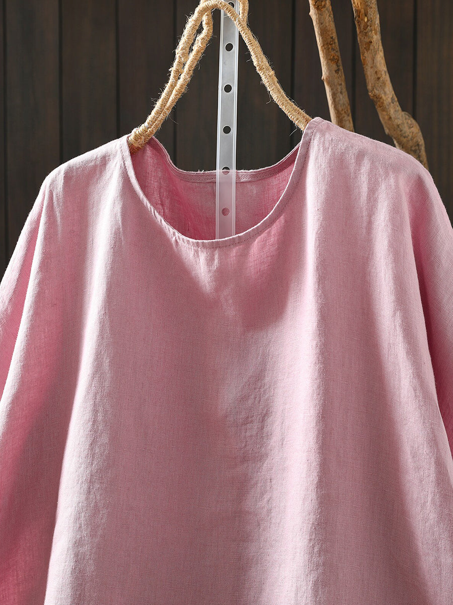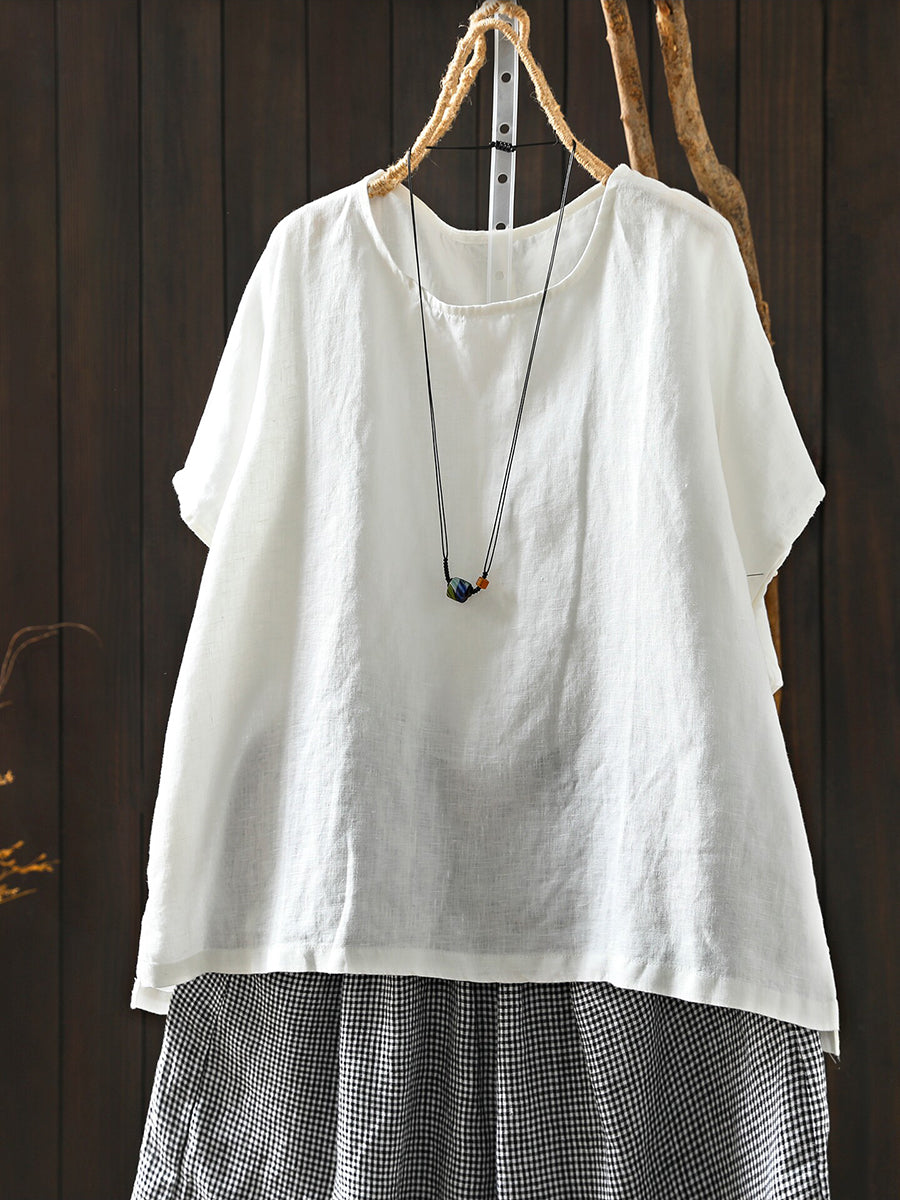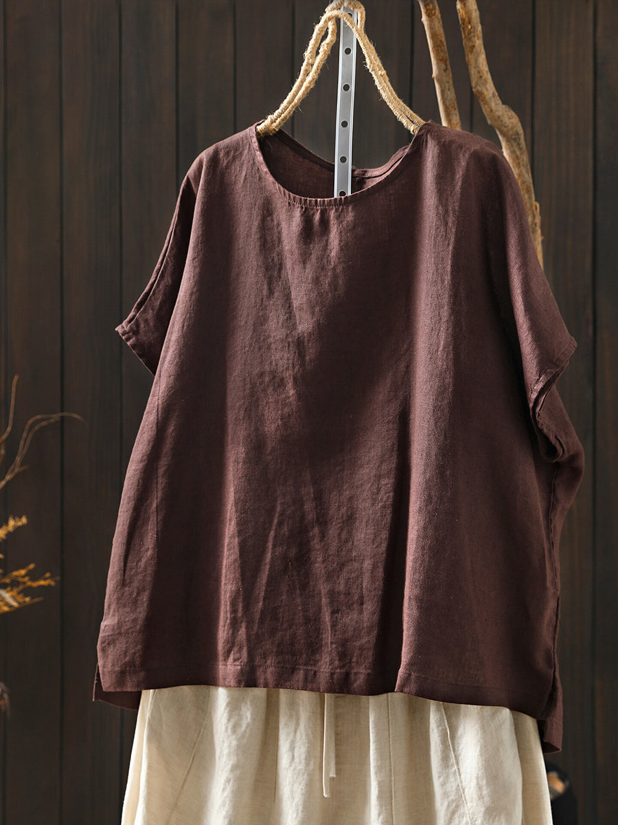 Camiseta de mujer de verano, estilo artístico, color liso, cuello redondo, 100% lino.