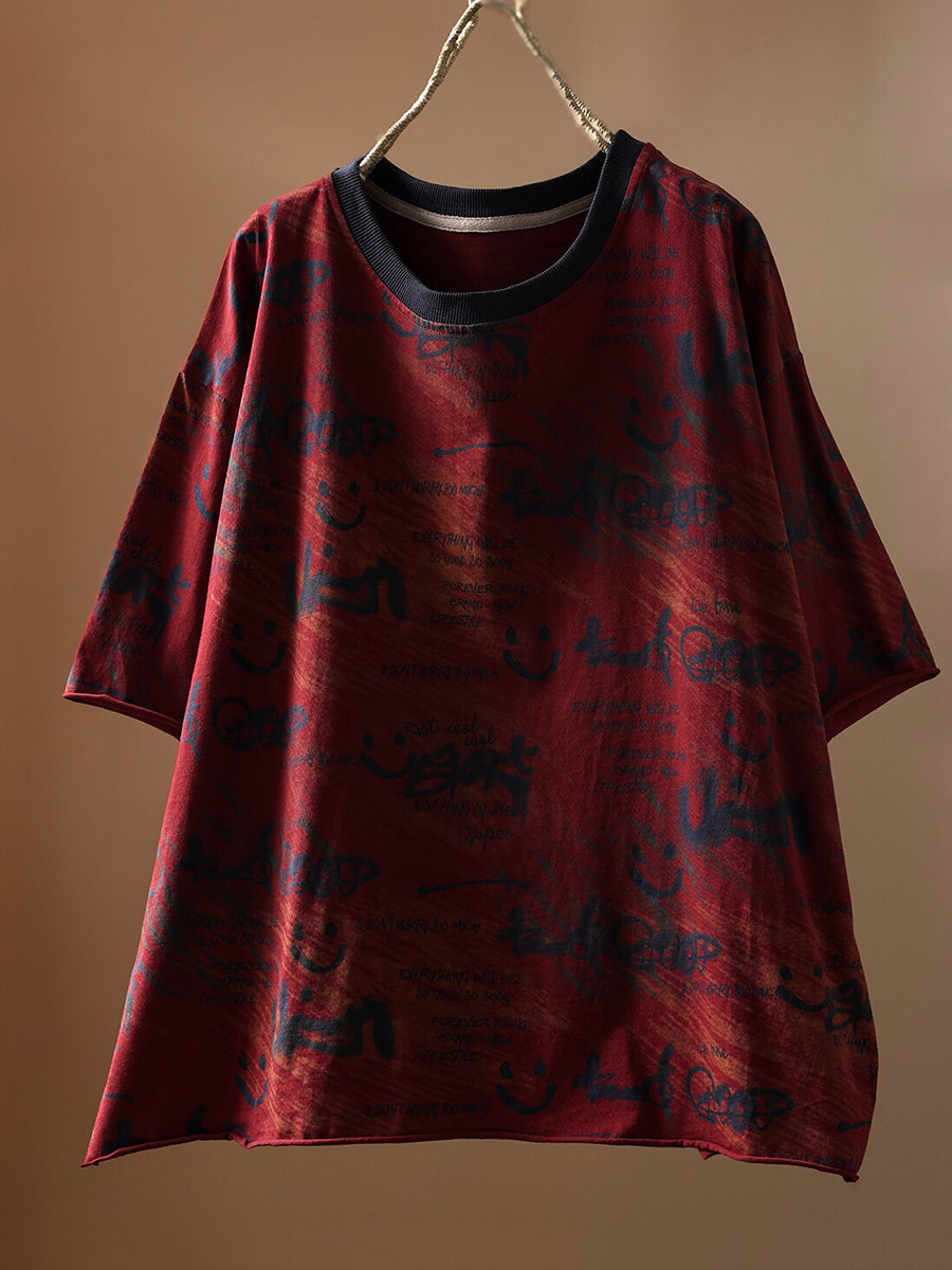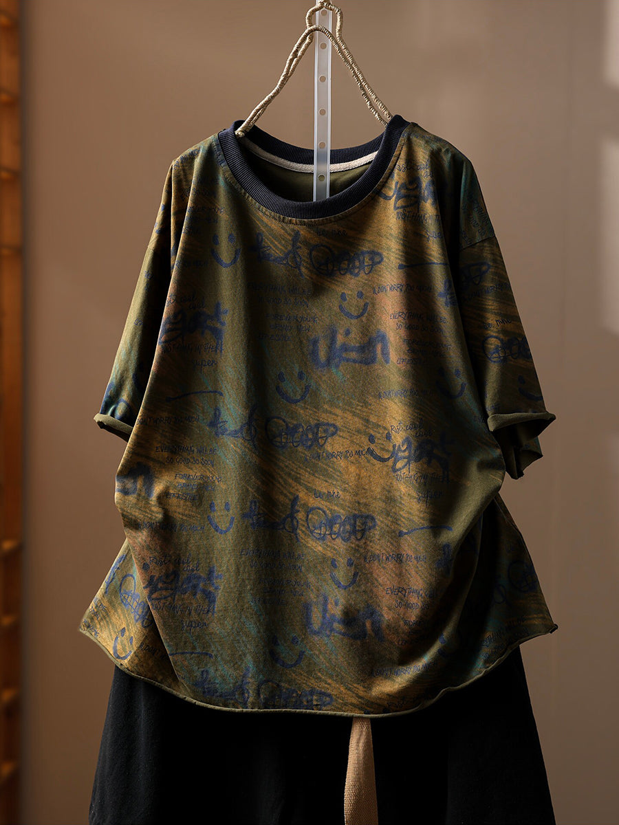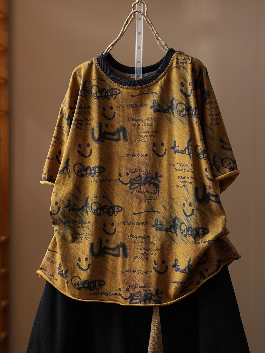 Camiseta de algodón de cuello redondo con estampado artístico y sonrisa para mujer, ideal para el verano.