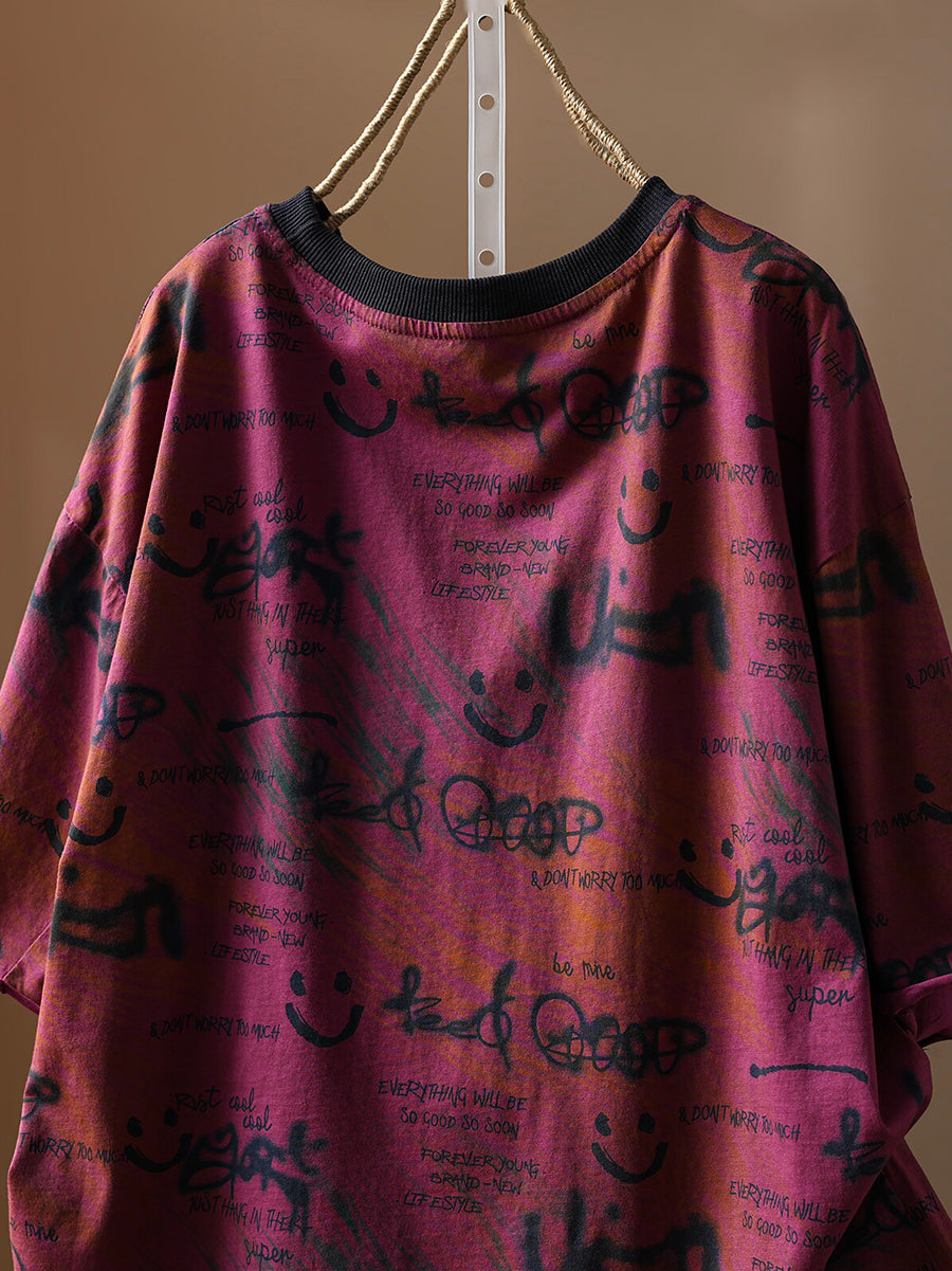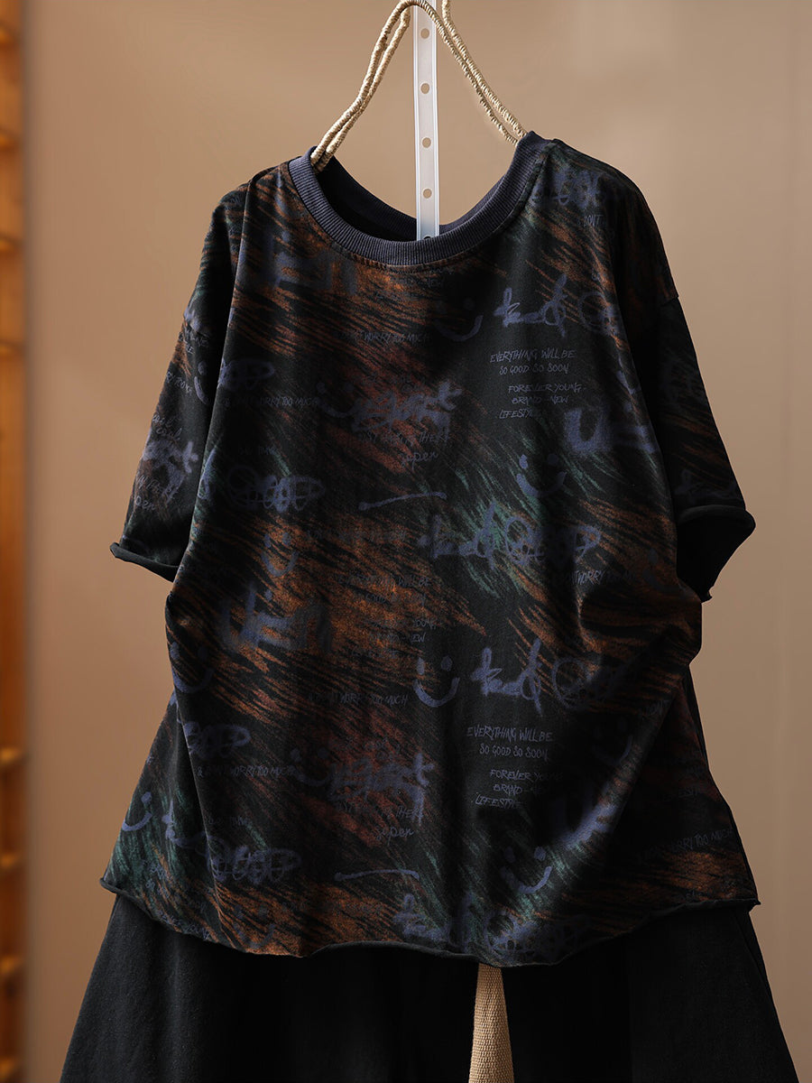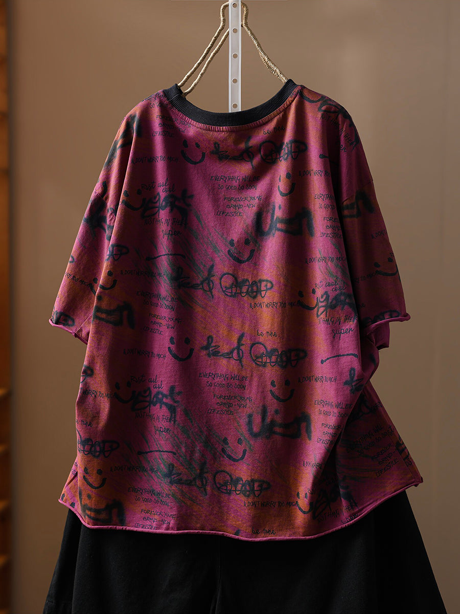 Camiseta de algodón de cuello redondo con estampado artístico y sonrisa para mujer, ideal para el verano.
