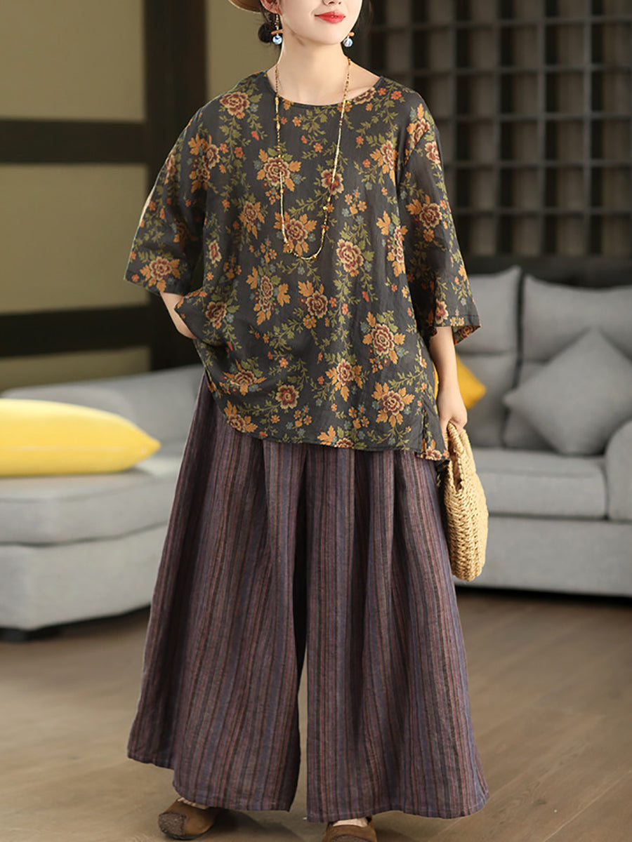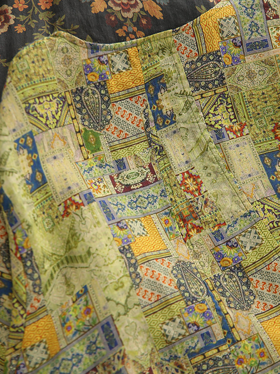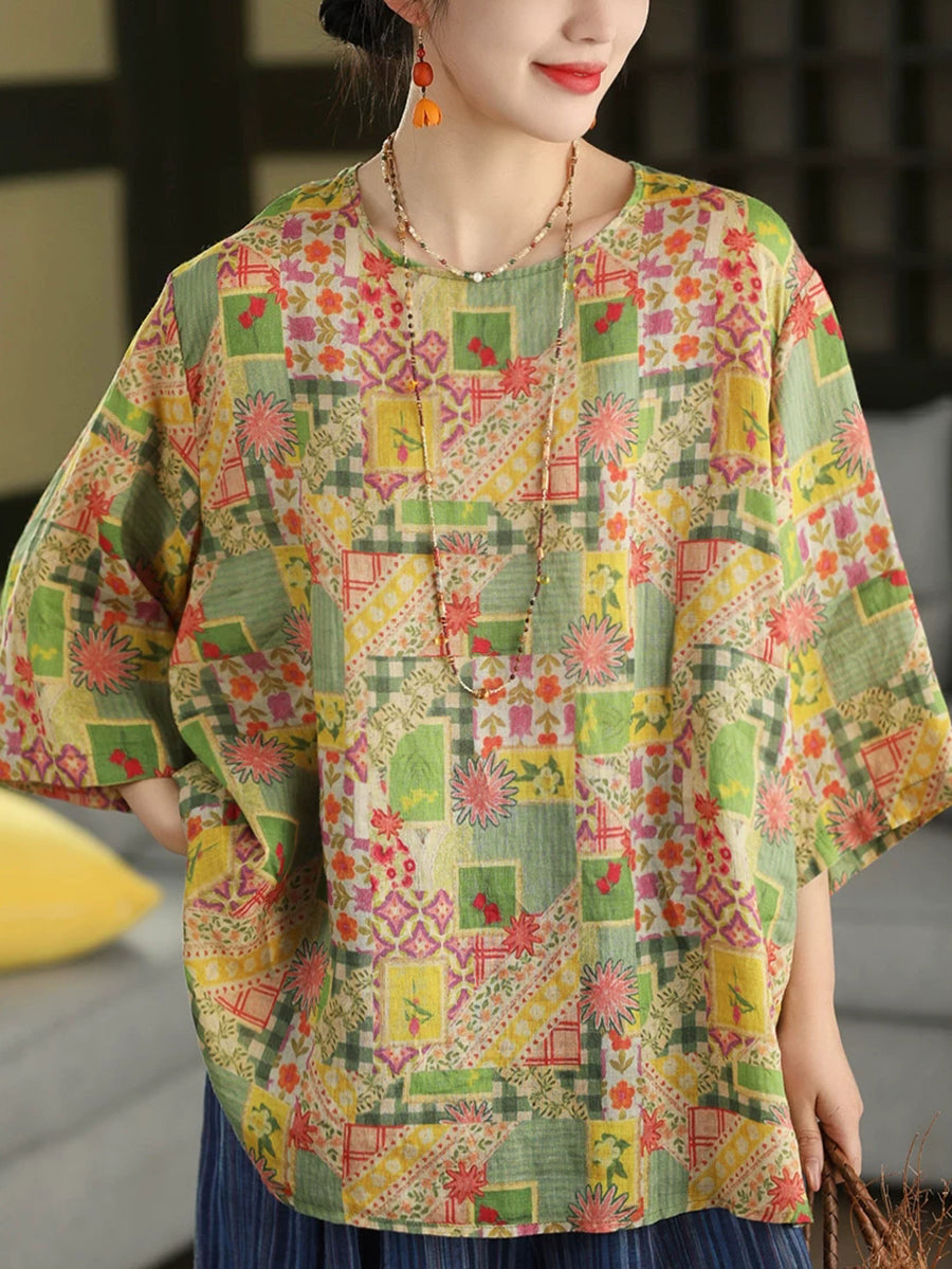 Blusa de verano retro de retazos con cuello redondo 100% ramio para mujer.