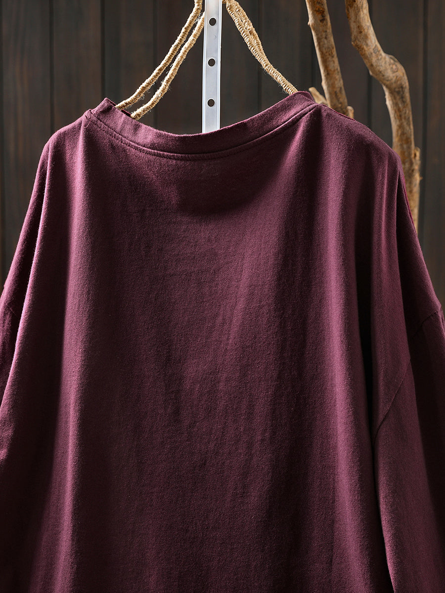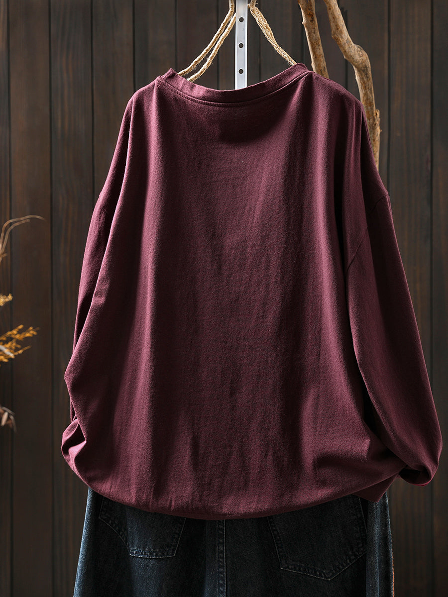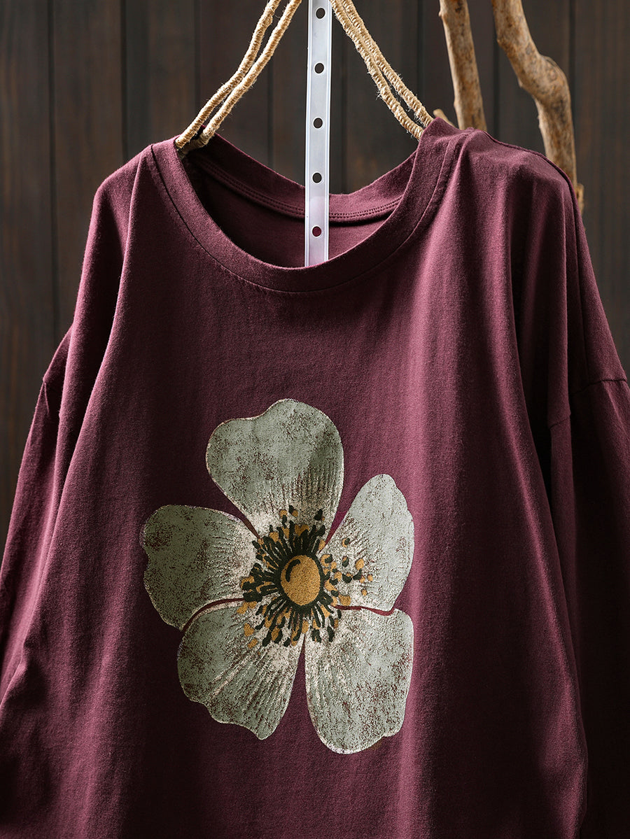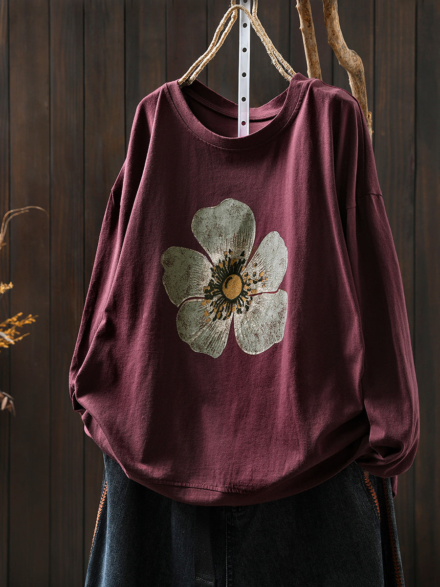 Blusa de algodón con cuello redondo y flores artísticas de otoño para mujer