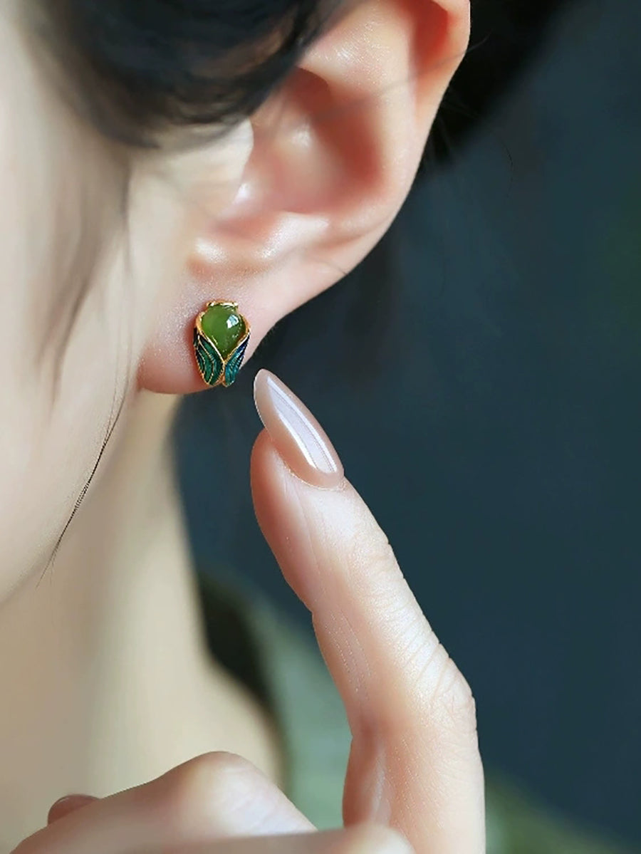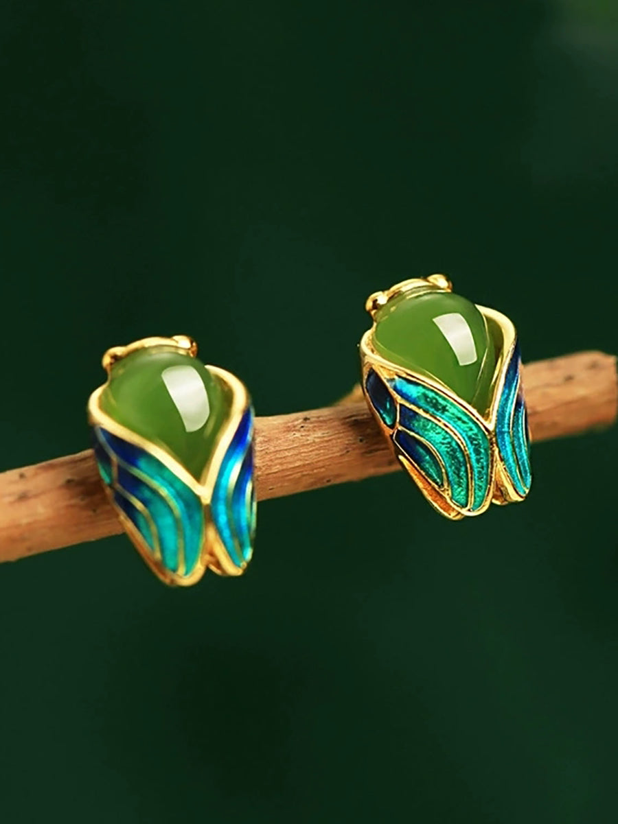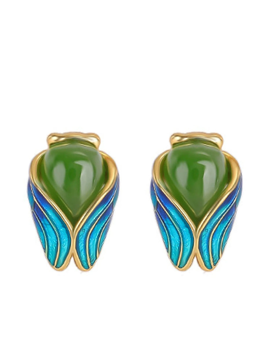 Pendientes étnicos de mujer con esmalte, jade y cigarra dorada con forma de cigarra.
