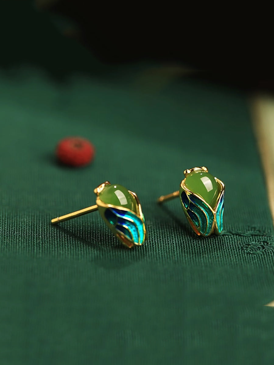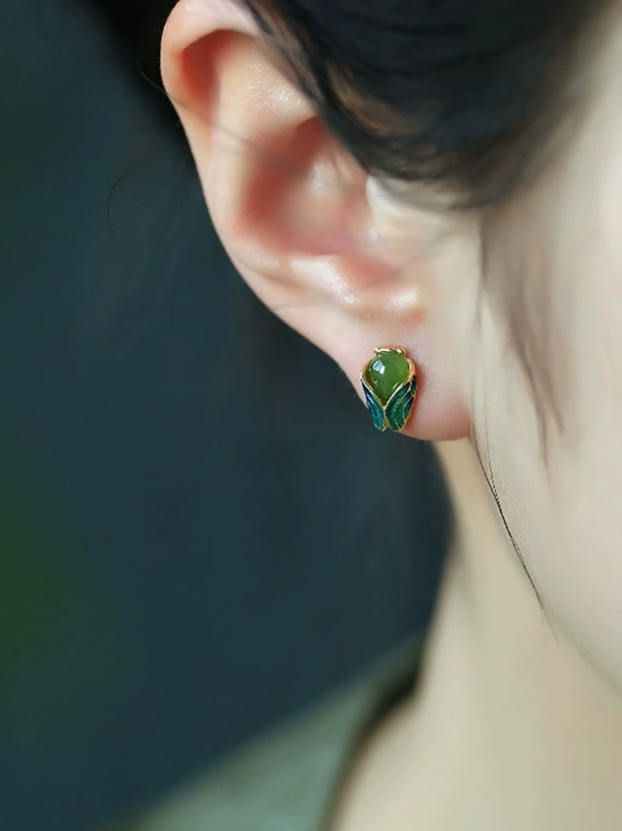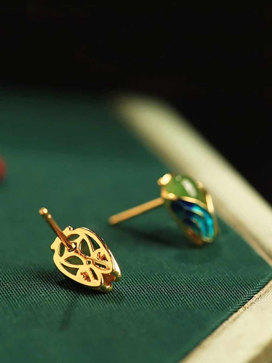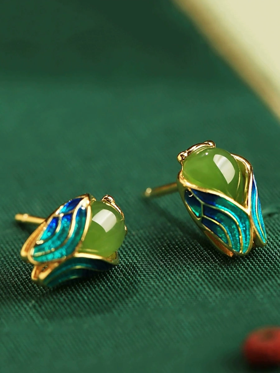 Pendientes étnicos de mujer con esmalte, jade y cigarra dorada con forma de cigarra.