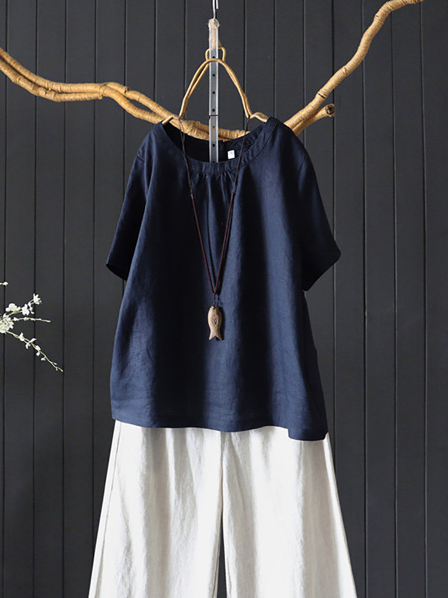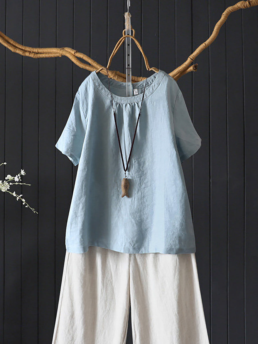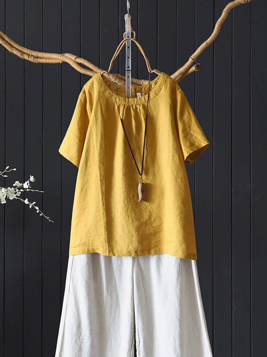 Blusa de mujer de verano, estilo artístico, color liso, 100% lino, cuello redondo.