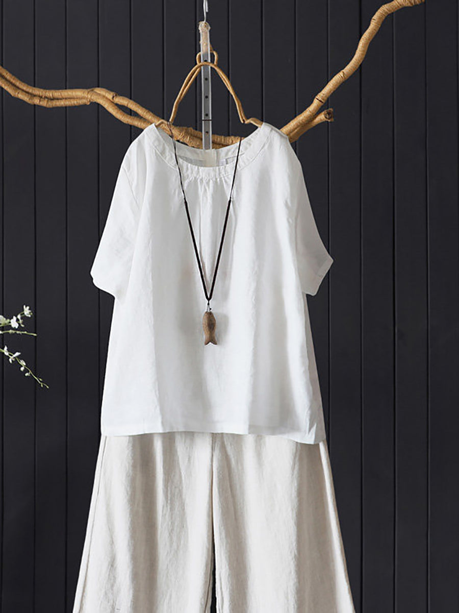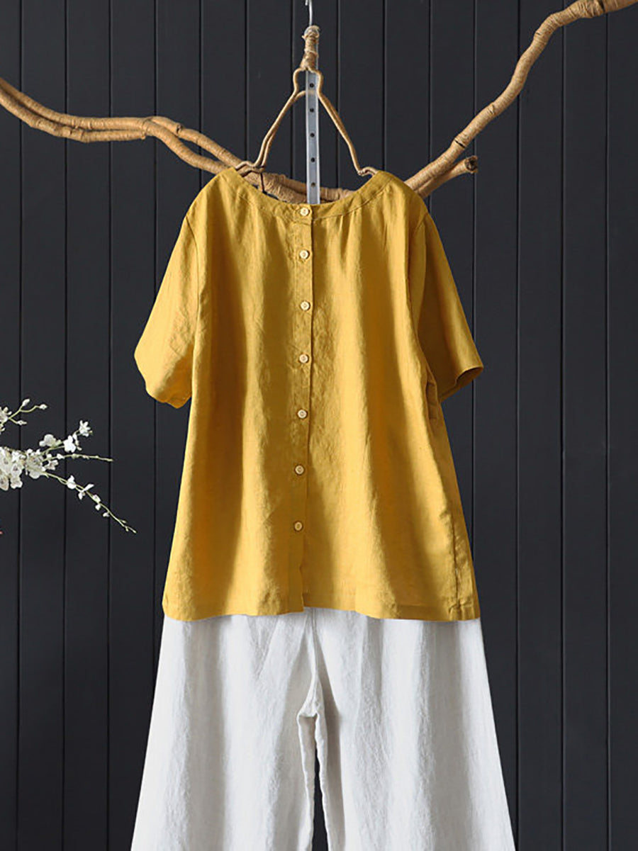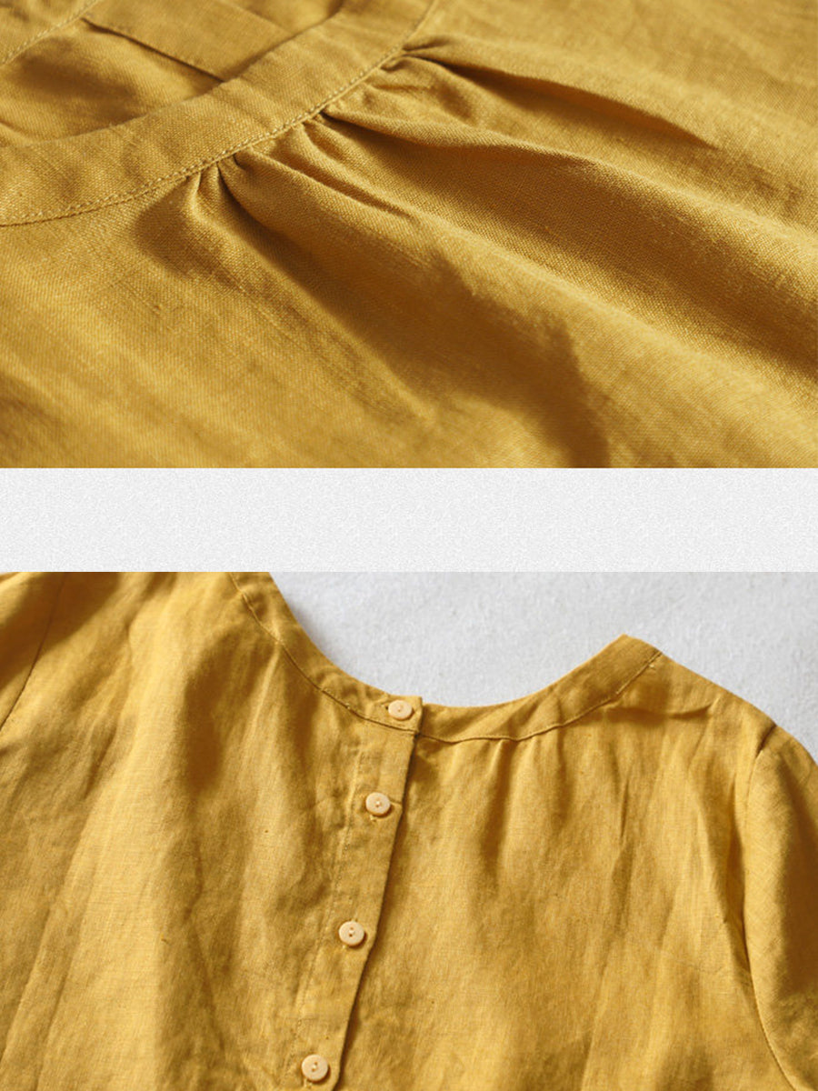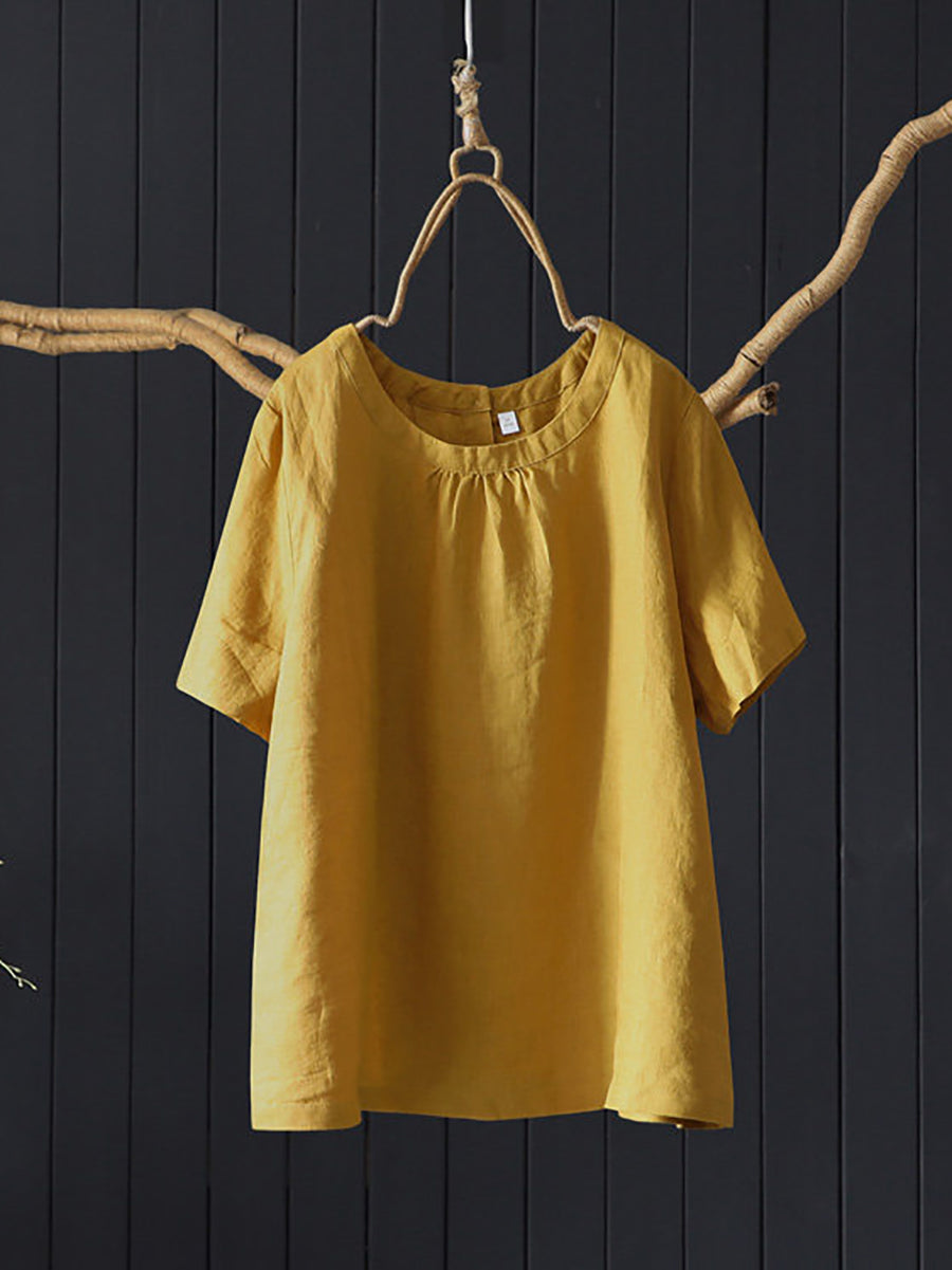Blusa de mujer de verano, estilo artístico, color liso, 100% lino, cuello redondo.