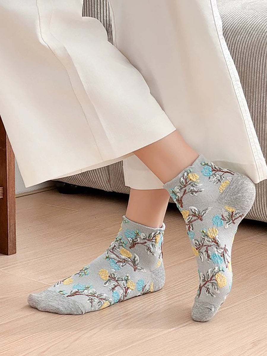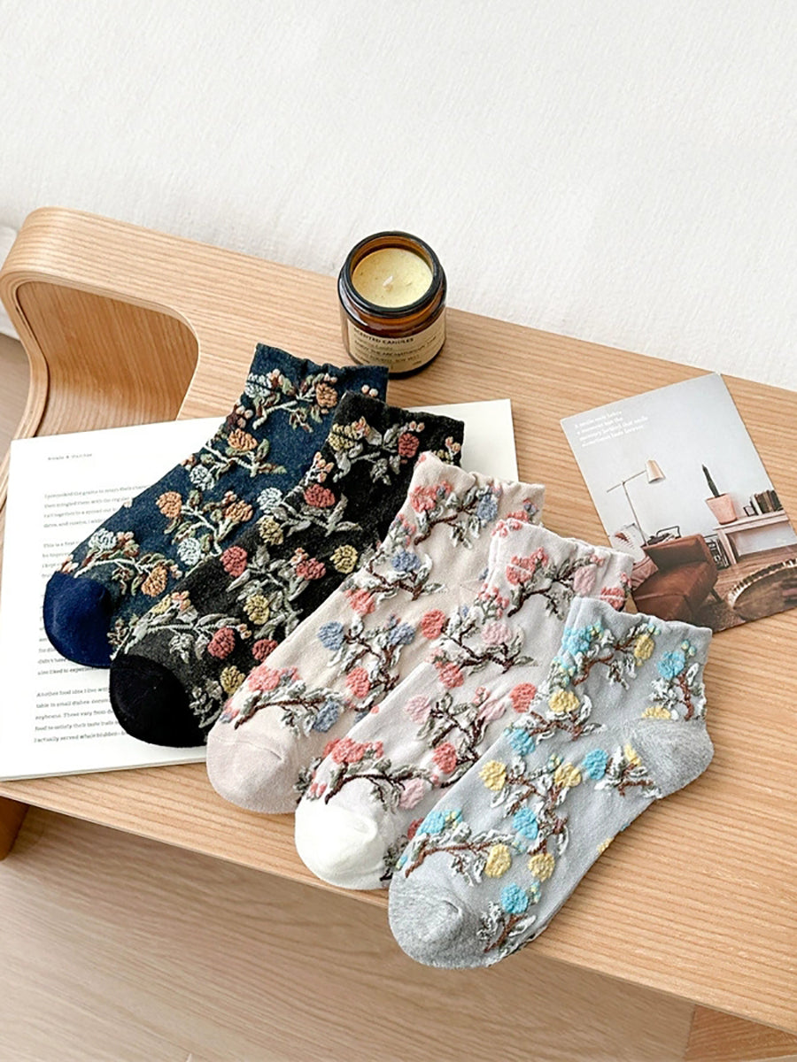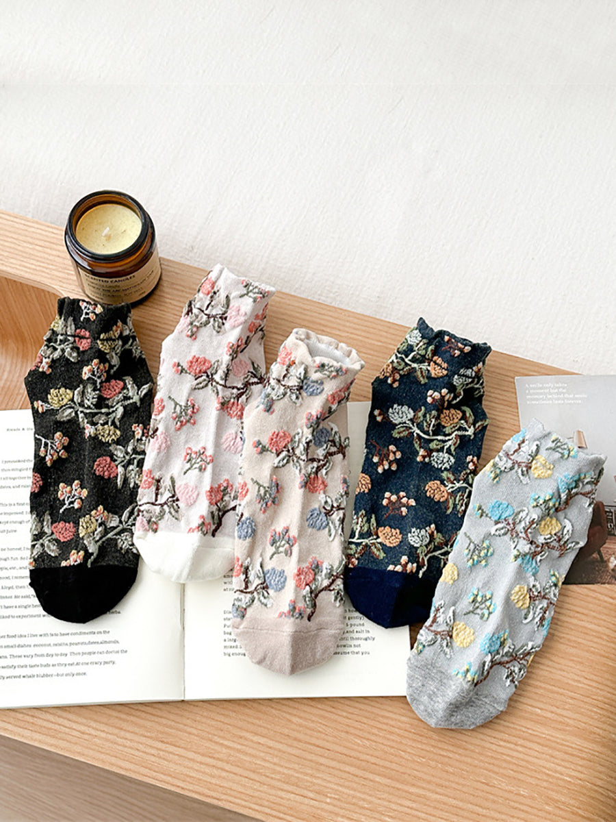 5 pares de calcetines de algodón jacquard con estampado floral artístico para mujer