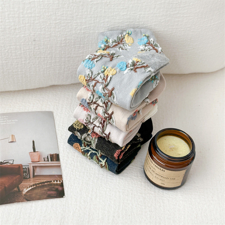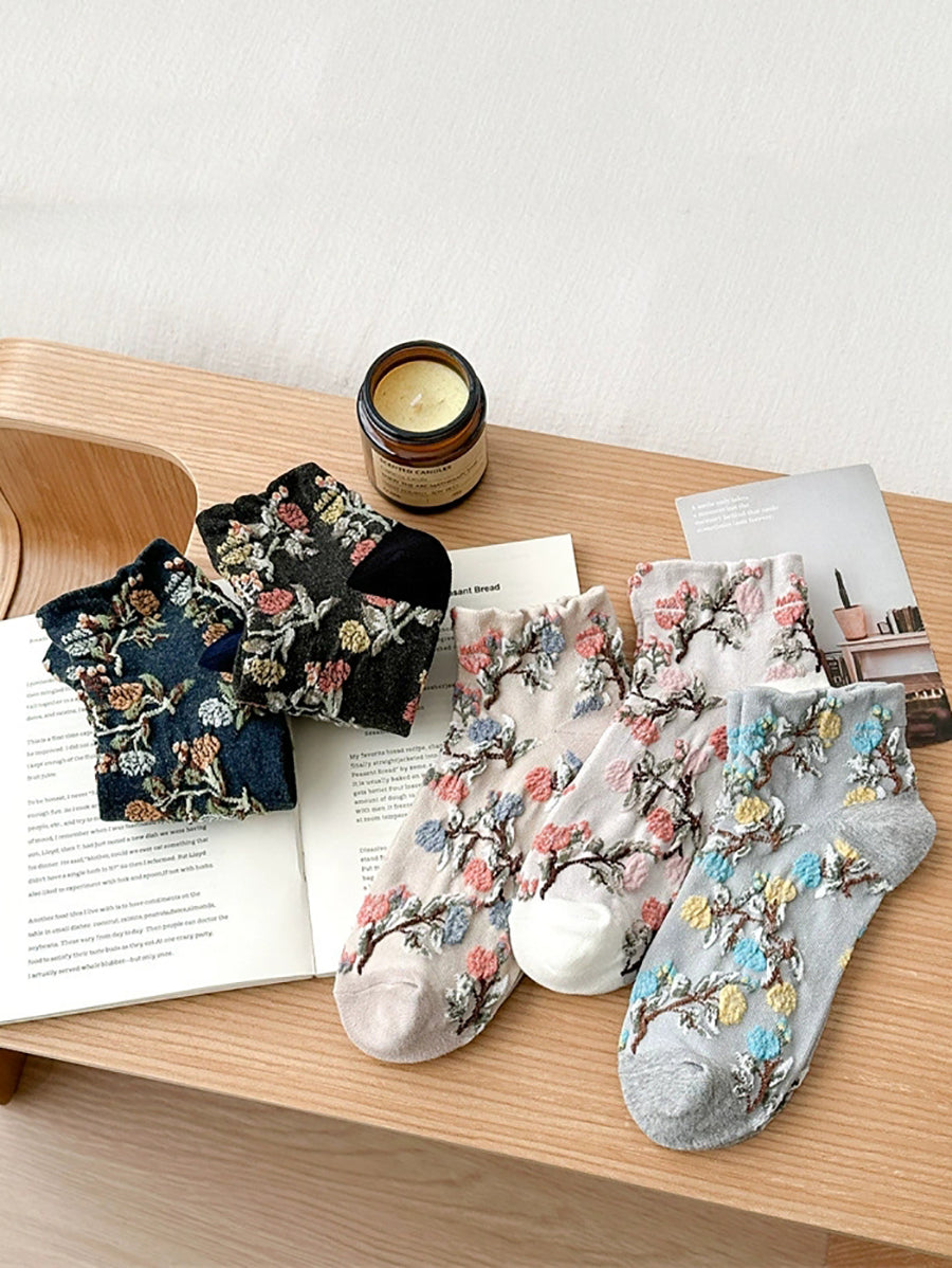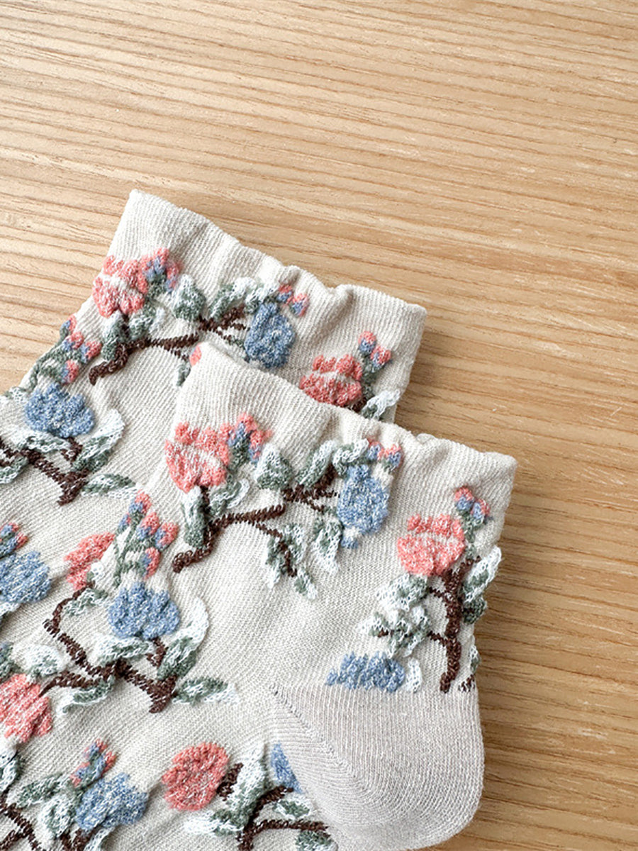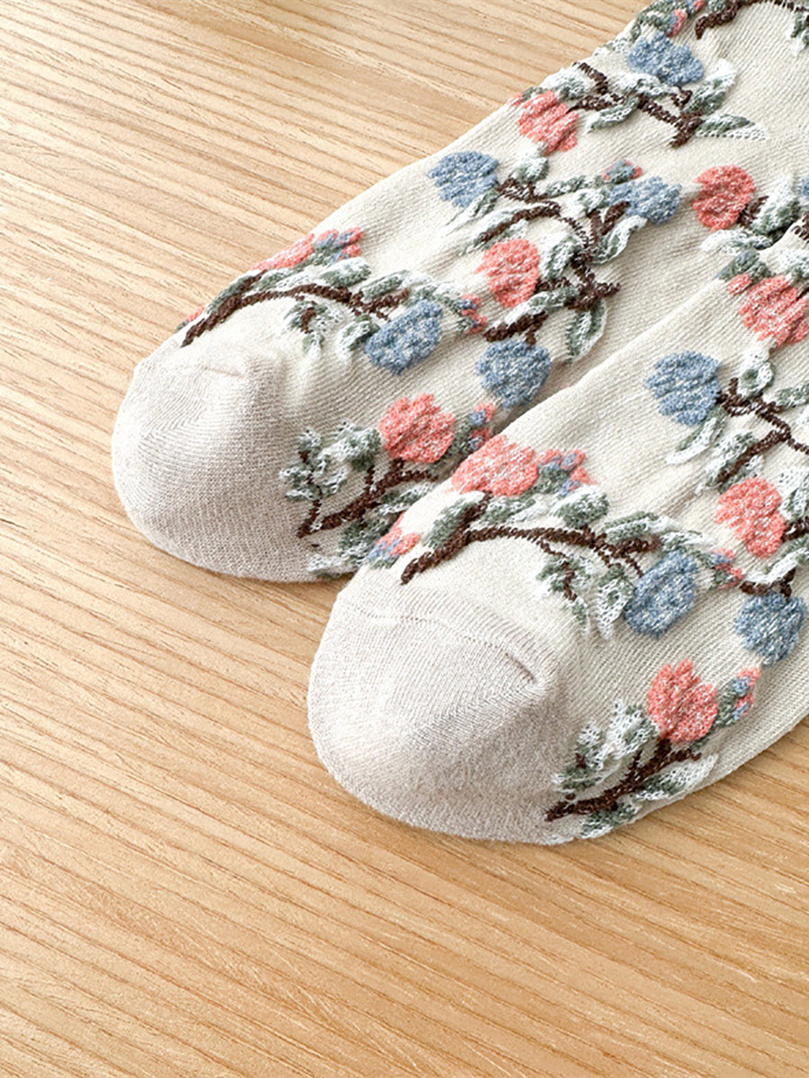 5 pares de calcetines de algodón jacquard con estampado floral artístico para mujer