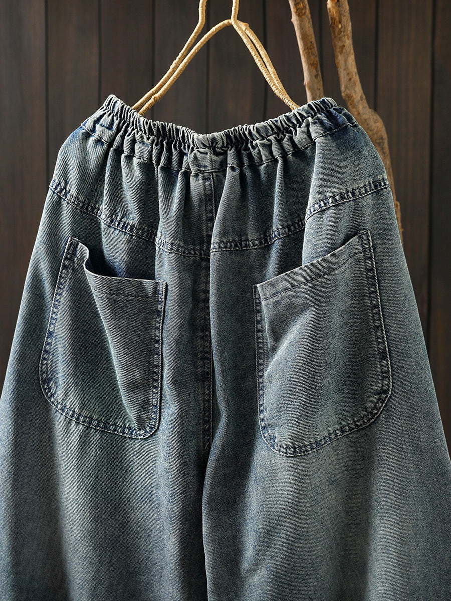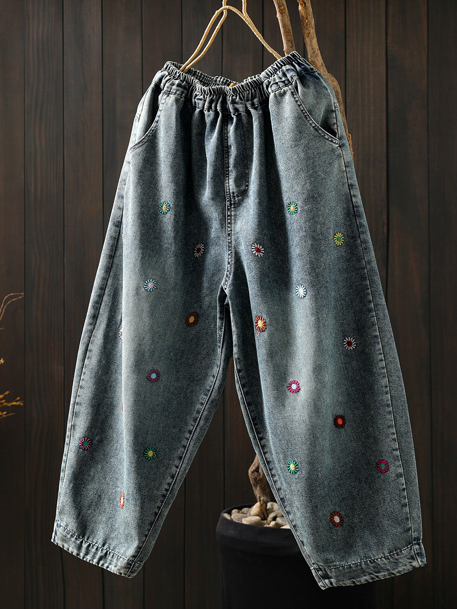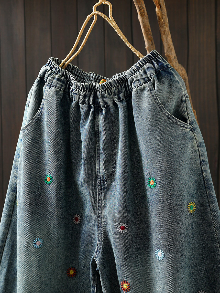 Pantalones harem vaqueros vintage de verano para mujer con bordado floral.
