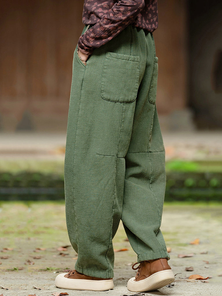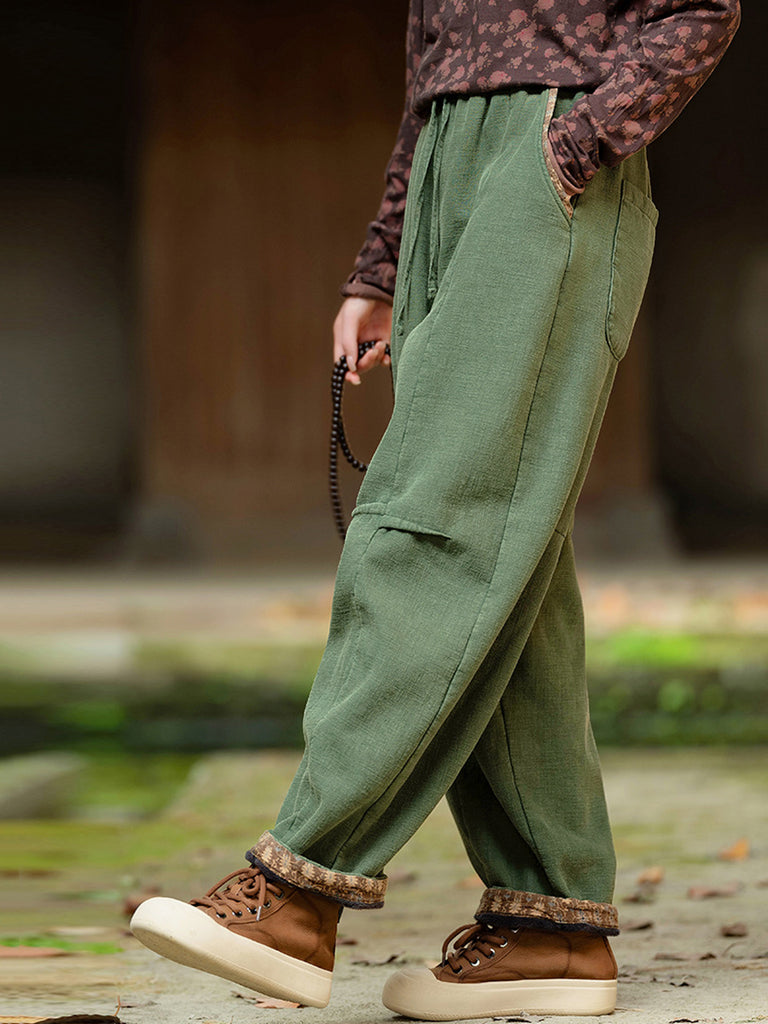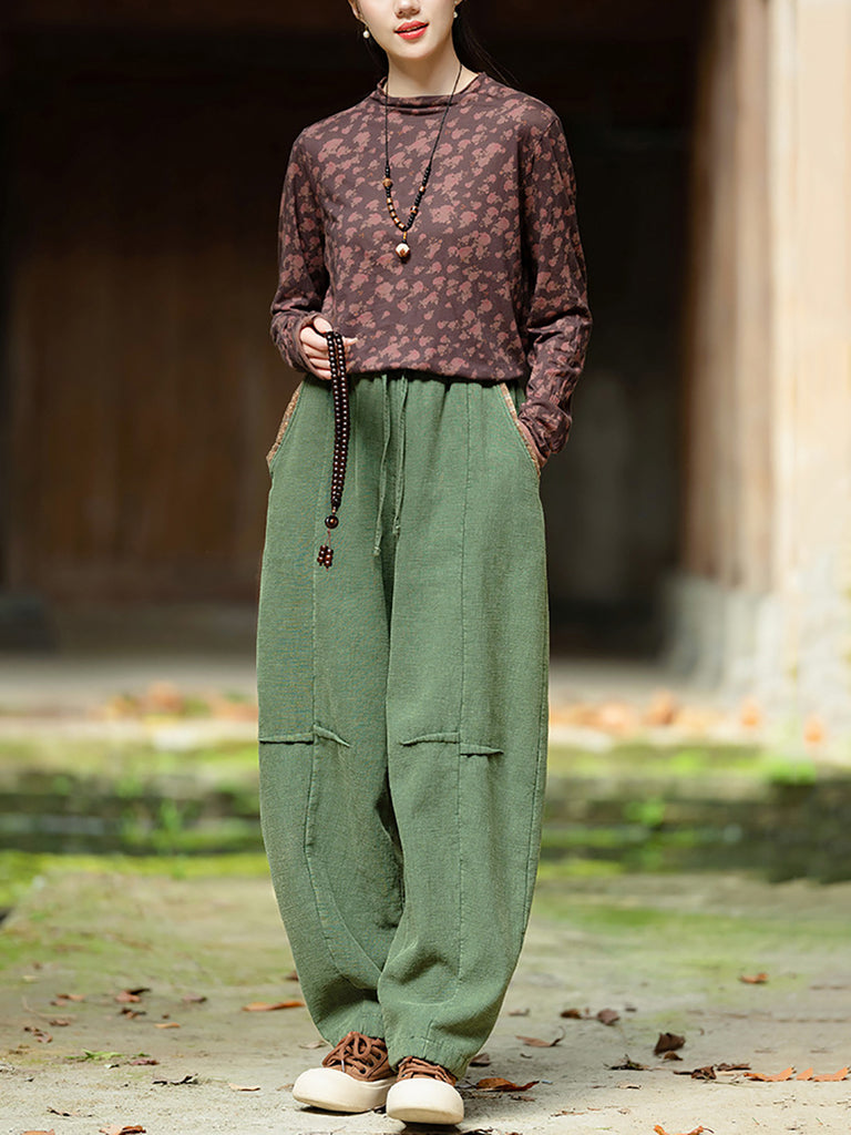 Pantalones anchos de lino y algodón con estampado floral retro de invierno para mujer