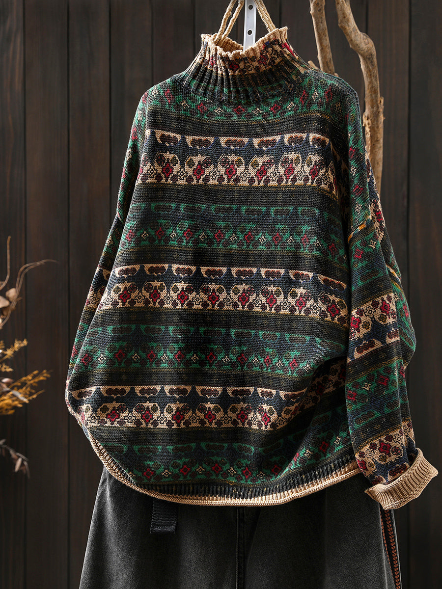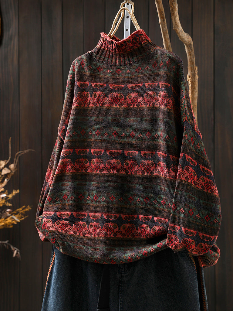 Suéter de cuello alto de algodón a rayas estilo vintage para mujer