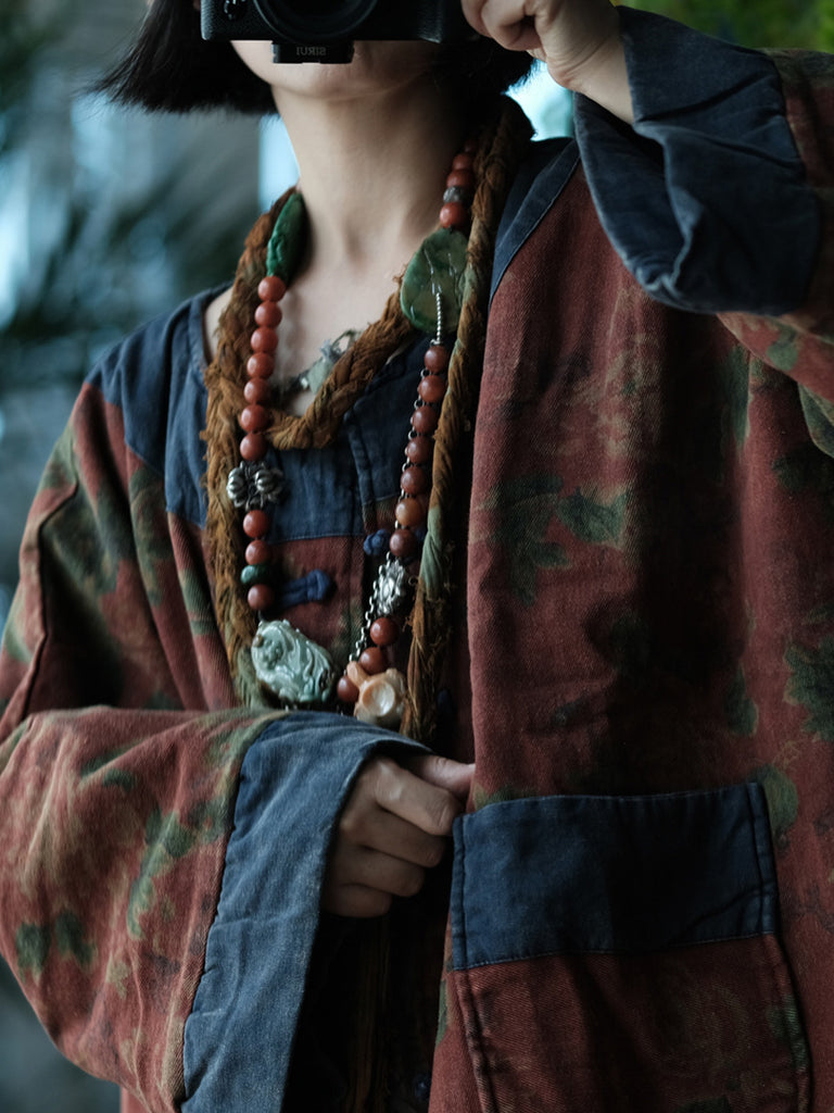 Abrigo acolchado con cuello en V y estampado floral vintage de otoño para mujer
