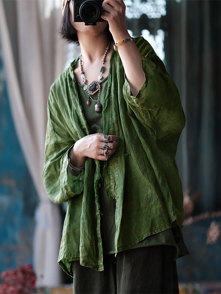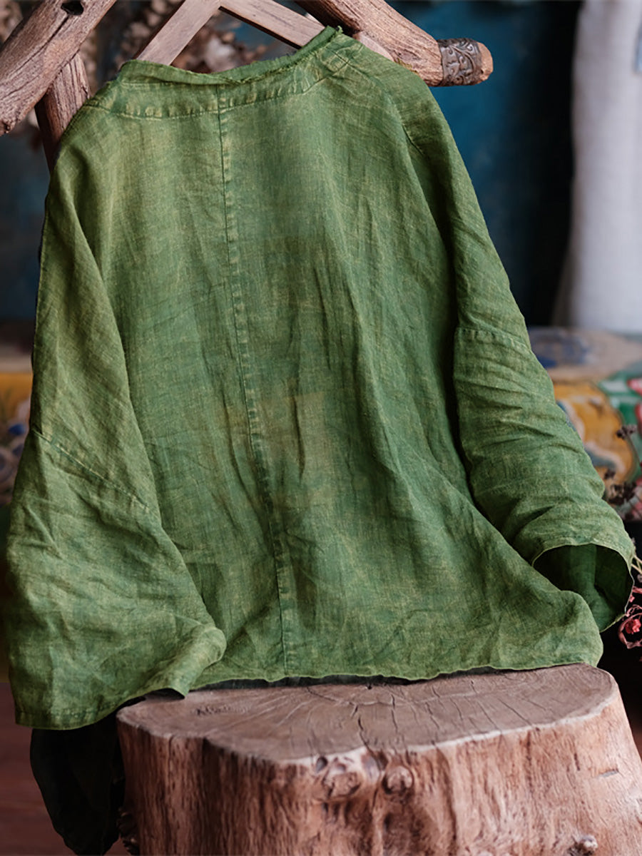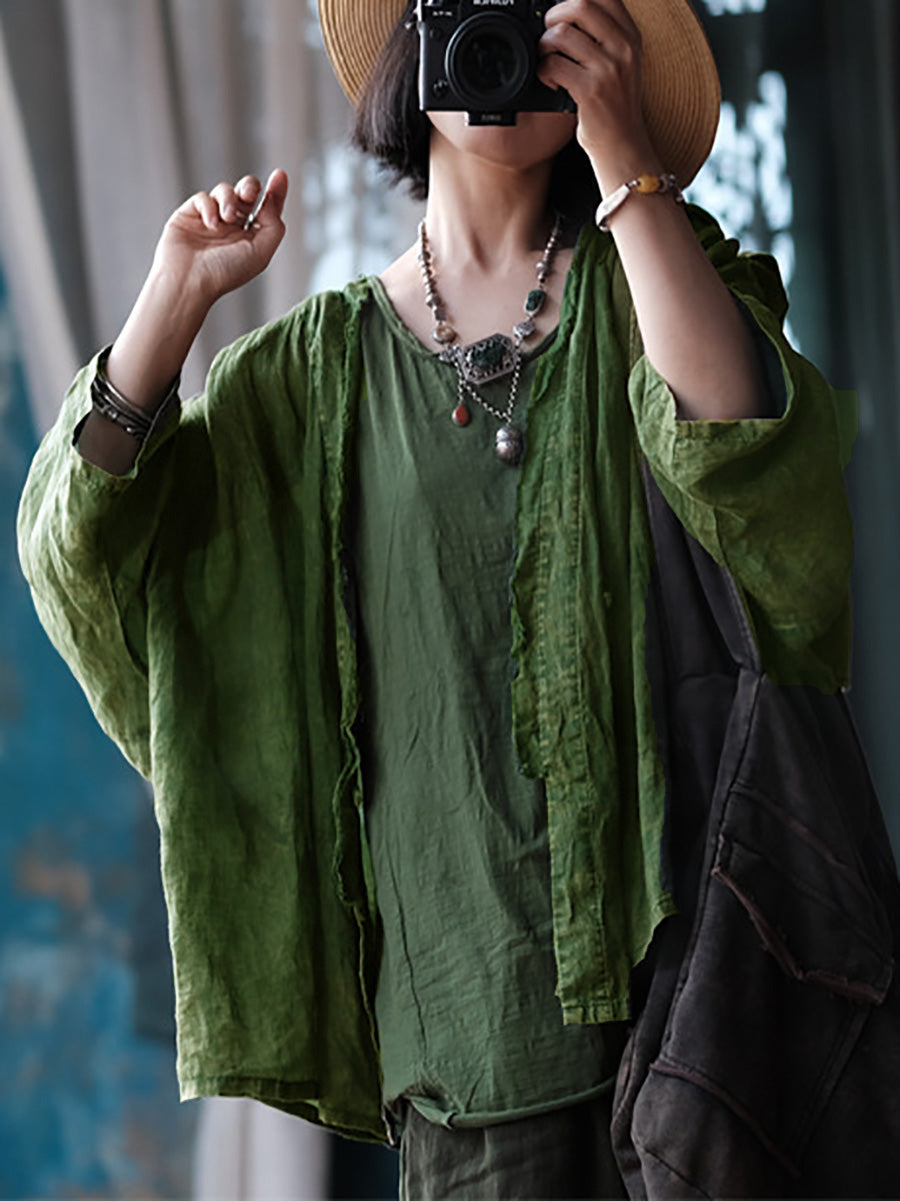 Este abrigo está confeccionado en 100% lino, con un patrón liso y cuello en V. Las mangas raglán largas añaden un toque vintage, lo que lo hace perfecto para las temporadas de primavera y verano.