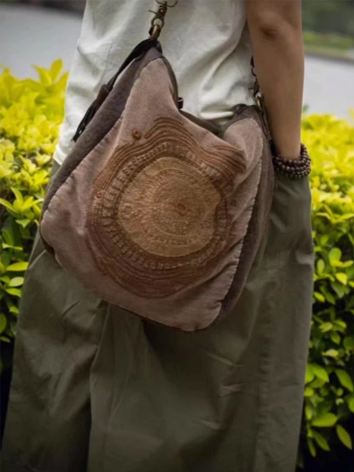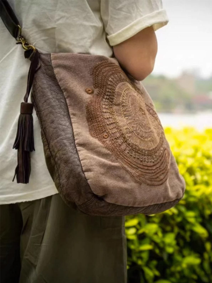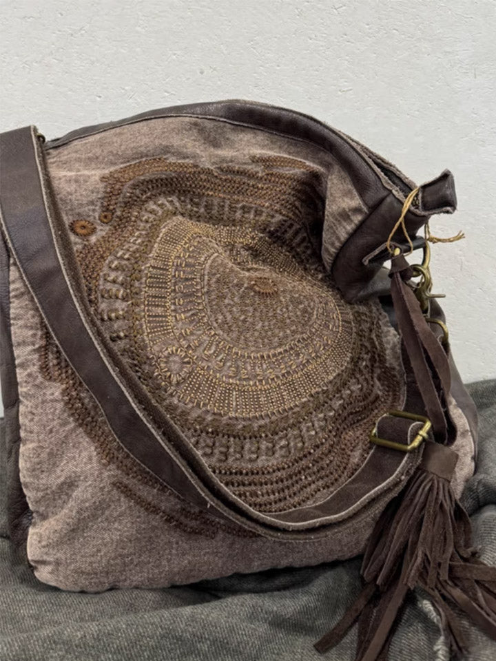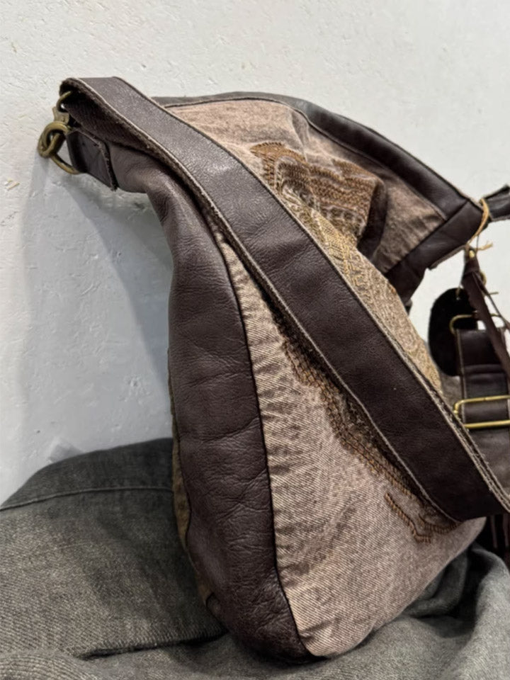 Bolso bandolera vintage de cuero con bordados y detalles combinados, modelo 1105.