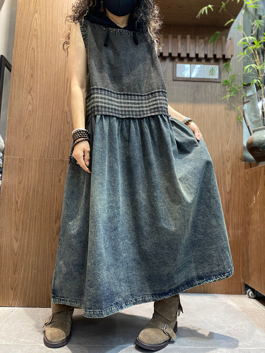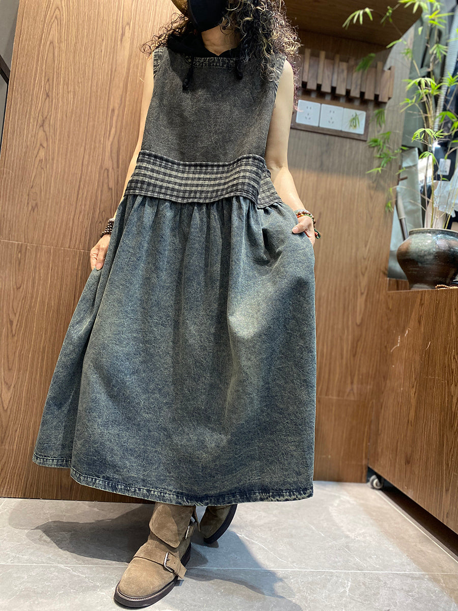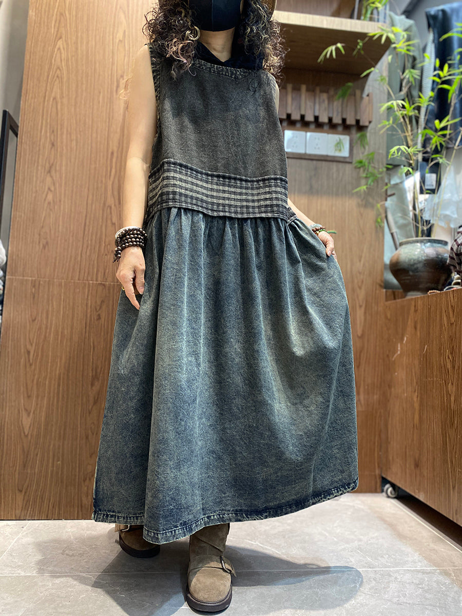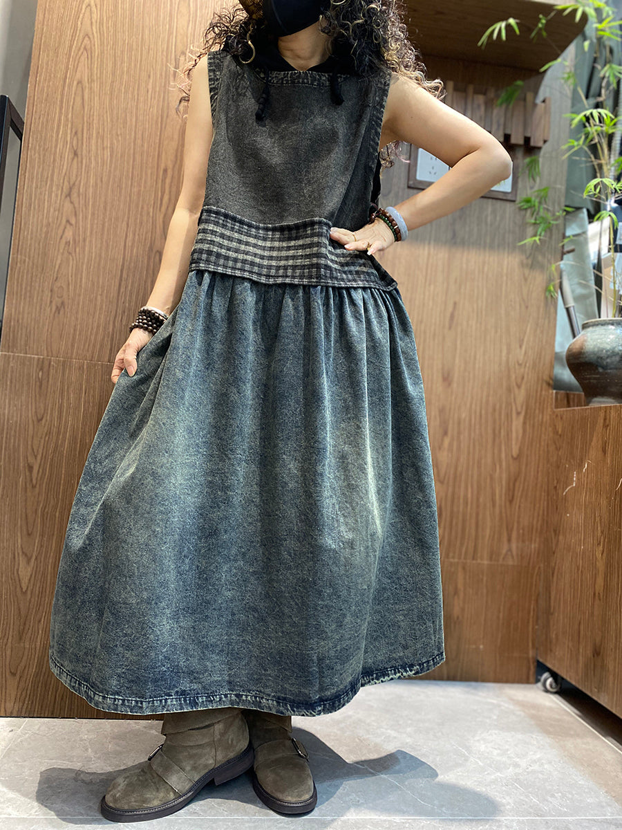 Vestido tipo chaleco de mezclilla vintage de verano para mujer con cuello redondo y empalmado